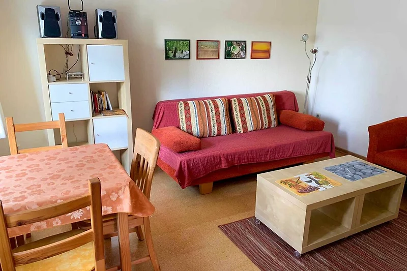 Im Wohnzimmer lässt sich gut ein selbstmitgebrachtes Kinderbett aufstellen. Das Haus ist geeignet für Allergiker (Hausstaub), da es Fliesen und Korkböden hat.