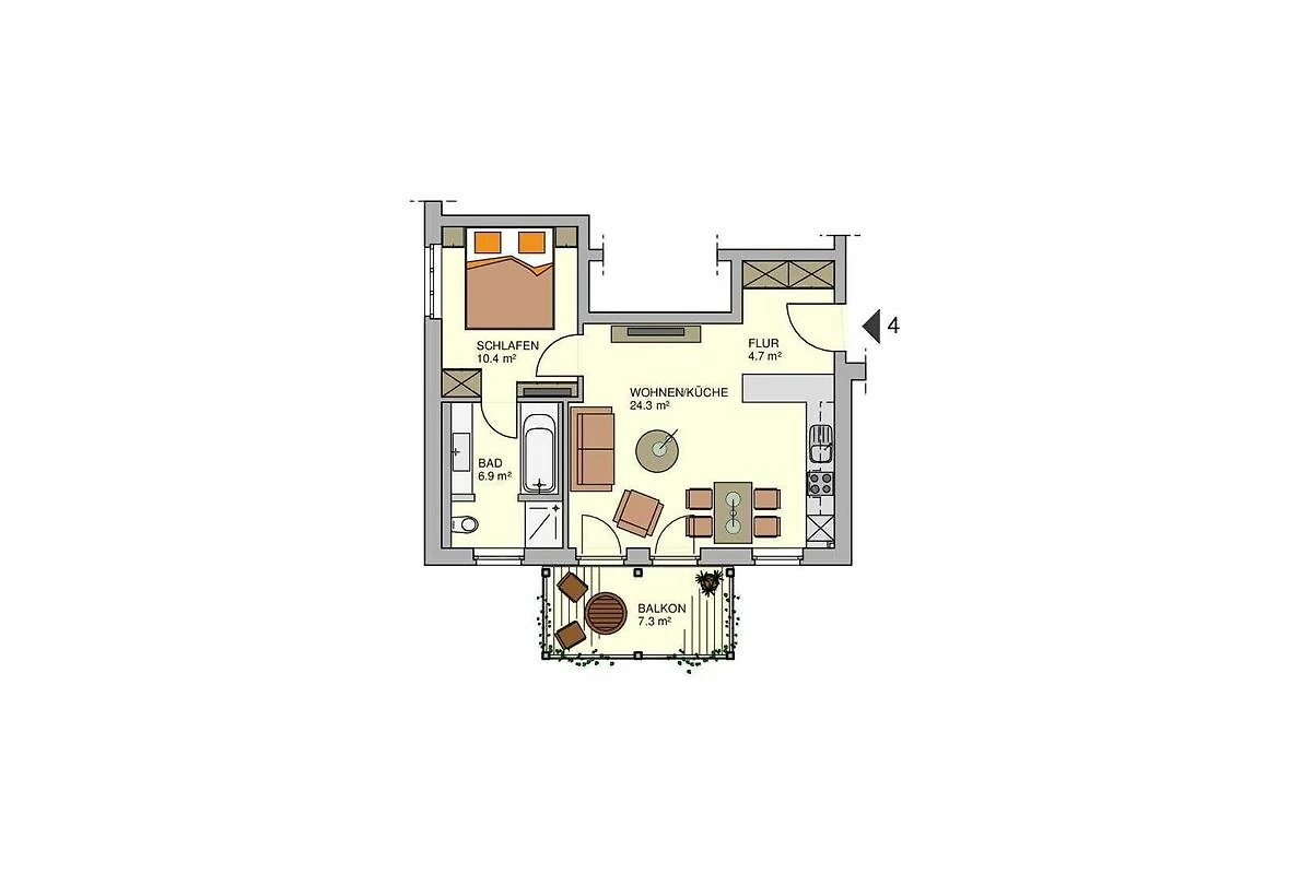 Bei der Ferienwohnung 04 handelt es sich um eine 2-Raum-Ferienwohnung, bestehend aus einem ansprechenden Wohn-/Essbereich mit offen gestalteter Küche, einem Schlafzimmer mit Doppelbett und einem Duschbad.