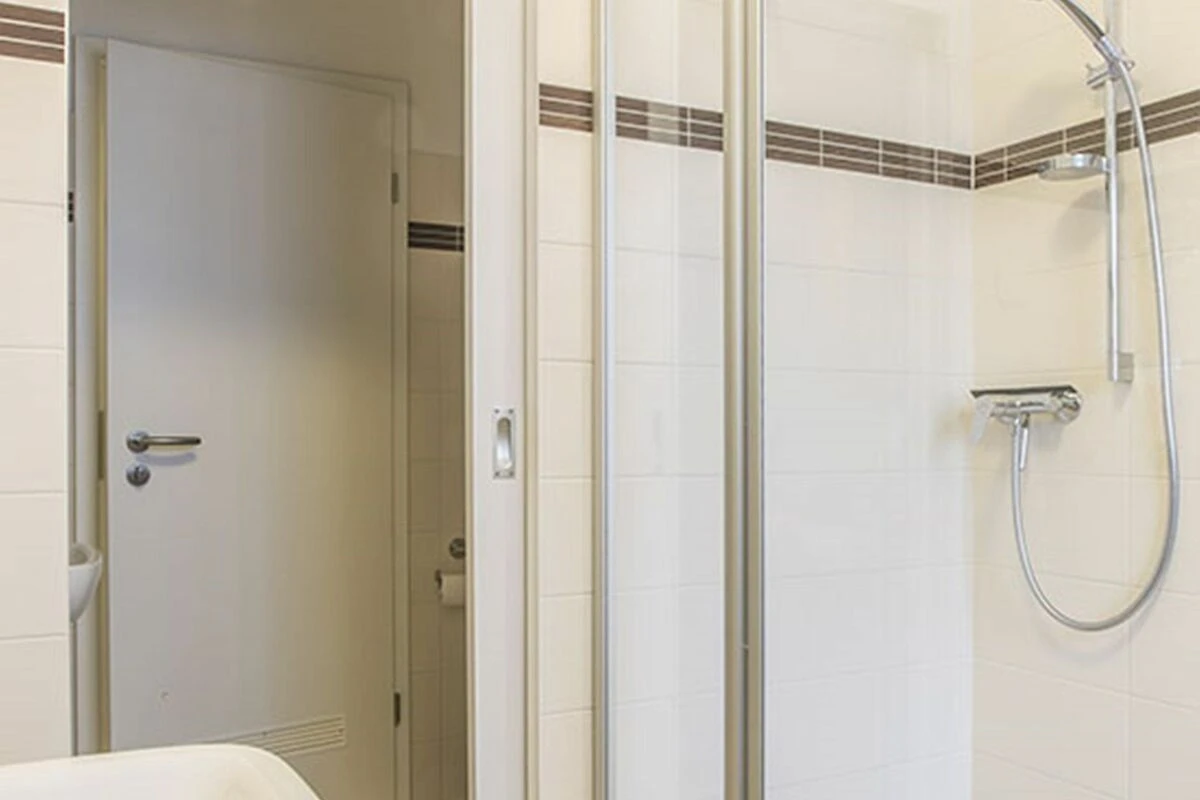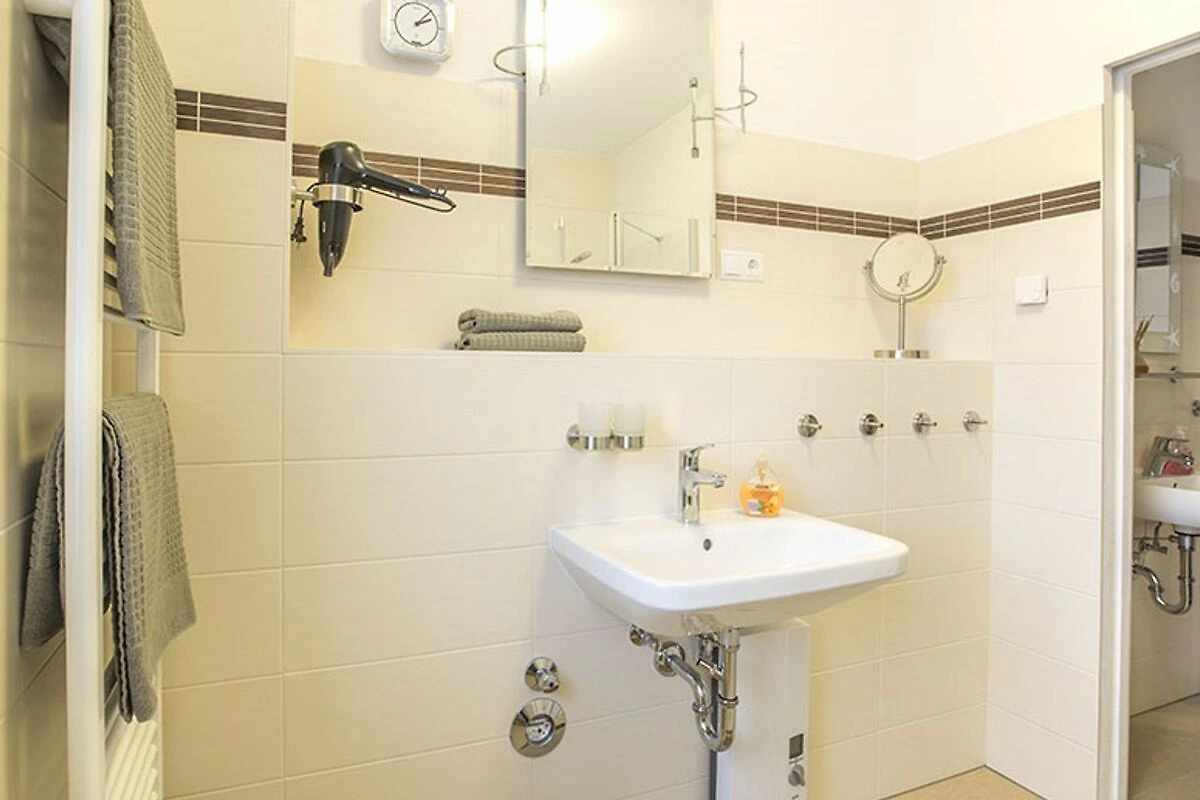 Im Duschbad mit geräumige Glasdusche, Waschplatz, Handtuch-Heizkörper, Waschmaschine und Fön beginnen oder beenden Sie Ihren Tag auf angenehmste Weise. Das separate WC mit Waschbecken ist vom Eingangsbereich sowie vom Duschbad aus begehbar.