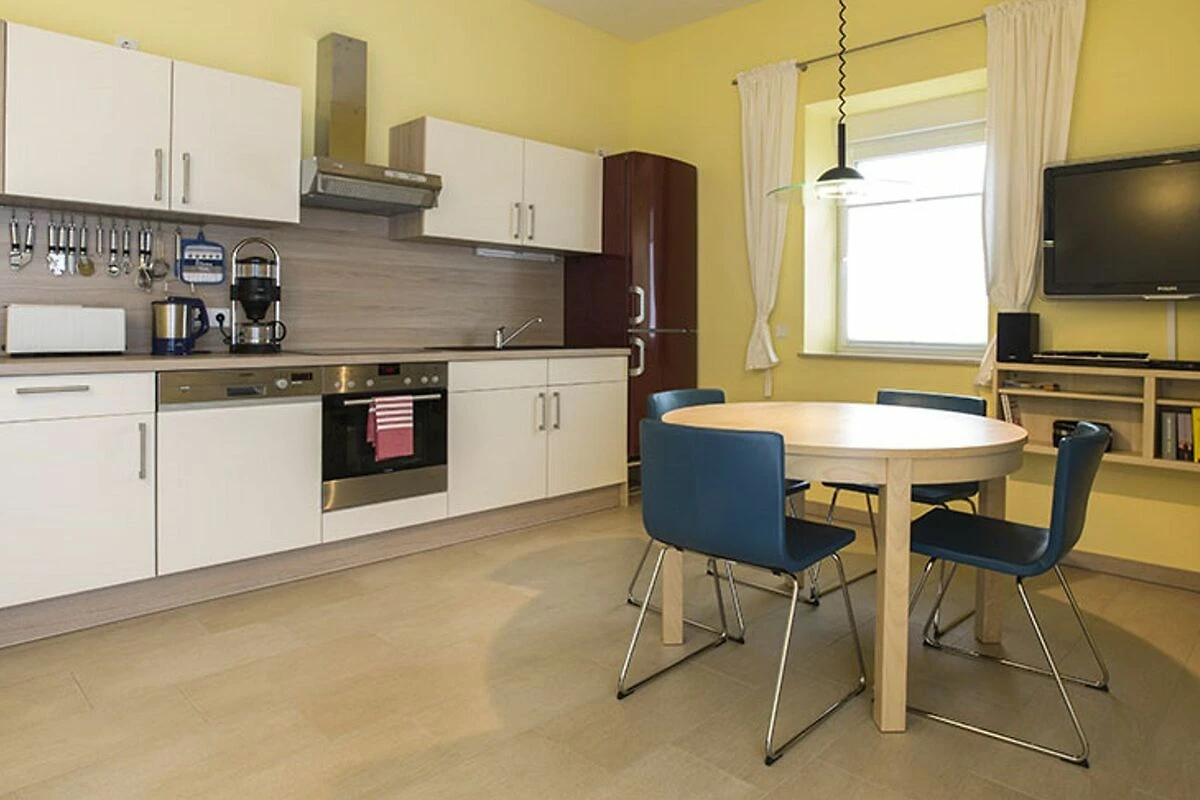 Die moderne Einbauküche ist ausgestattet mit einem Einbauherd mit Ceranfeld und einem Geschirrspüler von Siemens, einem Kühlschrank inklusive Gefrierfach von Gorenje, Kaffeemaschine, Wasserkocher, Toaster und selbstverständlich ausreichend Geschirr und Besteck. Am Esstisch können bequem 4 Personen Platz nehmen.