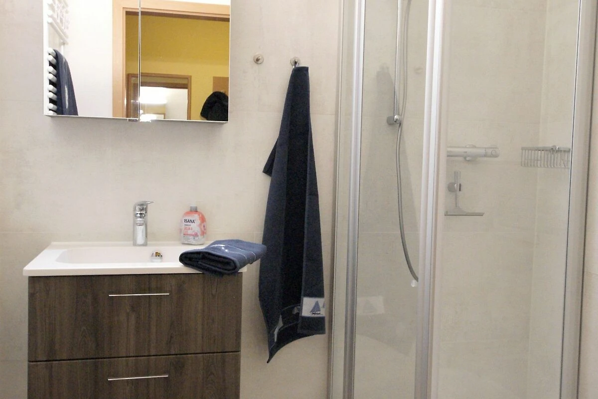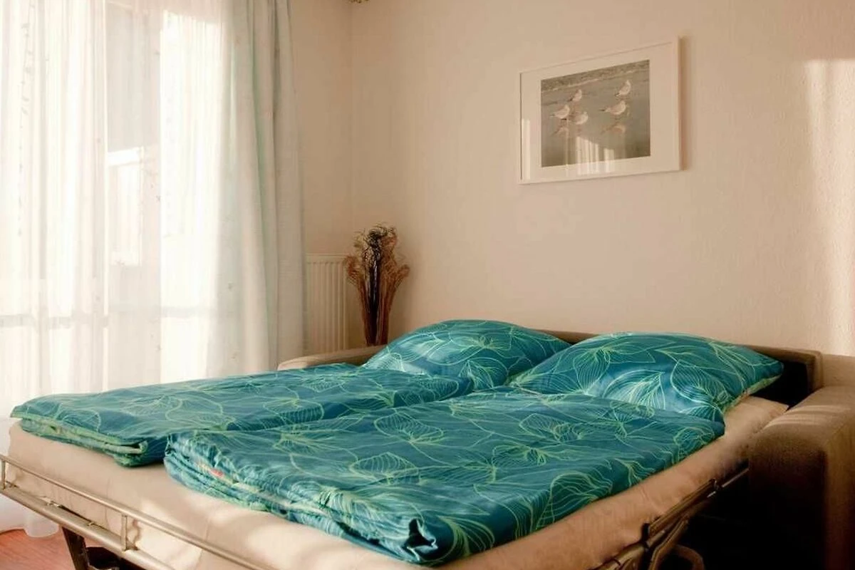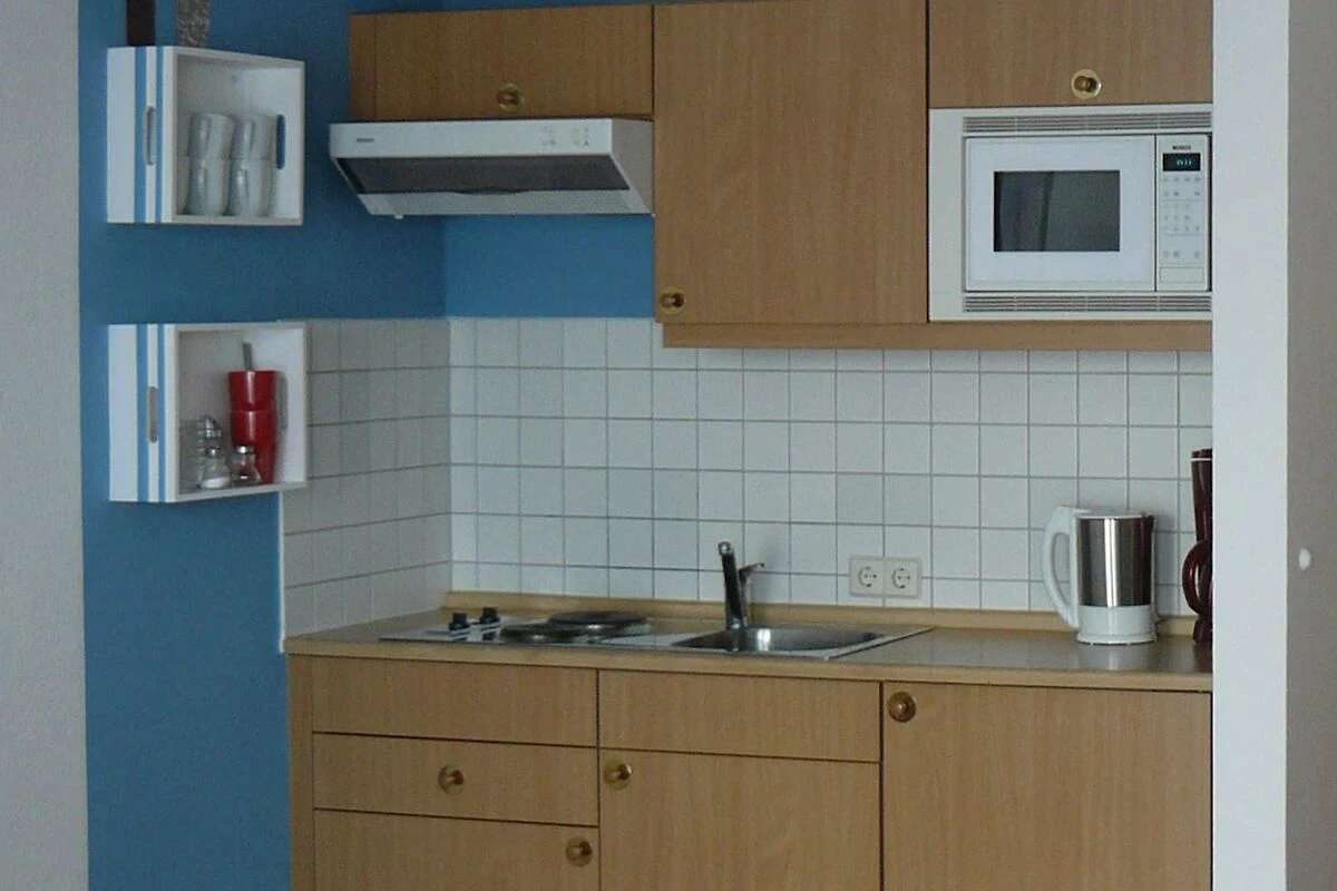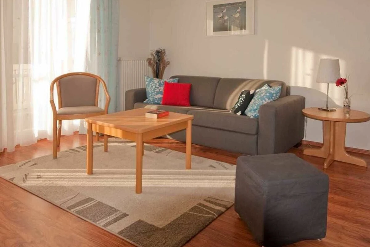 Das sehr schöne 2-Zimmer-Appartment für bis zu 4 Personen bietet auf 47 qm ein helles Wohn- Esszimmer mit offener Küchenzeile (inkl. Herd, Kühlschrank und Mikrowelle) mit einem grossen Süd-West-Balkon. Hier stehen Ihnen ein Flat-TV mit DVD-Player und ein CD/Radio zur Verfügung.