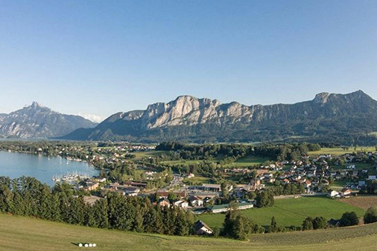 Unser Bauernhof liegt auf einer Anhöhe mit einem Ausblick auf den Mondsee und die wunderschöne Gebirgskulisse.