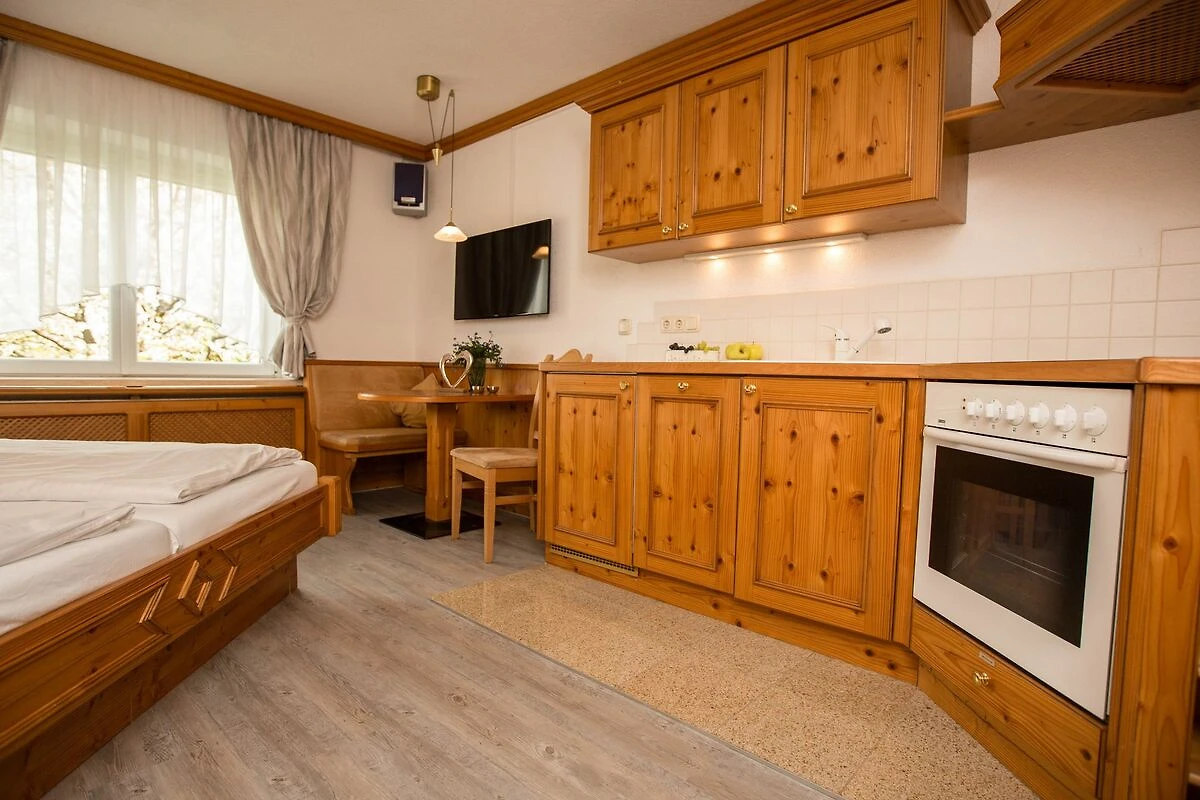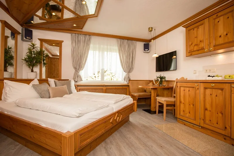 Eine romantische Atmosphäre erwartet Sie in dieser Ferienwohnung auf 22 m² mit einem Doppelbett, das mit Spiegel- und Lichtdecke ausgestattet ist. Die gemütliche Sitzecke sowie der nett gestaltete Küchenbereich versprüht einen heimeligen Charakter. Weiters W-Lan Anschluss, Flat-Screen-TV, Klimaanlage, Safe und Stereoanlage. Der Küchenbereich ist mit Kühlschrank und Gefrierfach, Backofen, Ceranfeld, Kaffeemaschine, Wasserkocher und Toaster ausgestattet. Badezimmer mit Du, Waschbecken, WC und Fön. Ein Blick aus dem Fenster zeigt die Natur - den Garten in Richtung Osten. Buchbar auch mit Frühstücksbuffet.