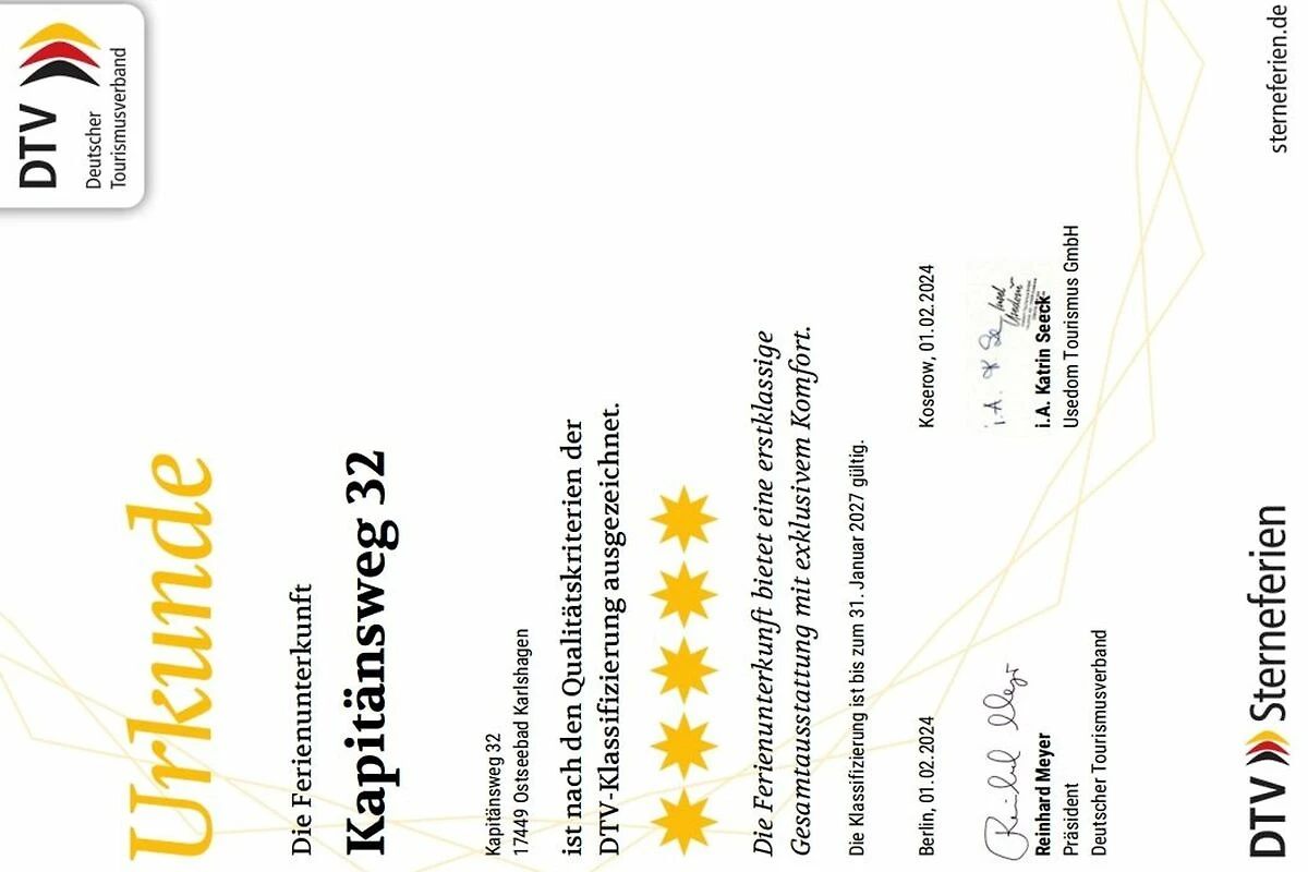 Das Ferienhaus wurde vom Deutschen Tourismusverband mit 5 Sternen ausgezeichnet.