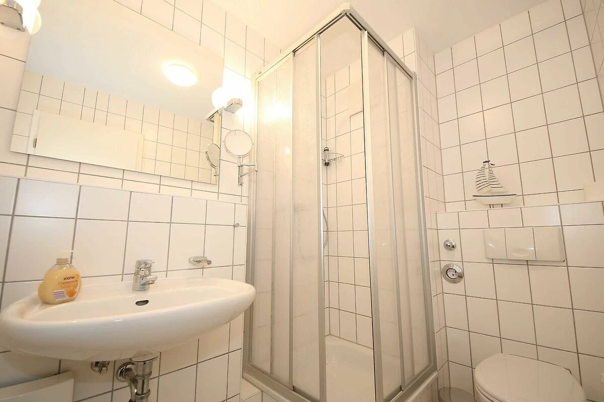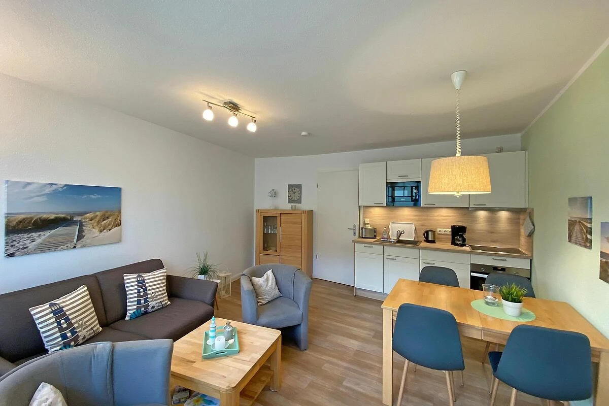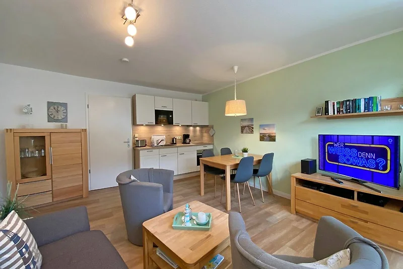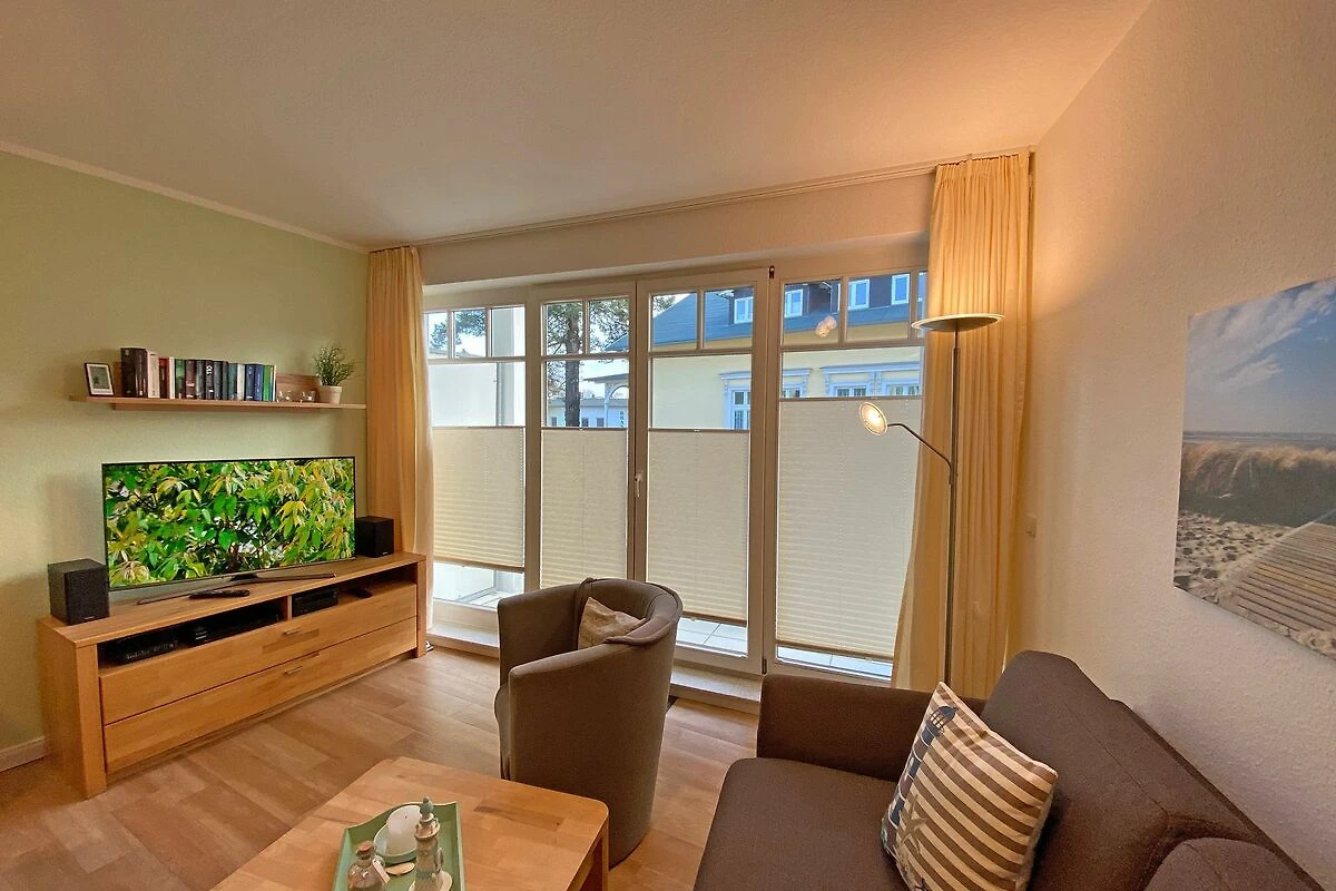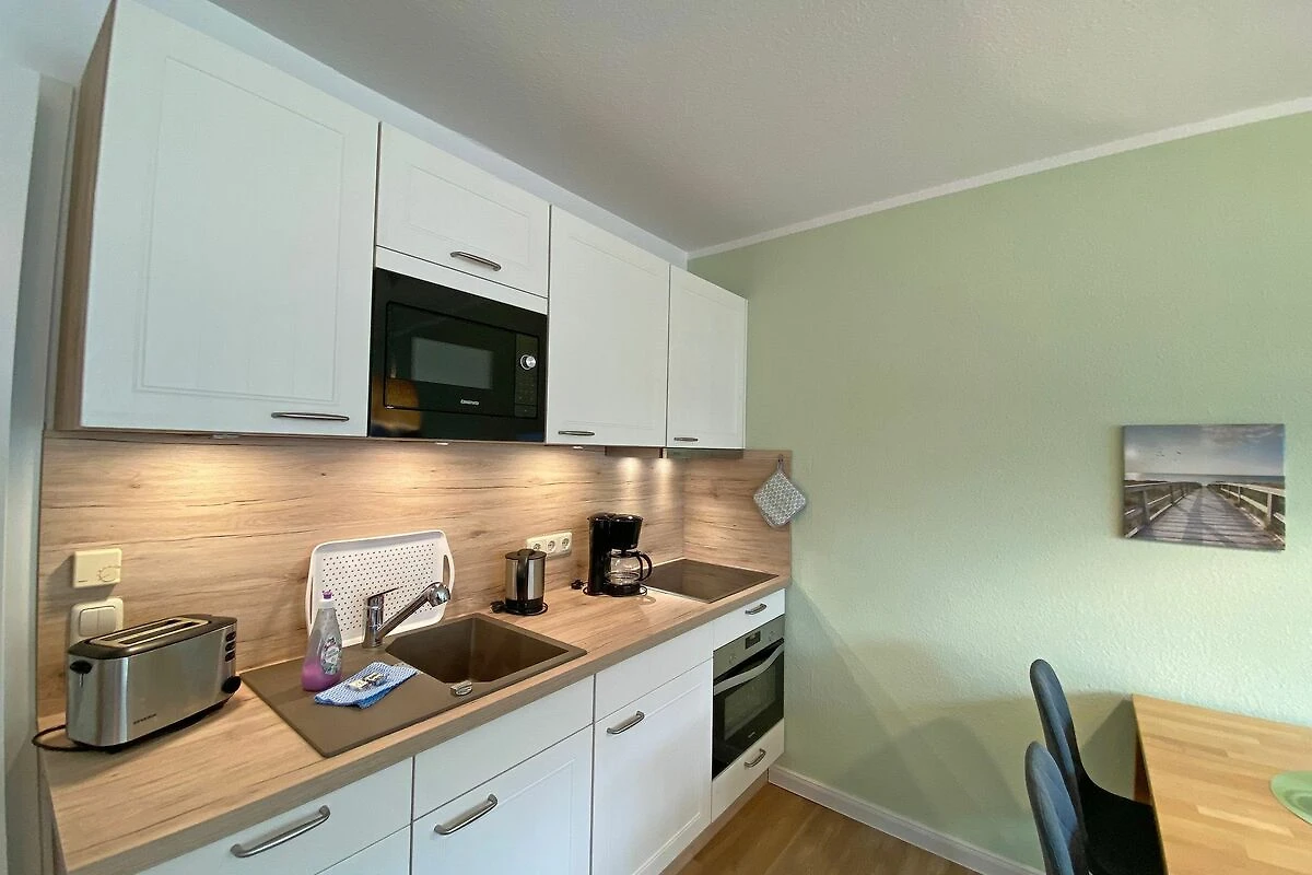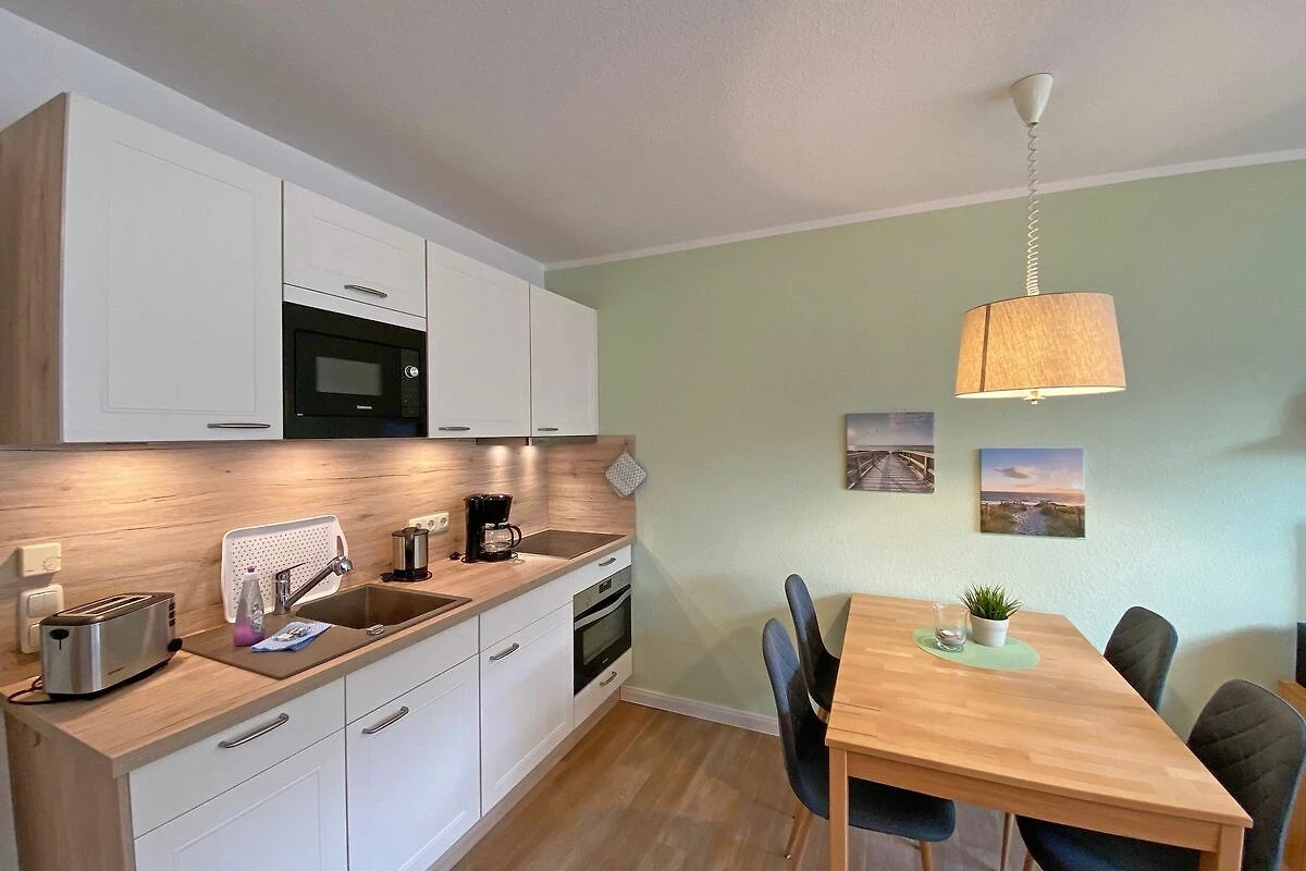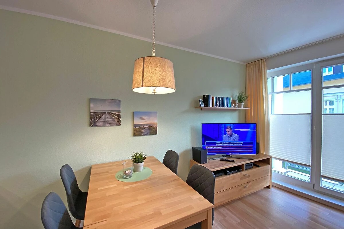Die gemütliche 2-Raumwohnung (Nichtraucher) befindet sich in der 1. Etage der Appartementanlage Villa Granitz. Die Wohnfläche beträgt ca. 45m², die mit 2 -4 Personen genutzt werden kann. Der Wohnbereich mit offener Küchenzeile wird durch eine hochwertige Schlafcouch (Faltbett, Masse 1,30m x 2,00m, Aufbettungsmöglichkeit für 3./4. Person) mit Couchtisch, Sideboard mit LCD-TV (40 Zoll), Blu-Ray-Player und einer Stereoanlage abgerundet. Der gemütliche Essplatz mit 4 Stühlen passt sich dem Wohnbereich an. Die Küchenzeile ist mit einem 4-Zonen Ceranfeld, Mikrowelle, Kompaktbackofen, Geschirrspüler, Kühlschrank mit Gefrierfach, Spüle, Kaffeemaschine, Toaster, Wasserkocher, Eierkocher und diversen Küchenutensilien ausgestattet. Vom Wohnzimmer aus erreichen Sie den überdachten und bestuhlten Balkon. Im Schlafzimmer befindet sich ein Doppelbett (1,80 x 2,00m, mit getrennten Matratzen), ein Kleiderschrank, Ablageflächen sowie Verdunklungsmöglichkeiten. Ein Kinderreisebett kann hier aufgestellt werden. Das Schlafzimmer bietet zusätzlich einen Zugang zu einem schmalen Balkon, wo Sie mit einem seitlichen Meerblick die Abendsonne geniessen können. Das hell geflieste Bad mit einem Waschbecken, Dusche, WC, Ablageflächen, Kosmetikspiegel und Fön runden den Sanitärbereich ab. Der Dielenbereich ist mit einer Garderobe versehen. Alle Räumlichkeiten sind mit einer Fussbodenheizung versehen. Für unsere kleinen Gäste stehen 1x Kinderreisebett mit Matratze (ohne Bett Inlett) und 1x Hochstuhl inklusive zur Verfügung. Ein Internetzugang (WLAN) ist für Sie inklusive. Haustiere sind in der Wohnung nicht erlaubt. In der Tiefgarage befindet sich ein inklusiver PKW-Stellplatz, der zur Wohnung gehört. Im Nebengebäude können Sie eine Waschmaschine und einen Trockner gegen eine Extragebühr nutzen. Ein Fahrradkeller steht Ihnen für Ihre mitgebrachten sowie geliehenen Fahrräder zur Verfügung. Die Erstausstattung eines Wäschepaketes (komplette Bettwäsche, 1 Duschhandtuch, 1 kleines Handtuch) können Sie bis 14 Tage vor Anreise gegen einen Aufpreis dazu buchen oder durch eigene ergänzen. Ab 2 gebuchten Paketen erhalten Sie einmalig 1 Geschirrhandtuch und 1 Duschvorleger hinzu.