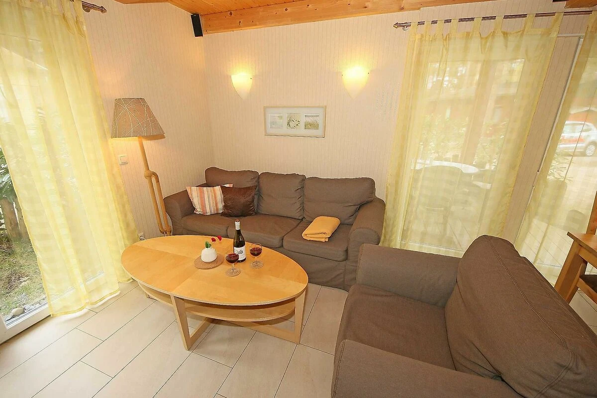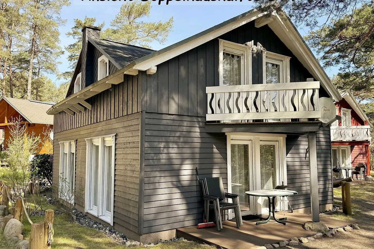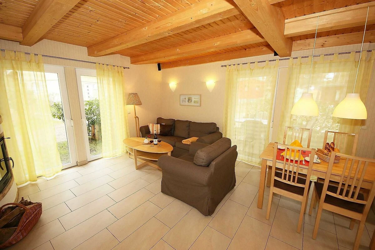 Die Doppelhaushälfte (Nichtraucher) mit Ihren 55 m² Wohnfläche bietet ausreichend Platz für 4 Erw. + 1 Kleinkind bis 3 Jahre im Kinderreisebett. Die bodentiefen Fenster im Wohn-/Essbereich lassen viel Tageslicht herein und geben Ihnen den direkten Zugang zur überdachten und bestuhlten Terrasse (Süd-Ost). Abgerundet wird diese durch einen Grill. Der gemütlich, im Schwedenstil, eingerichtete Wohnbereich ist mit einer Couchecke, Couchtisch, LCD-TV mit HD-Qualität und Satellitenempfang, DVD-Player mit Radio und ein Sideboard aus Naturholz ausgestattet. Für die kühleren Tage bieten Ihnen der Kamin (Kaminholz inklusive) sowie die Fussbodenheizung eine angenehme Wärme. Ihre Unterhaltungstechnik wird durch einen kostenfreien WLAN-Zugang abgerundet. Die angrenzende Küchenzeile mit Backofen, Ceranfeld, Dunstabzug, Kühlschrank + Eisfach, Spülmaschine, Mikrowelle, Kaffeemaschine, Toaster, Wasserkocher und kleinen Küchenhelfern lässt keine Wünsche offen. Ihre Mahlzeiten nehmen Sie am dazugehörigen Esstisch mit 4 Stühlen ein. Im Obergeschoss befinden sich beide Schlafzimmer die jeweils mit 2 Boxspringbetten (je mit 0,80 m x 2,00 m), Nachtischablagen, Safe und einem Kleiderschrank ausgestattet sind. Von beiden Schlafzimmern gelangen Sie auf den Balkon. Zusätzlich können Sie ein Kinderreisebett in eines der Schlafzimmer aufstellen. Das Tageslichtbad, was sich auf der gleichen Höhe befindet, wurde mit einer ebenerdigen Dusche, WC, Waschplatz, Handtuchtrockner und Fön ausgestattet. Für unsere kleinen Gäste steht Ihnen 1x Kinderhochstuhl und 1x Kinderreisebett (inkl. Matratze, ohne Bett Inlett) inklusive zur Verfügung. 2 kleine Haustiere sind gegen eine Gebühr gern gesehene Gäste. Eine kleine Waschküche steht Ihnen inklusive zur Verfügung. Die Erstausstattung eines Wäschepaketes (komplette Bettwäsche, 1 Duschhandtuch, 2 kleine Handtücher) können Sie bis 14 Tage vor Anreise gegen einen Aufpreis dazu buchen oder durch eigene ergänzen. Ab 2 gebuchten Paketen erhalten Sie einmalig 1 Geschirrhandtuch und 1 Duschvorleger hinzu.