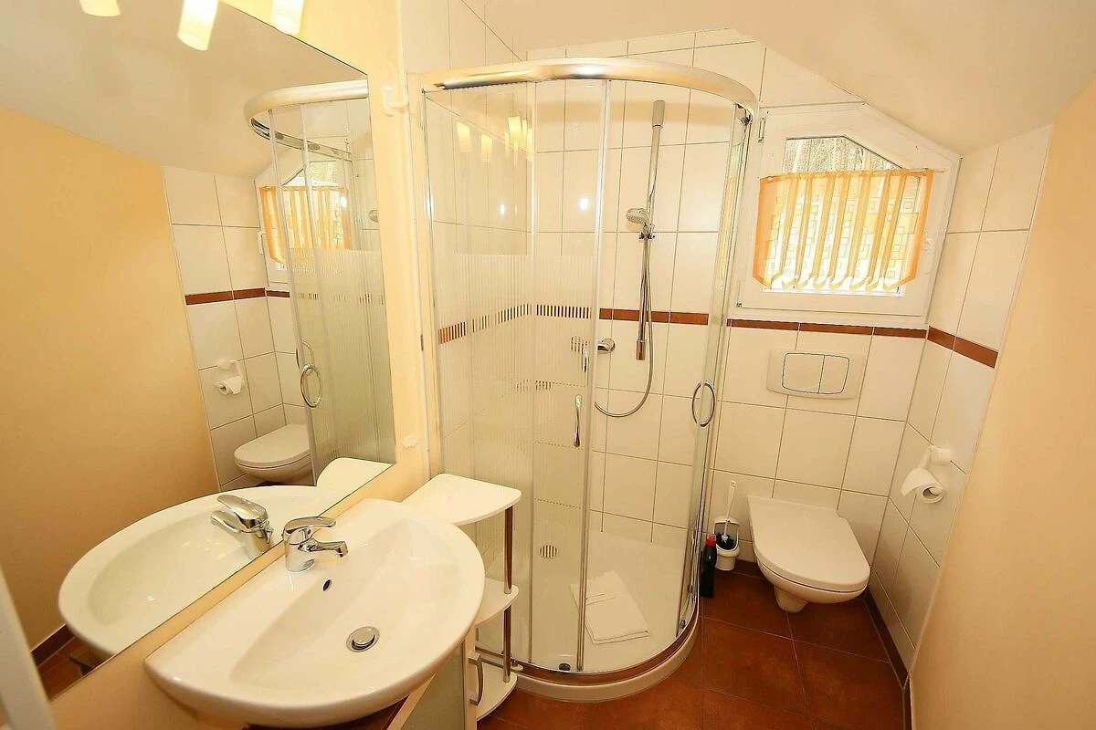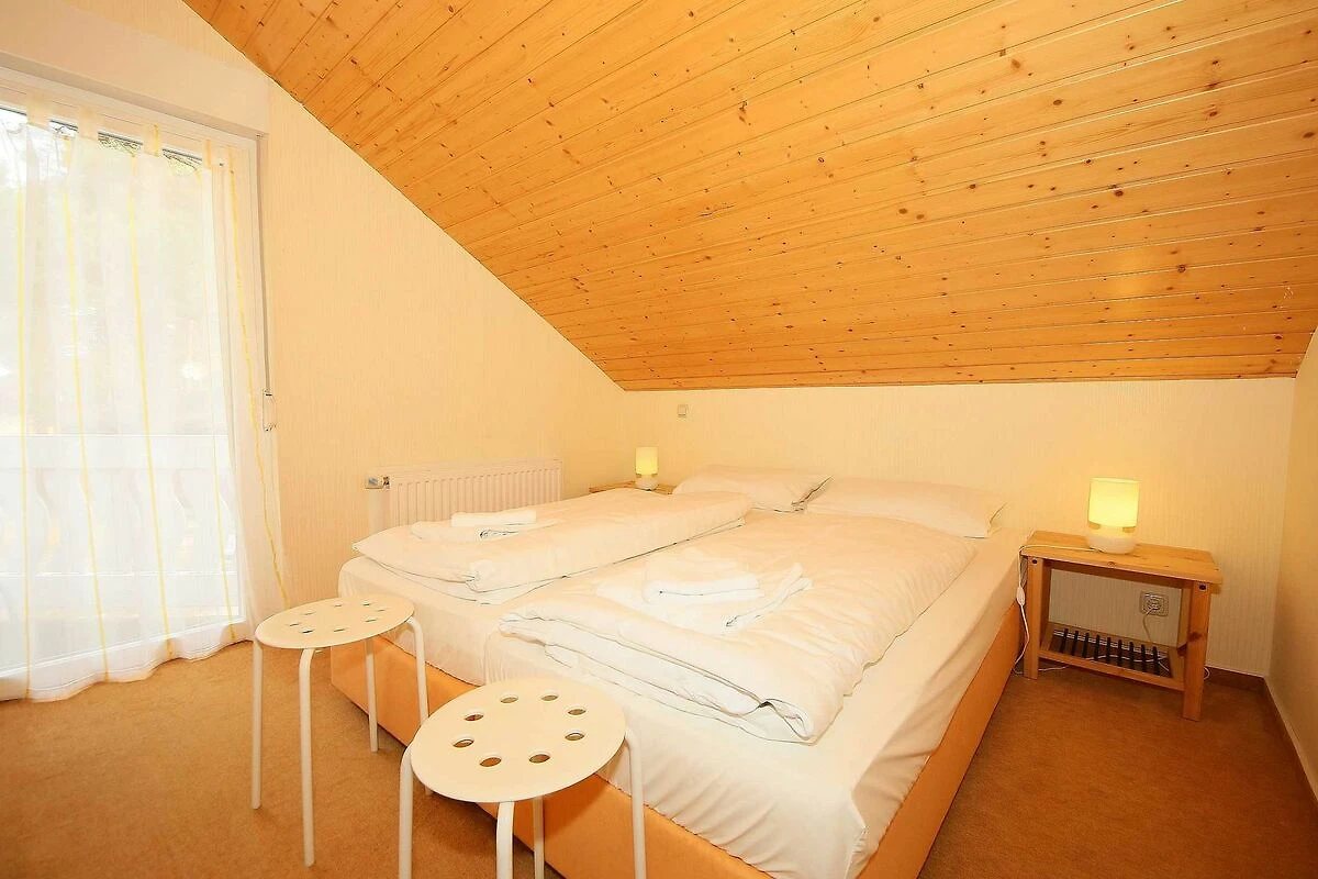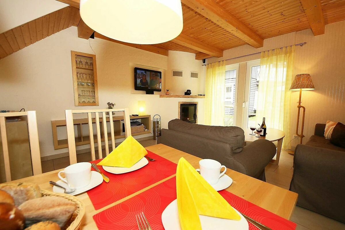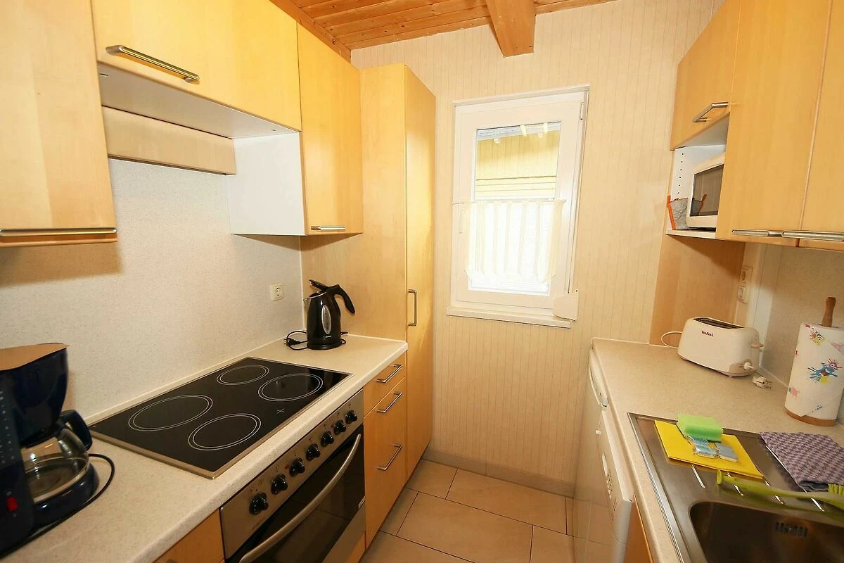 Die Doppelhaushälfte (Nichtraucher) mit Ihren 55 m² Wohnfläche bietet ausreichend Platz für 4 Erw. + 1 Kleinkind bis 3 Jahre im Kinderreisebett. Die bodentiefen Fenster im Wohn-/Essbereich lassen viel Tageslicht herein und geben Ihnen den direkten Zugang zur überdachten und bestuhlten Terrasse (Süd-Ost). Abgerundet wird diese durch einen Grill. Der gemütlich, im Schwedenstil, eingerichtete Wohnbereich ist mit einer Couchecke, Couchtisch, LCD-TV mit HD-Qualität und Satellitenempfang, DVD-Player mit Radio und ein Sideboard aus Naturholz ausgestattet. Für die kühleren Tage bieten Ihnen der Kamin (Kaminholz inklusive) sowie die Fussbodenheizung eine angenehme Wärme. Ihre Unterhaltungstechnik wird durch einen kostenfreien WLAN-Zugang abgerundet. Die angrenzende Küchenzeile mit Backofen, Ceranfeld, Dunstabzug, Kühlschrank + Eisfach, Spülmaschine, Mikrowelle, Kaffeemaschine, Toaster, Wasserkocher und kleinen Küchenhelfern lässt keine Wünsche offen. Ihre Mahlzeiten nehmen Sie am dazugehörigen Esstisch mit 4 Stühlen ein. Im Obergeschoss befinden sich beide Schlafzimmer die jeweils mit 2 Boxspringbetten (je mit 0,80 m x 2,00 m), Nachtischablagen, Safe und einem Kleiderschrank ausgestattet sind. Von beiden Schlafzimmern gelangen Sie auf den Balkon. Zusätzlich können Sie ein Kinderreisebett in eines der Schlafzimmer aufstellen. Das Tageslichtbad, was sich auf der gleichen Höhe befindet, wurde mit einer ebenerdigen Dusche, WC, Waschplatz, Handtuchtrockner und Fön ausgestattet. Für unsere kleinen Gäste steht Ihnen 1x Kinderhochstuhl und 1x Kinderreisebett (inkl. Matratze, ohne Bett Inlett) inklusive zur Verfügung. 2 kleine Haustiere sind gegen eine Gebühr gern gesehene Gäste. Eine kleine Waschküche steht Ihnen inklusive zur Verfügung. Die Erstausstattung eines Wäschepaketes (komplette Bettwäsche, 1 Duschhandtuch, 2 kleine Handtücher) können Sie bis 14 Tage vor Anreise gegen einen Aufpreis dazu buchen oder durch eigene ergänzen. Ab 2 gebuchten Paketen erhalten Sie einmalig 1 Geschirrhandtuch und 1 Duschvorleger hinzu.