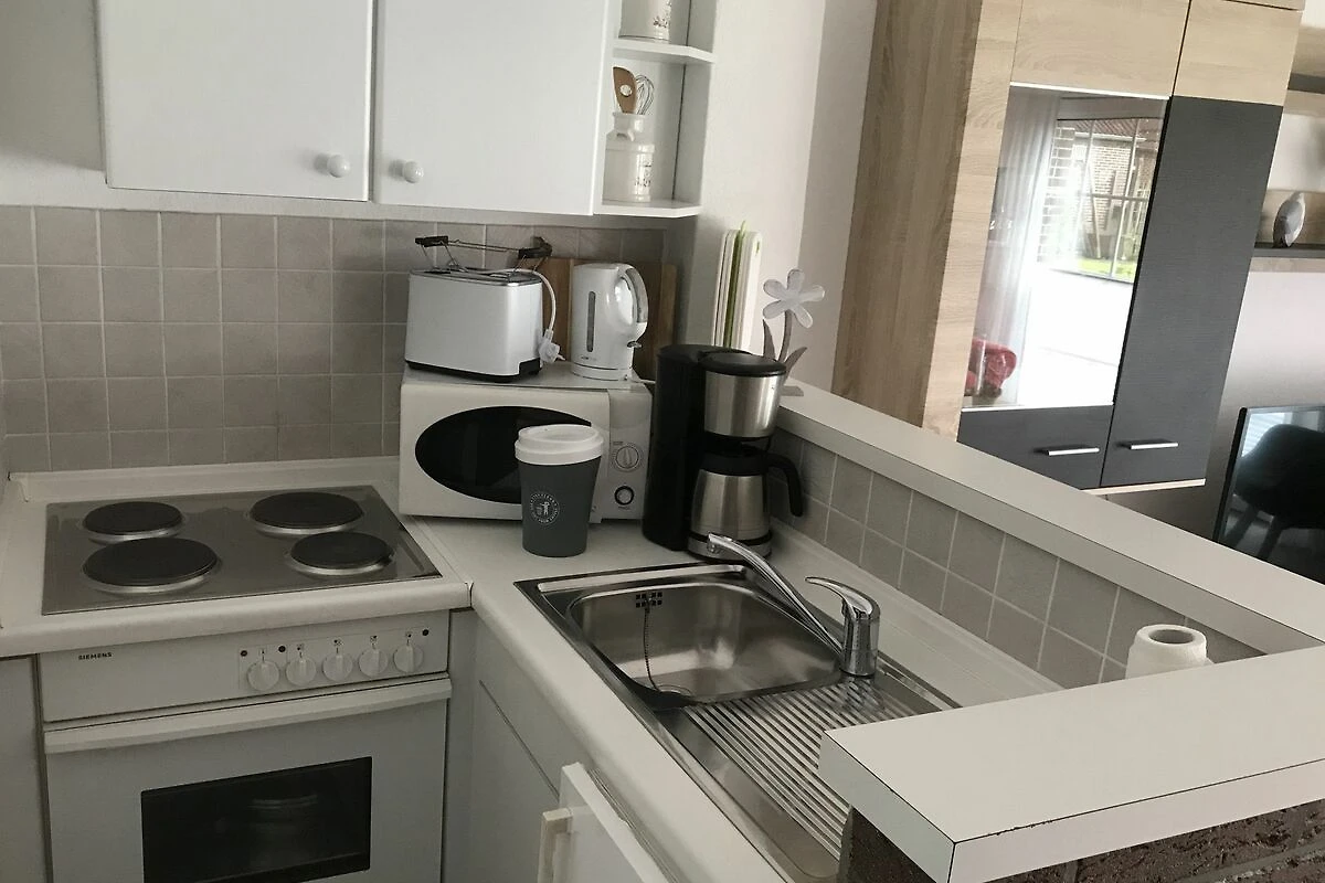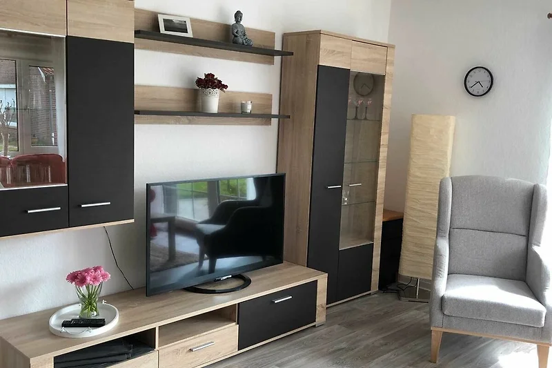 Im Erdgeschoss befindet sich ein gemütliches Wohn- und Esszimmer mit Flachbild-TV, Esstisch mit Bestuhlung, kleine Küchenzeile mit allen erforderlichen Haushaltsgeräten.