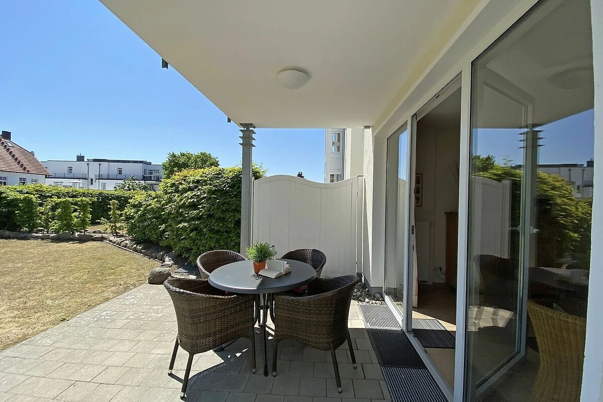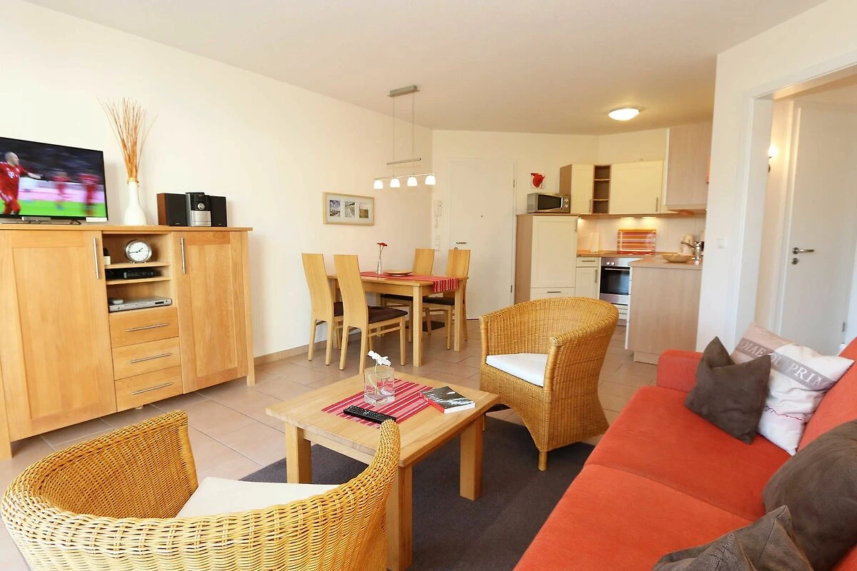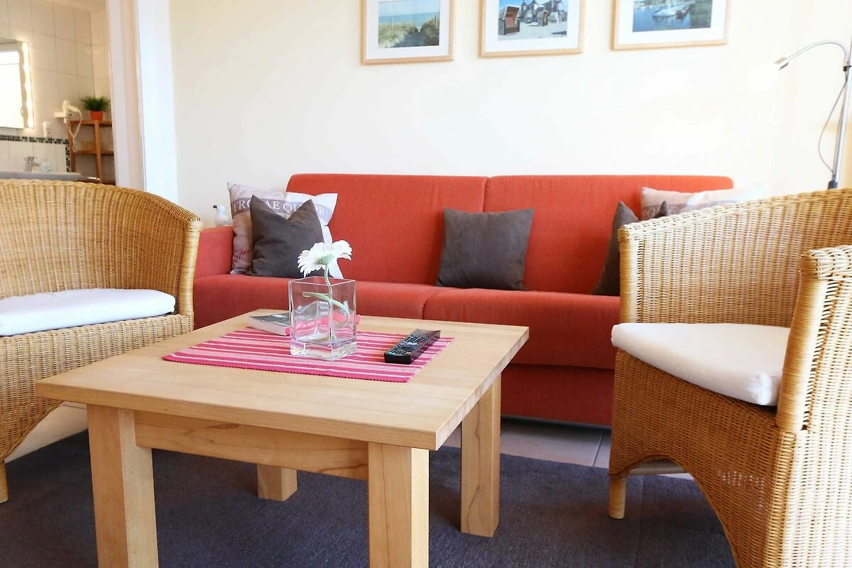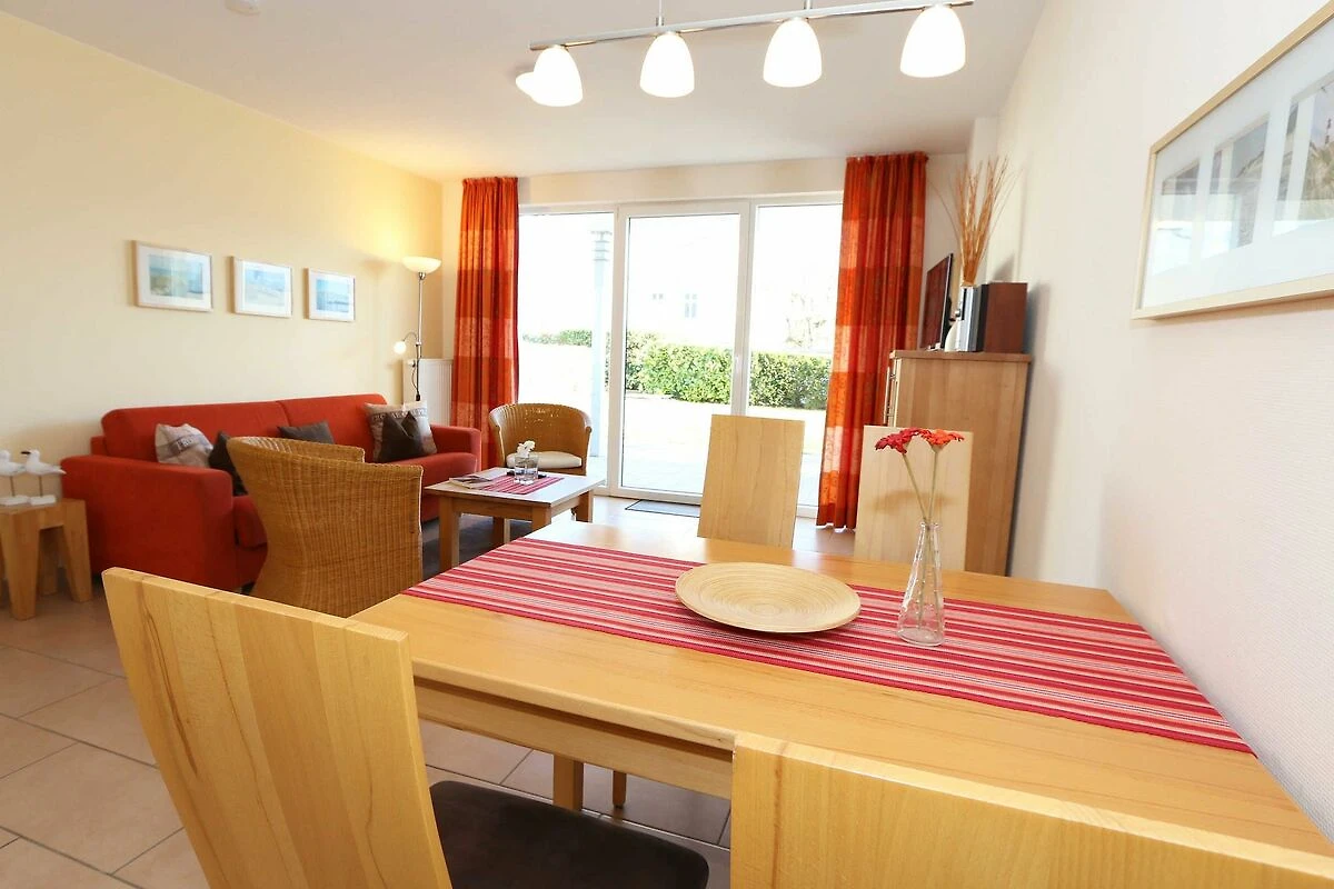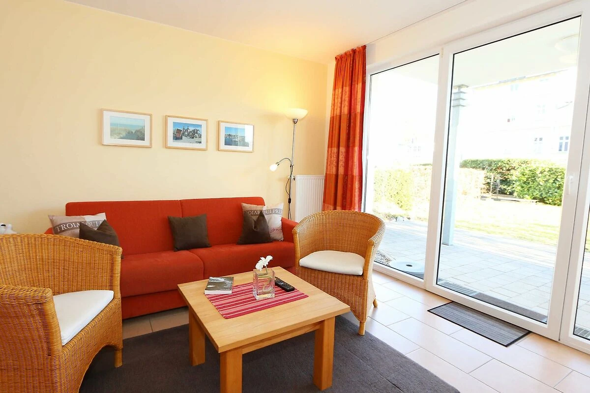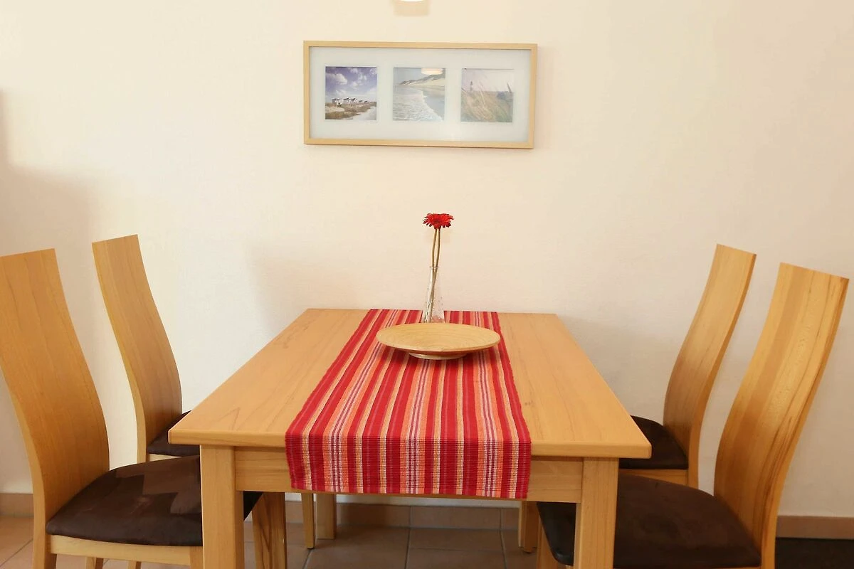 Sie wohnen in einer modern und hochwertig eingerichteten 2-Zimmer-Nichtraucherwohnung. Bei einer Wohnungsgrösse von ca. 50m² haben 2 bis 4 Personen ausreichend Platz. Vom Eingangsbereich aus gelangen Sie in einen grosszügigen, lichtdurchfluteten Wohn- und Essbereich. Der Wohnbereich ist mit einem Sideboard, Leselampe, Smart-TV, DVD-Player, Stereoanlage, einer gemütlichen Couch (hochwertige Ausziehfunktion mit separater Matratze 1,60 m x 2,00 m) mit Couchtisch ausgestattet. Auch auf einen Internetanschluss (WLAN) müssen Sie im Urlaub nicht verzichten. Dieser ist für unsere Gäste inklusive! Die komplett ausgestattete Küchenzeile wird durch einen Geschirrspüler, Backofen, Mikrowelle, Kühlschrank mit Gefrierfach, Kaffeemaschine, Toaster, Wasserkocher, Eierkocher, kleine Küchenutensilien sowie durch eine Essgruppe mit 4 Stühlen abgerundet. Angrenzend liegt das Schlafzimmer mit einem Doppelbett (1,80m x 2,00m, 7 Zonen-Kaltschaummatratze), verstellbare Lattenroste, einem geräumigen Kleiderschrank, Insektenschutzgitter, LCD-TV und zusätzlicher Kommode. Für einen ruhigen Schlaf können Sie den Raum abdunkeln. Das Badezimmer ist mit Dusche, Waschtisch, WC, Kosmetikspiegel, Fön, Insektenschutzgitter und beheizbaren Handtuchhalter/Fussbodenheizung sowie einem Einbauradio ausgestattet. Im separaten Abstellraum finden Sie einen Wäscheständer, Bügeleisen sowie ein Bügelbrett, Reinigungsutensilien und ein Schuhschrank. Auf der teilweisen überdachten Terrasse (Osten), die sowohl vom Wohnbereich wie auch vom Schlafzimmer erreichbar ist, befindet sich eine Sitzgruppe und eine Sonnenliege. Hier können Sie den angrenzenden Garten von ca. 60m² frei nutzen. Haustiere sind nicht erlaubt. Für unsere kleinen Gäste steht Ihnen ein Kinderreisebett (ohne Matratze, ohne Bettinlett) inklusive zur Verfügung. Einen PKW-Stellplatz (Nr.1, Einfahrtshöhe 2,10m) finden Sie in der Tiefgarage des Hauses. Ihre geliehenen oder auch mitgebrachten Fahrräder können Sie im eigenen abschliessbaren Kellerraum unterstellen. Im Gemeinschaftskeller können Sie gegen einen Aufpreis die gemeinschaftliche Waschmaschine und den Trockner nutzen. Die Wertmarken können Sie auf Nachfrage während Ihres Urlaubes erwerben. Die Erstausstattung eines Wäschepaketes (komplette Bettwäsche, 1 Duschhandtuch, 1 kleines Handtuch) können Sie bis 14 Tage vor Anreise gegen einen Aufpreis dazu buchen oder durch eigene ergänzen. Ab 2 gebuchten Paketen erhalten Sie einmalig 1 Geschirrhandtuch und 1 Duschvorleger hinzu.