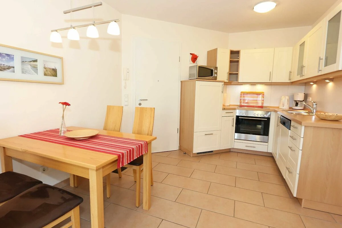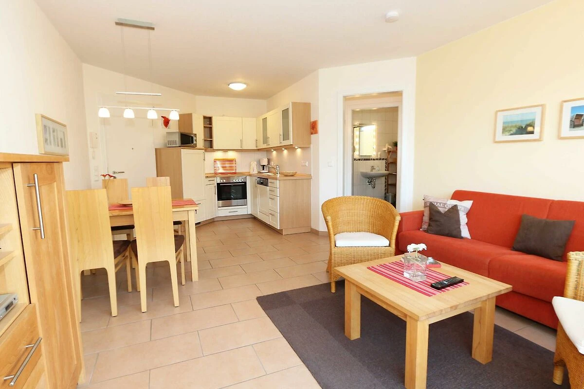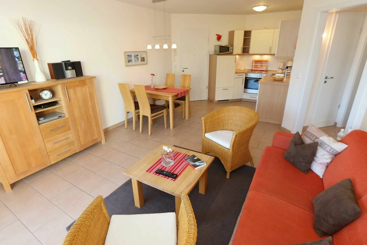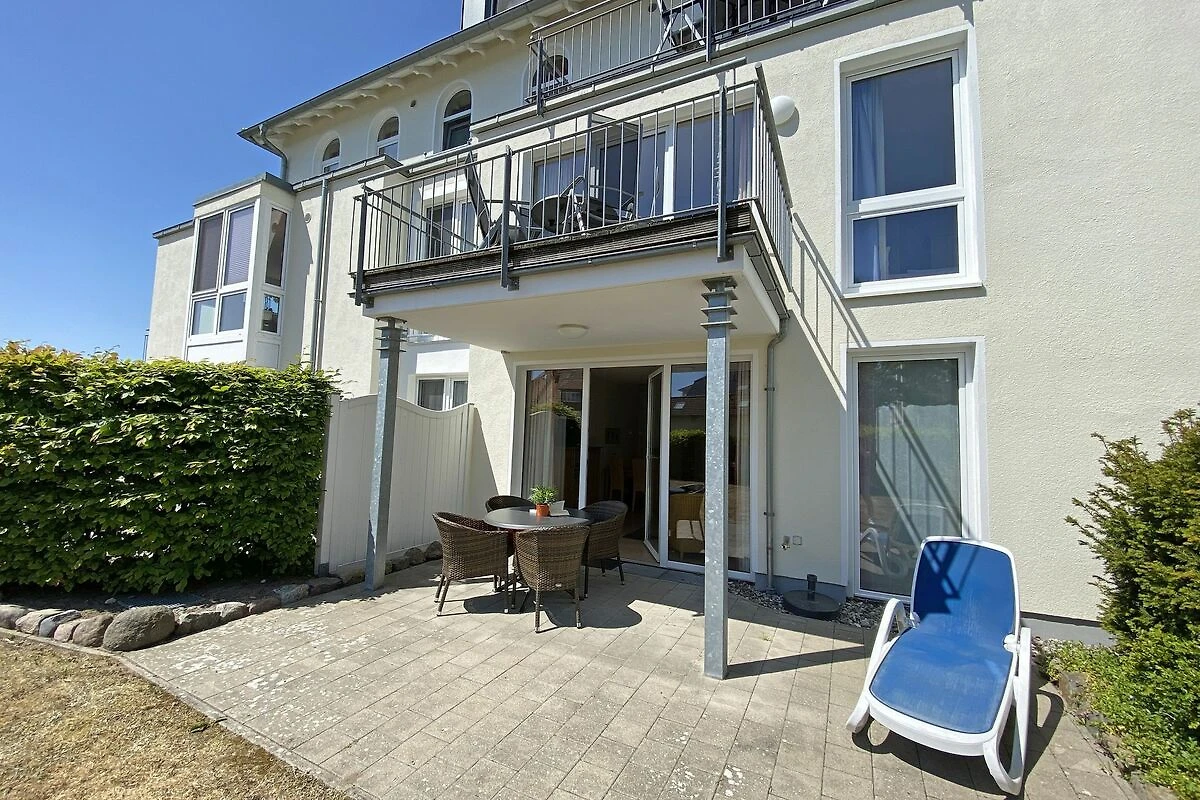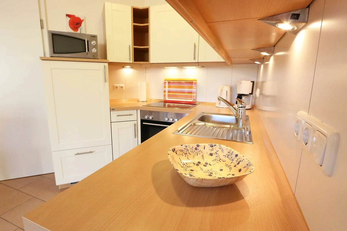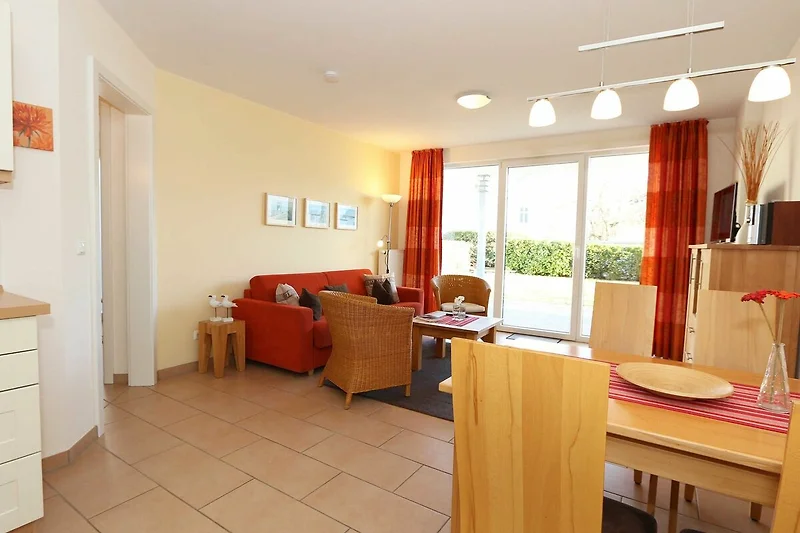 Sie wohnen in einer modern und hochwertig eingerichteten 2-Zimmer-Nichtraucherwohnung. Bei einer Wohnungsgrösse von ca. 50m² haben 2 bis 4 Personen ausreichend Platz. Vom Eingangsbereich aus gelangen Sie in einen grosszügigen, lichtdurchfluteten Wohn- und Essbereich. Der Wohnbereich ist mit einem Sideboard, Leselampe, Smart-TV, DVD-Player, Stereoanlage, einer gemütlichen Couch (hochwertige Ausziehfunktion mit separater Matratze 1,60 m x 2,00 m) mit Couchtisch ausgestattet. Auch auf einen Internetanschluss (WLAN) müssen Sie im Urlaub nicht verzichten. Dieser ist für unsere Gäste inklusive! Die komplett ausgestattete Küchenzeile wird durch einen Geschirrspüler, Backofen, Mikrowelle, Kühlschrank mit Gefrierfach, Kaffeemaschine, Toaster, Wasserkocher, Eierkocher, kleine Küchenutensilien sowie durch eine Essgruppe mit 4 Stühlen abgerundet. Angrenzend liegt das Schlafzimmer mit einem Doppelbett (1,80m x 2,00m, 7 Zonen-Kaltschaummatratze), verstellbare Lattenroste, einem geräumigen Kleiderschrank, Insektenschutzgitter, LCD-TV und zusätzlicher Kommode. Für einen ruhigen Schlaf können Sie den Raum abdunkeln. Das Badezimmer ist mit Dusche, Waschtisch, WC, Kosmetikspiegel, Fön, Insektenschutzgitter und beheizbaren Handtuchhalter/Fussbodenheizung sowie einem Einbauradio ausgestattet. Im separaten Abstellraum finden Sie einen Wäscheständer, Bügeleisen sowie ein Bügelbrett, Reinigungsutensilien und ein Schuhschrank. Auf der teilweisen überdachten Terrasse (Osten), die sowohl vom Wohnbereich wie auch vom Schlafzimmer erreichbar ist, befindet sich eine Sitzgruppe und eine Sonnenliege. Hier können Sie den angrenzenden Garten von ca. 60m² frei nutzen. Haustiere sind nicht erlaubt. Für unsere kleinen Gäste steht Ihnen ein Kinderreisebett (ohne Matratze, ohne Bettinlett) inklusive zur Verfügung. Einen PKW-Stellplatz (Nr.1, Einfahrtshöhe 2,10m) finden Sie in der Tiefgarage des Hauses. Ihre geliehenen oder auch mitgebrachten Fahrräder können Sie im eigenen abschliessbaren Kellerraum unterstellen. Im Gemeinschaftskeller können Sie gegen einen Aufpreis die gemeinschaftliche Waschmaschine und den Trockner nutzen. Die Wertmarken können Sie auf Nachfrage während Ihres Urlaubes erwerben. Die Erstausstattung eines Wäschepaketes (komplette Bettwäsche, 1 Duschhandtuch, 1 kleines Handtuch) können Sie bis 14 Tage vor Anreise gegen einen Aufpreis dazu buchen oder durch eigene ergänzen. Ab 2 gebuchten Paketen erhalten Sie einmalig 1 Geschirrhandtuch und 1 Duschvorleger hinzu.