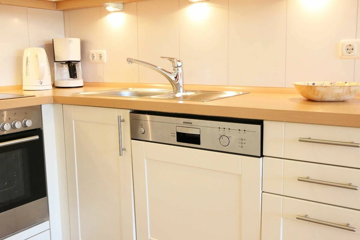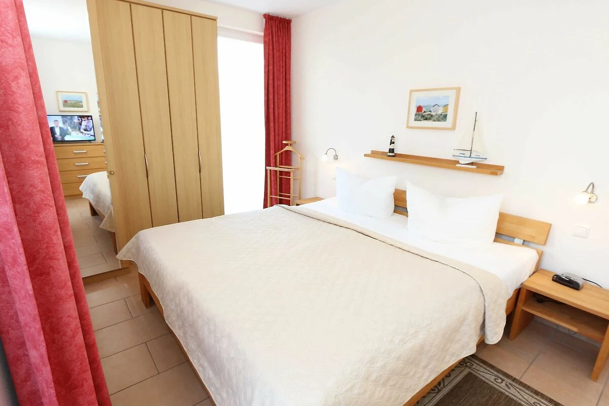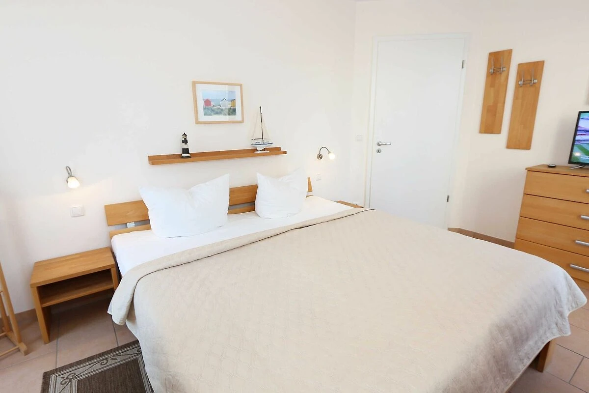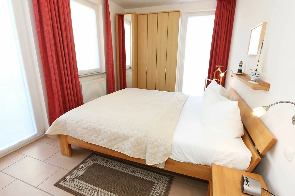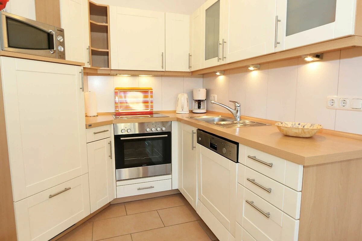 Sie wohnen in einer modern und hochwertig eingerichteten 2-Zimmer-Nichtraucherwohnung. Bei einer Wohnungsgrösse von ca. 50m² haben 2 bis 4 Personen ausreichend Platz. Vom Eingangsbereich aus gelangen Sie in einen grosszügigen, lichtdurchfluteten Wohn- und Essbereich. Der Wohnbereich ist mit einem Sideboard, Leselampe, Smart-TV, DVD-Player, Stereoanlage, einer gemütlichen Couch (hochwertige Ausziehfunktion mit separater Matratze 1,60 m x 2,00 m) mit Couchtisch ausgestattet. Auch auf einen Internetanschluss (WLAN) müssen Sie im Urlaub nicht verzichten. Dieser ist für unsere Gäste inklusive! Die komplett ausgestattete Küchenzeile wird durch einen Geschirrspüler, Backofen, Mikrowelle, Kühlschrank mit Gefrierfach, Kaffeemaschine, Toaster, Wasserkocher, Eierkocher, kleine Küchenutensilien sowie durch eine Essgruppe mit 4 Stühlen abgerundet. Angrenzend liegt das Schlafzimmer mit einem Doppelbett (1,80m x 2,00m, 7 Zonen-Kaltschaummatratze), verstellbare Lattenroste, einem geräumigen Kleiderschrank, Insektenschutzgitter, LCD-TV und zusätzlicher Kommode. Für einen ruhigen Schlaf können Sie den Raum abdunkeln. Das Badezimmer ist mit Dusche, Waschtisch, WC, Kosmetikspiegel, Fön, Insektenschutzgitter und beheizbaren Handtuchhalter/Fussbodenheizung sowie einem Einbauradio ausgestattet. Im separaten Abstellraum finden Sie einen Wäscheständer, Bügeleisen sowie ein Bügelbrett, Reinigungsutensilien und ein Schuhschrank. Auf der teilweisen überdachten Terrasse (Osten), die sowohl vom Wohnbereich wie auch vom Schlafzimmer erreichbar ist, befindet sich eine Sitzgruppe und eine Sonnenliege. Hier können Sie den angrenzenden Garten von ca. 60m² frei nutzen. Haustiere sind nicht erlaubt. Für unsere kleinen Gäste steht Ihnen ein Kinderreisebett (ohne Matratze, ohne Bettinlett) inklusive zur Verfügung. Einen PKW-Stellplatz (Nr.1, Einfahrtshöhe 2,10m) finden Sie in der Tiefgarage des Hauses. Ihre geliehenen oder auch mitgebrachten Fahrräder können Sie im eigenen abschliessbaren Kellerraum unterstellen. Im Gemeinschaftskeller können Sie gegen einen Aufpreis die gemeinschaftliche Waschmaschine und den Trockner nutzen. Die Wertmarken können Sie auf Nachfrage während Ihres Urlaubes erwerben. Die Erstausstattung eines Wäschepaketes (komplette Bettwäsche, 1 Duschhandtuch, 1 kleines Handtuch) können Sie bis 14 Tage vor Anreise gegen einen Aufpreis dazu buchen oder durch eigene ergänzen. Ab 2 gebuchten Paketen erhalten Sie einmalig 1 Geschirrhandtuch und 1 Duschvorleger hinzu.