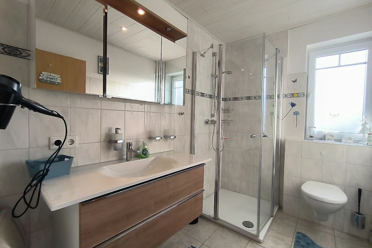 Die Ferienwohnung 1 liegt in der ersten Etage und verfügt über zwei Schlafzimmer mit Doppelbett, ein Wohnzimmer mit Sitz- und Essecke, einer Küche ( vollständig ausgestattet mit Geschirrspüler und Mikrowelle) und einem Duschbad mit Tageslicht. Im Erdgeschoss befindet sich ein Raum mit Waschmaschine und Wäscheständer.