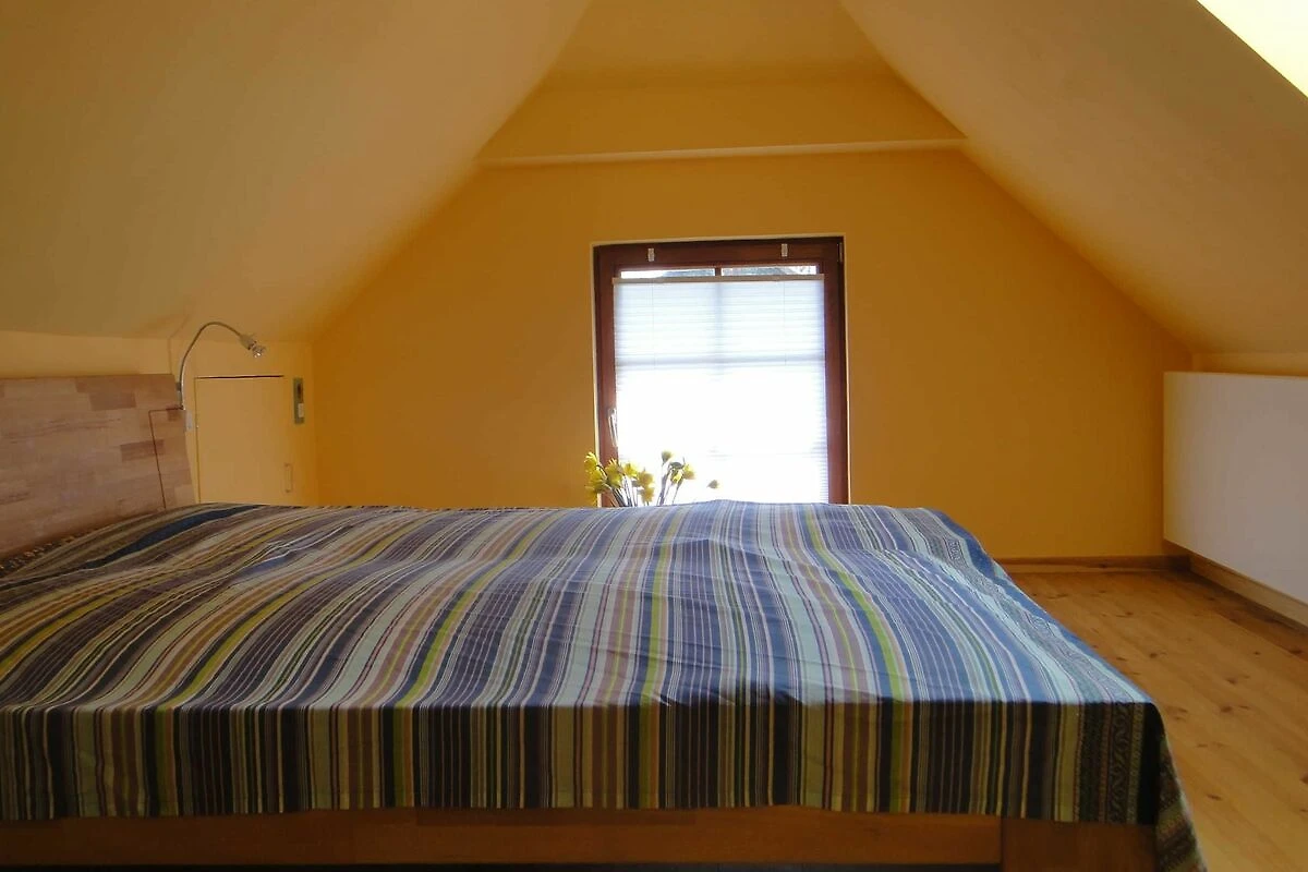 Vom Wohn/Essbereich gelangen Sie über eine offene Treppe ins Dachgeschoss. Dort befindet sich zunächst eine Galerie - ein schöner Rückzugsort zum Lesen, Fernsehen oder auch zum Arbeiten. Ein HDfähiger FlachbildTV sowie Bluray/DVDPlayer (inkl. bereitgestellter OstseeReisefilme) sind vorhanden, WLAN nutzen Sie kostenfrei. An die Galerie schliesst sich ein gemütliches Schlafzimmer im „ZeltLook“ an, mit Doppelbett sowie Regal und Kleideraufbewahrung in BucheEchtholz. Ein Tresor steht zur Verfügung; auf Wunsch geniessen Sie sogar einen Blick in den Sternenhimmel. Zusätzliche Kopfkissen und Bettdecken mit unterschiedlicher Füllung (Daunen, Körner, Polyester) können bereitgestellt werden.