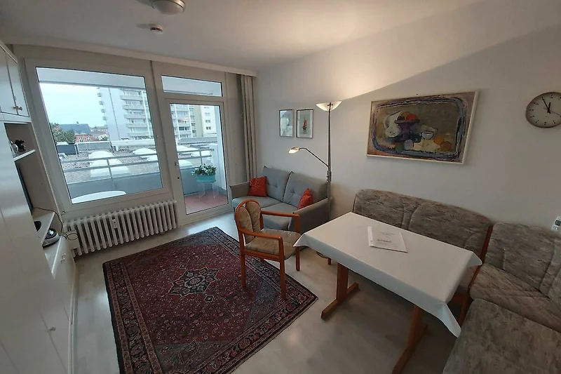 Die Nichtraucher-Einraum-Wohnung für 1-2 Personen befindet sich in der 1. Etage des Appartementhauses (Fahrstuhl vorhanden). Sie hat eine Grösse von ca.29,5m² und mit einfacher Ausstattung eingerichtet. Der kombinierte Wohn-Schlafraum verfügt über ein Doppelschrankbett (1,60 x 1,90 m) einen Esstisch mit Essecke, sowie einem Sofa und einem Farb-TV (Flachbildschirm). Die Küchenzeile mit Elektroherd, Kühlschrank und Spüle befindet sich im Flurbereich. Badezimmer mit Dusche/WC. Die Wohnung verfügt über einen überdachten Balkon (Loggia) Richtung Osten mit Balkonmöbeln. W-LAN vorhanden. Waschmaschinen und Trocknernutzung im Haus vorhanden! Haustiere sind nicht erlaubt!
