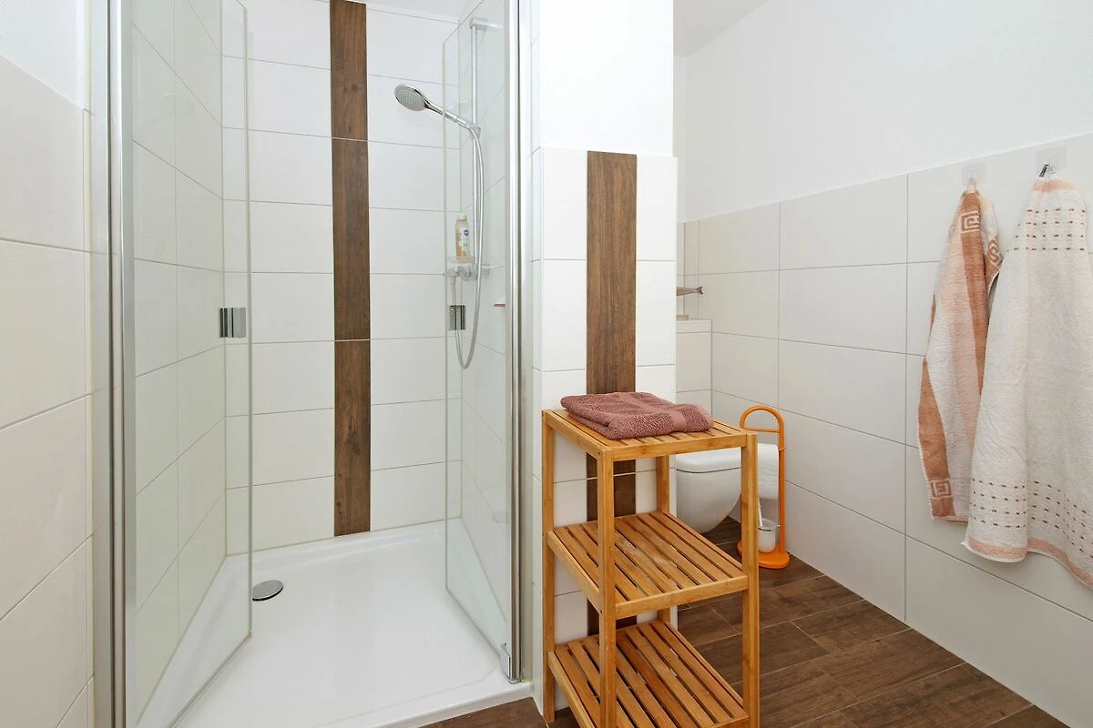 Das Badezimmer verfügt über eine grosszügige, nahezu ebenerdige Dusche und Handtuchwärmer.