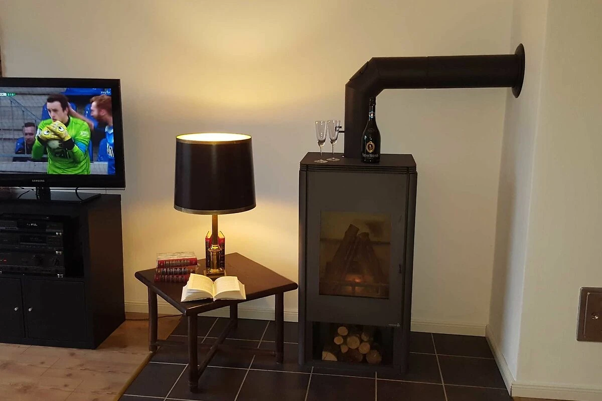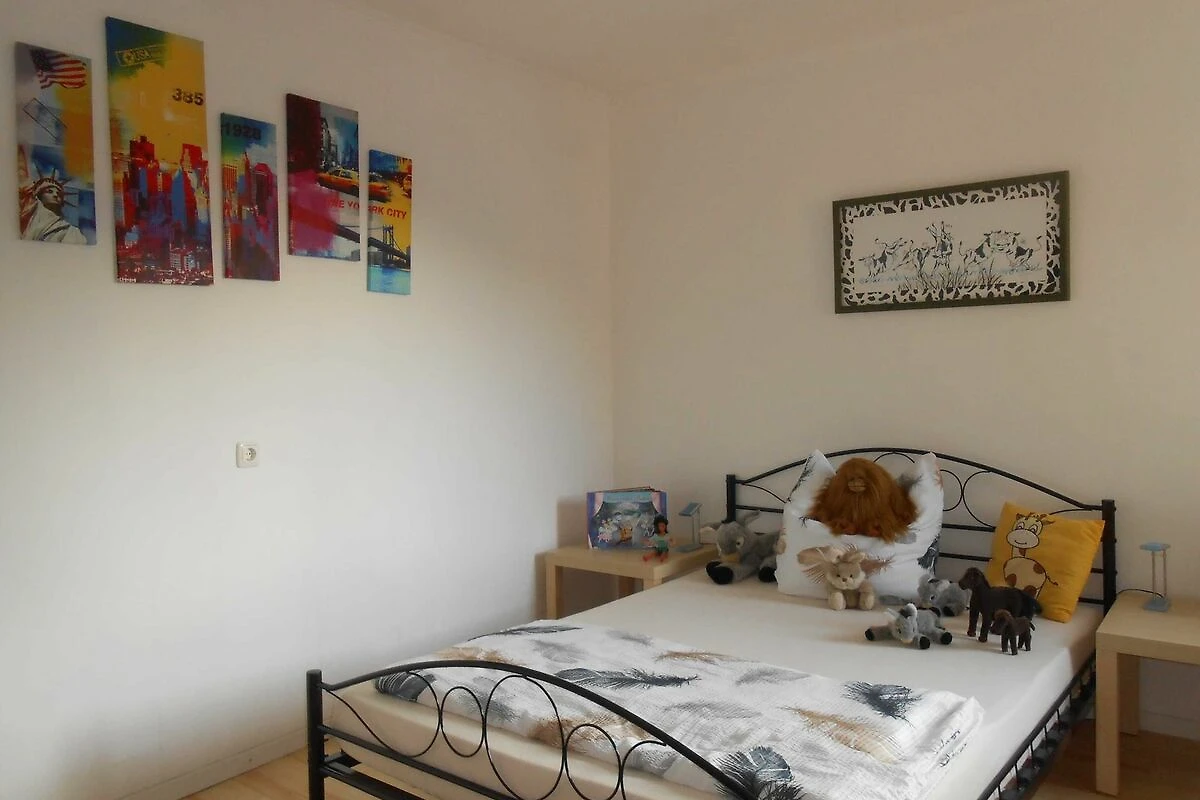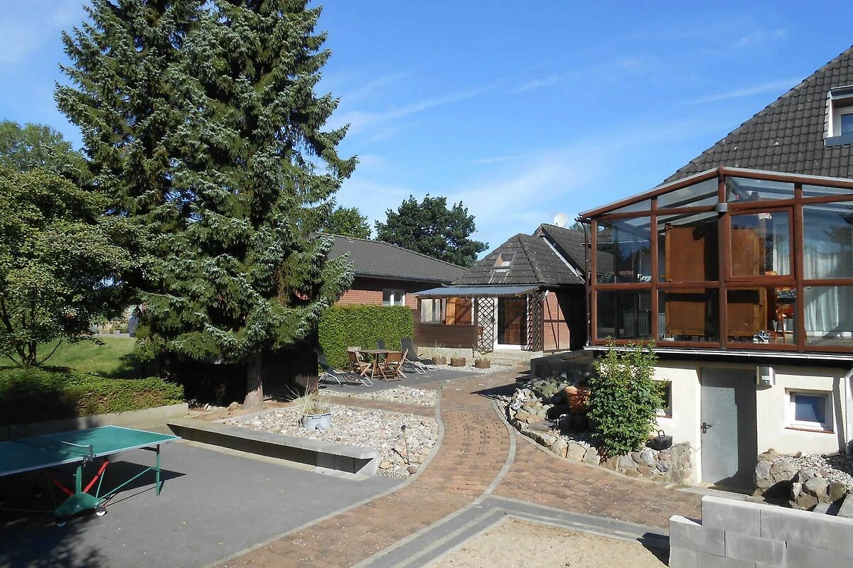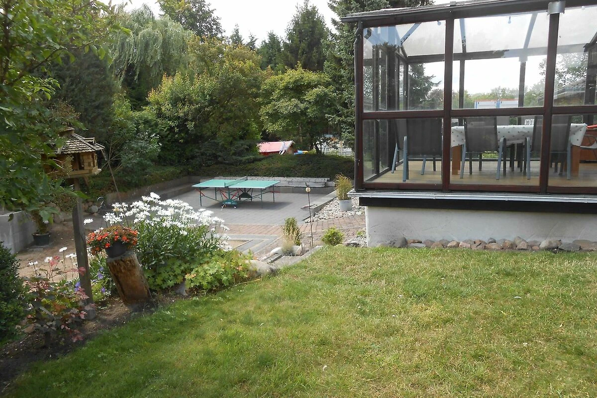 Die Ferienwohnung hat ein Bad mit Badewanne sowie eine Gästetoilette. Die Küche (mit Spülmaschine) und Flur besitzen Bodenfliesen, im Rest der Wohnung ist Laminat verlegt worden. Zwei Schlafzimmer haben französische Betten (140 x 200 cm), ein weiteres Schlafzimmer hat ein Bett (180 x 200 cm). Im Anbau im Wohnzimmer steht zusätzlich noch eine Schlafcouch für zwei Personen. Direkt vom Anbau gelangt man in den 20 m² grossen Wintergarten, der einen direkten Zugang in den Garten hat. Dort gibt es einen Platz im Carport für ein Fahrzeug. Der Kamin steht leider nicht zur Benutzung zur Verfügung. Im Garten kann man die Seele baumeln lassen. Ein Kinderreisebett (ohne Bettwäsche!!!!) und ein Kinderstuhl werden gerne kostenlos zur Verfügung gestellt.