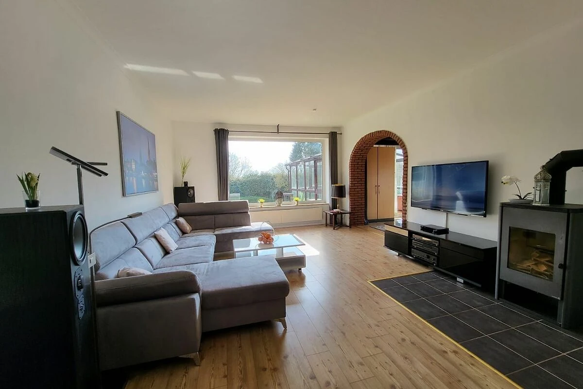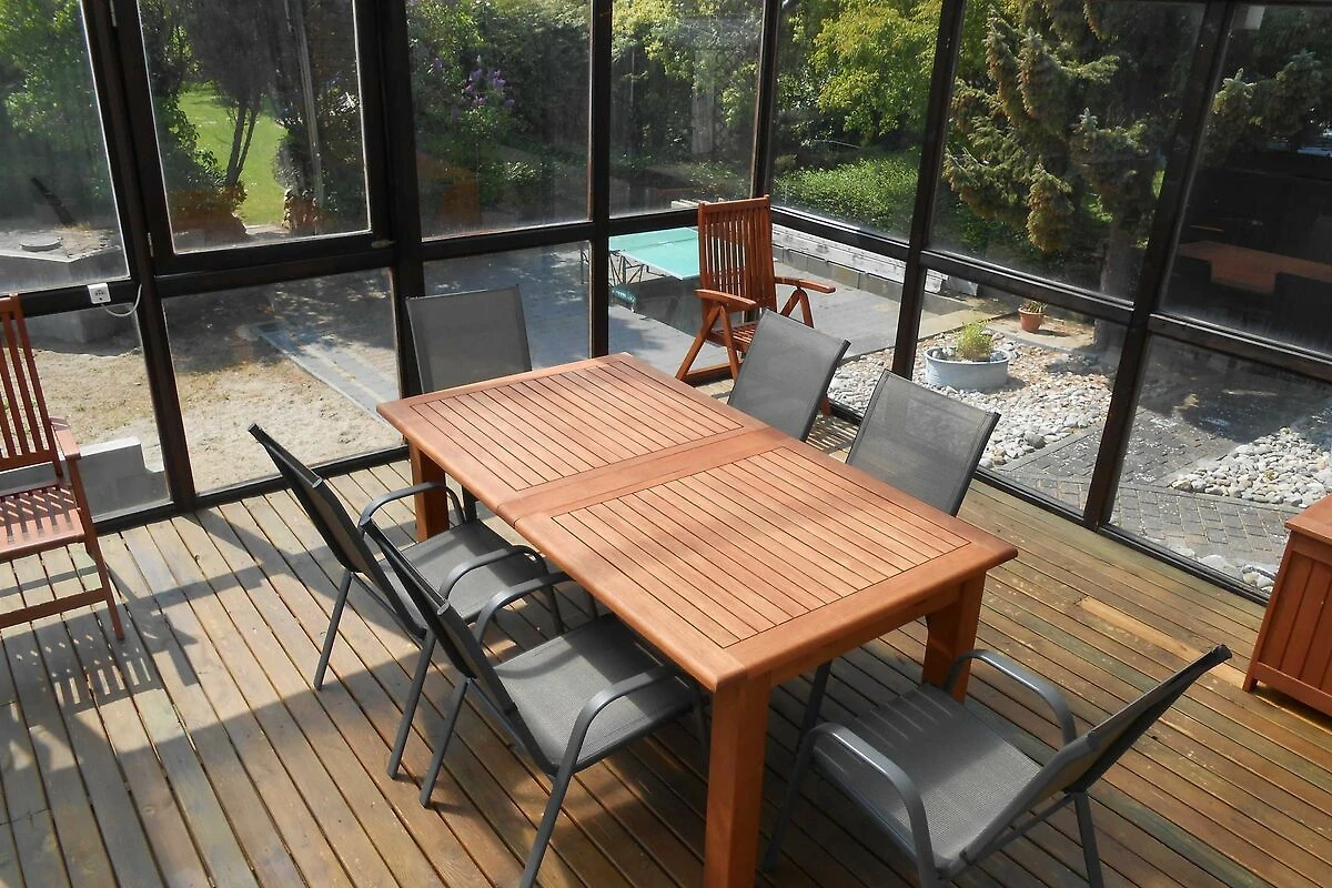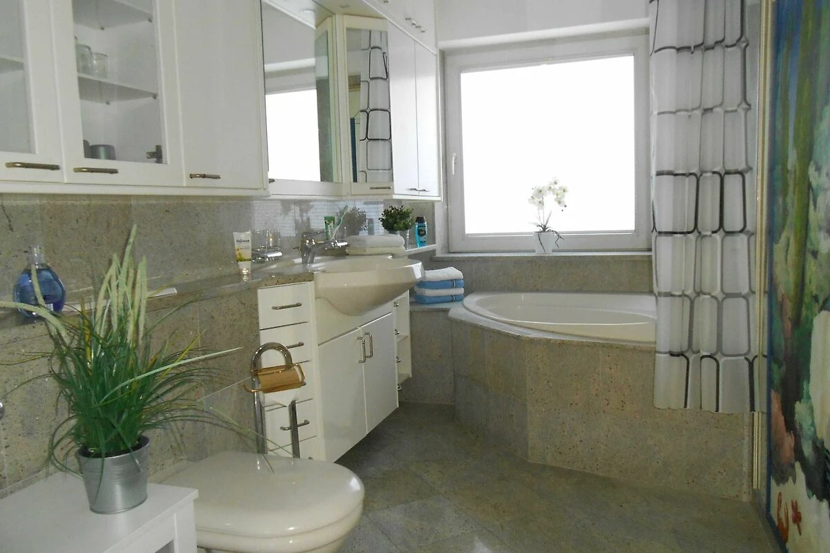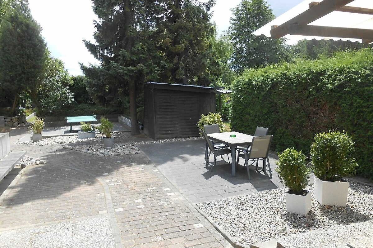 Die Ferienwohnung hat ein Bad mit Badewanne sowie eine Gästetoilette. Die Küche (mit Spülmaschine) und Flur besitzen Bodenfliesen, im Rest der Wohnung ist Laminat verlegt worden. Zwei Schlafzimmer haben französische Betten (140 x 200 cm), ein weiteres Schlafzimmer hat ein Bett (180 x 200 cm). Im Anbau im Wohnzimmer steht zusätzlich noch eine Schlafcouch für zwei Personen. Direkt vom Anbau gelangt man in den 20 m² grossen Wintergarten, der einen direkten Zugang in den Garten hat. Dort gibt es einen Platz im Carport für ein Fahrzeug. Der Kamin steht leider nicht zur Benutzung zur Verfügung. Im Garten kann man die Seele baumeln lassen. Ein Kinderreisebett (ohne Bettwäsche!!!!) und ein Kinderstuhl werden gerne kostenlos zur Verfügung gestellt.