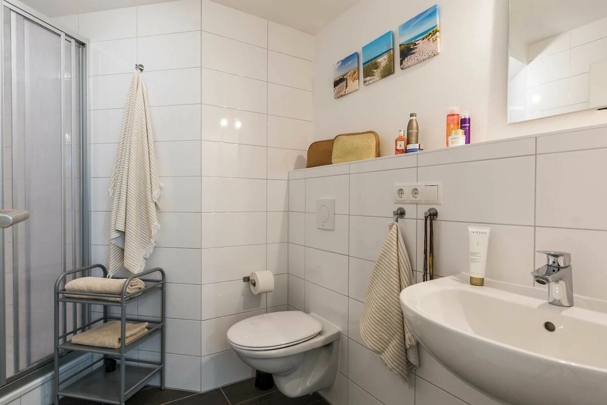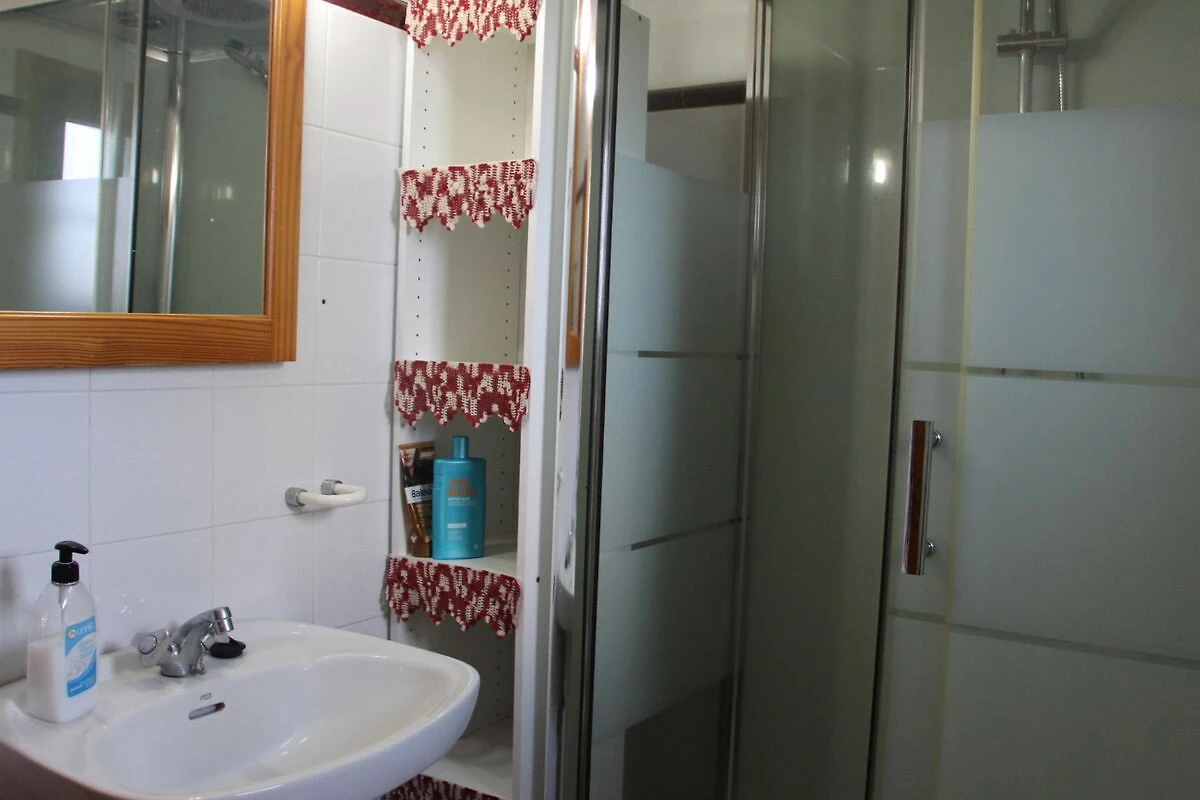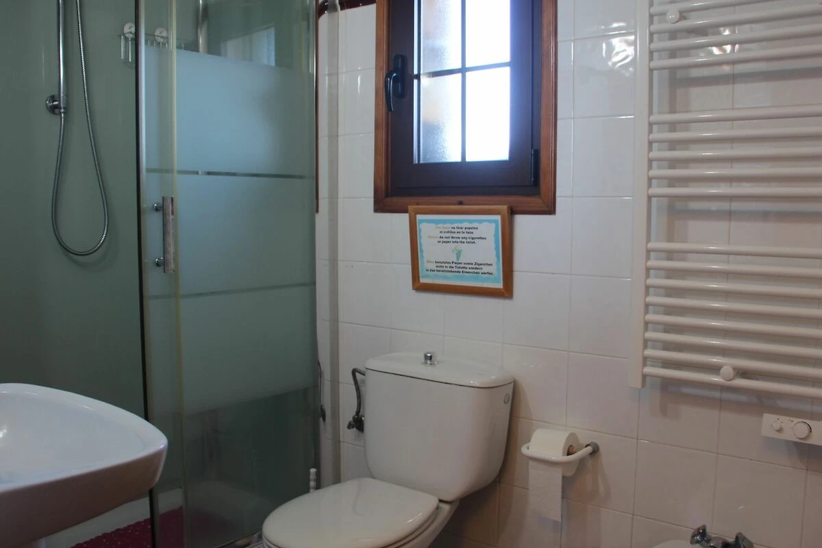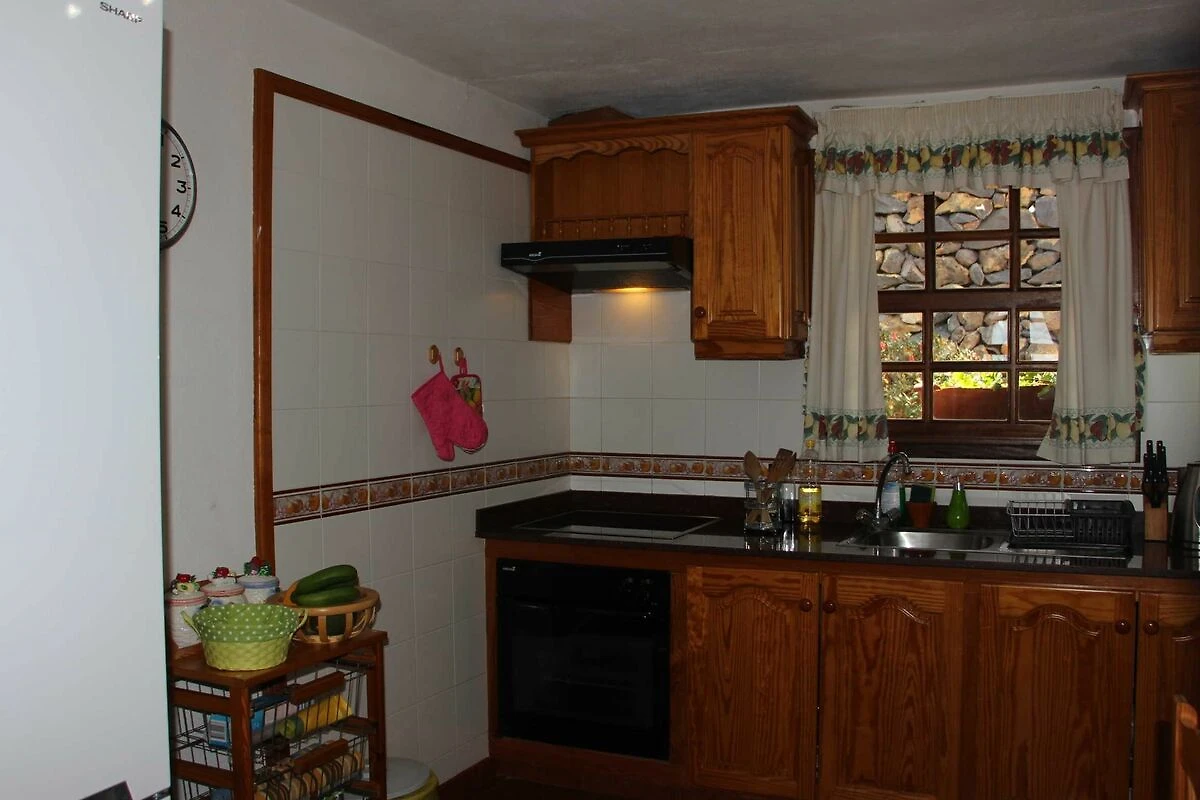 Eine separate Küche bietet einen kleinen Esstisch mit 3 Stühlen und eine gut ausgestattete Küchenzeile. Das  Bad befindet sich direkt neben dem Wohnzimmer und verfügt über eine Dusche mit grossem Duschkopf, WC und Bidet. Im Bad gibt es einen beheizbaren Handtuchhalter. Die Waschmaschine ist ausserhalb des Hauses untergebracht.