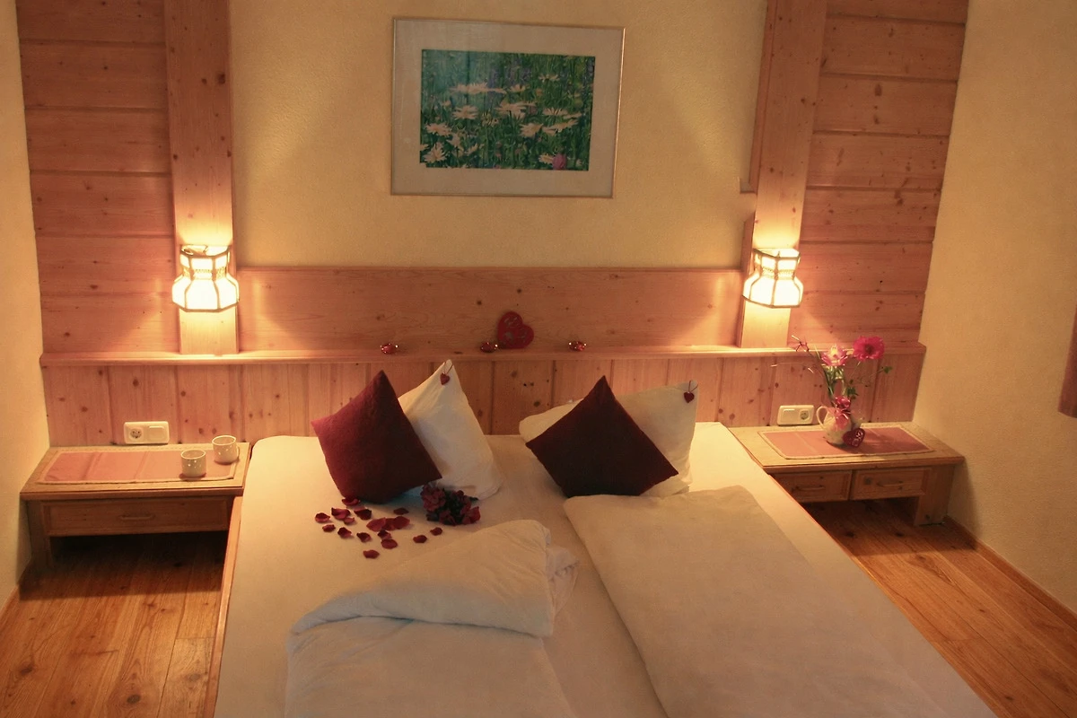 Alpiner Charme und wohlige Geborgenheit zeichnen diese Wohnung aus. Ein gemütliches, individuelles Schlafzimmer mit großen Vollholz Betten. aus Naturholz