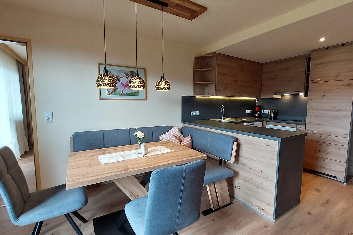 Sonniger Frühstücksplatz mit Traum Aussicht auf das Land. Perfekt eingerichtete Küche mit allen Annehmlichkeiten.