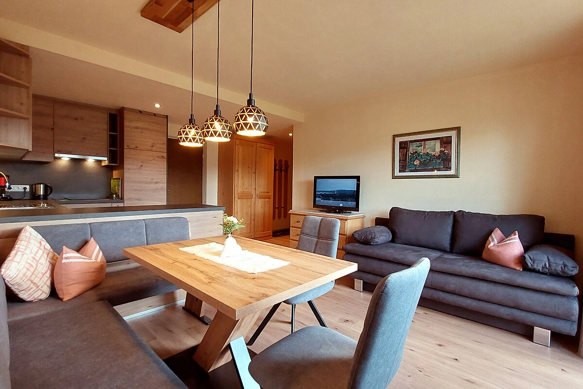 Das Wohnzimmer mit dem großen Essplatz sind der Treffpunkt für Familie und Freunde. Auf hoher Ebene erwartet Sie ein alpines und zugleich modernes Ambiente mit vanille, verputzten Wänden. Der atemberaubende Ausblick auf das Inntal und das gewaltige Bergmassiv der Stubaier Alpen lässt keine Wünsche offen.