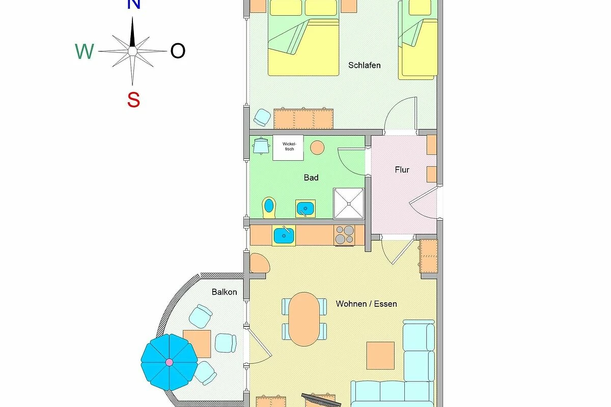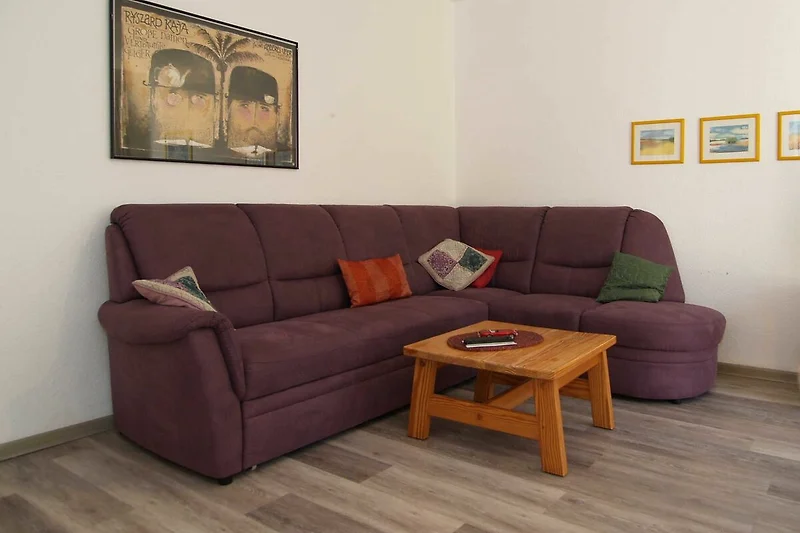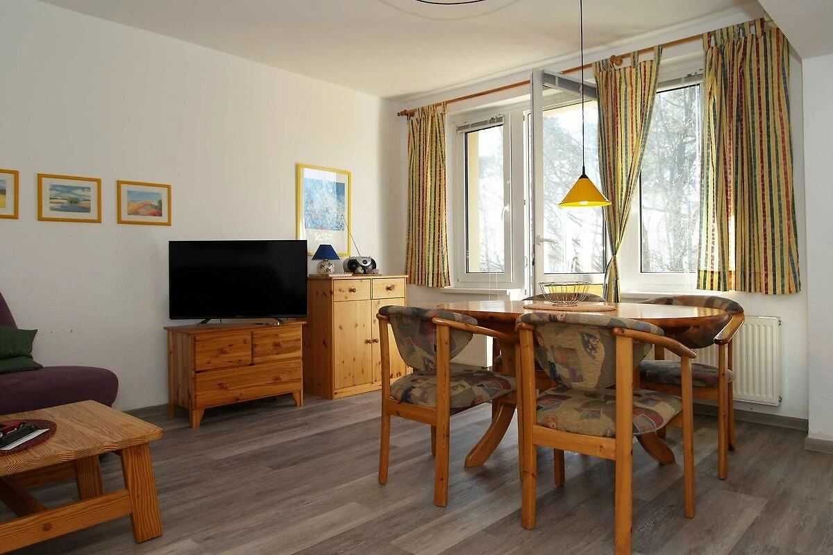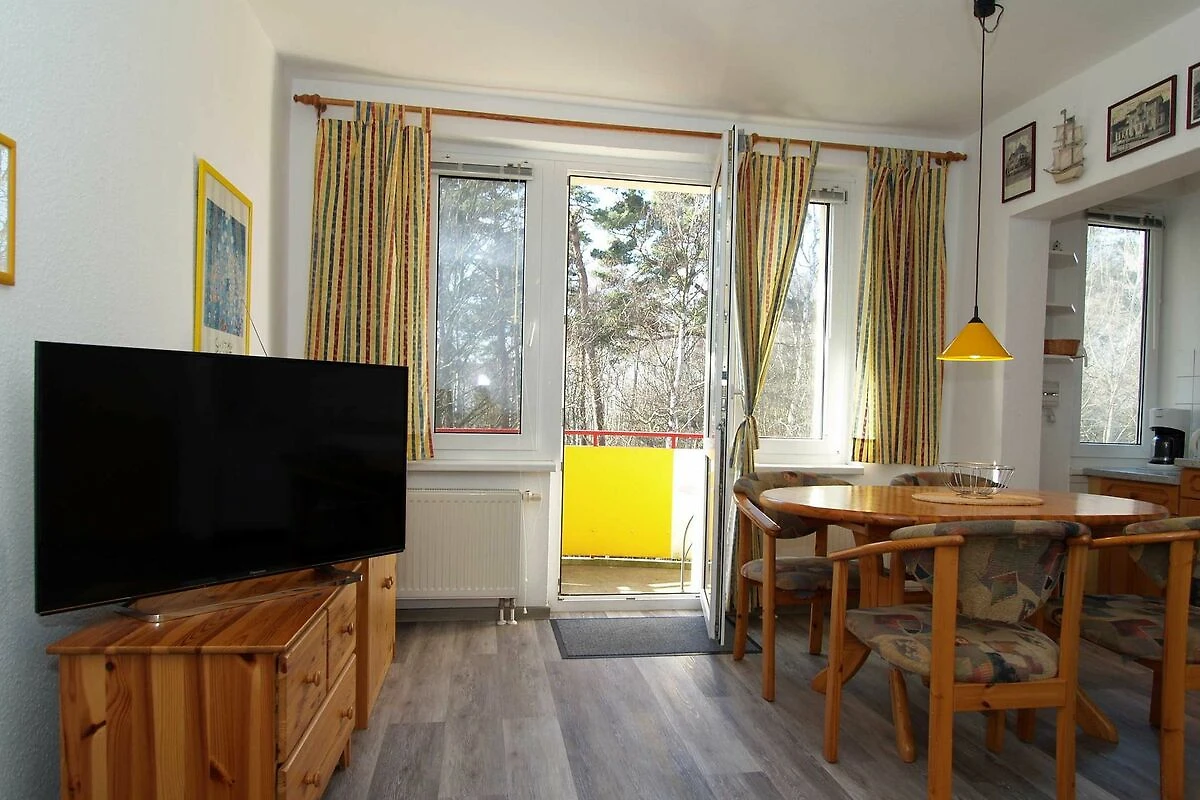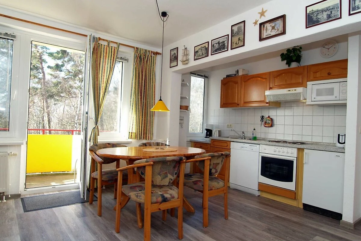 Der gemütliche Wohnraum ist ausgestattet mit einer Wohnlandschaft und einem 39-Zoll-Flachbild-TV. Der angrenzende Essbereich bietet Ihnen reichlich Platz für gemeinsame Mahlzeiten. Die offene Küchenzeile hält für Sie alle wichtigen Küchengeräte und -utensilien bereit, die Sie für Ihr perfektes Dinner benötigen: Ein 4-Platten-Herd mit Dunstabzug, ein Backofen, ein Kühlschrank mit Gefrierfach, ein Geschirrspüler sowie Mikrowelle befinden sich in der Küche. Eine Kaffeemaschine, ein Wasserkocher und ein Toaster sowie genügend Koch- und Essgeschirr vervollständigen die Kücheneinrichtung. Vom Wohnraum betreten Sie den möblierten West-Balkon, der zu langen Abenden zu einem Glas Wein und romantischen Sonnenuntergängen einlädt. Seitlich können Sie von hier auch einen Blick auf die Ostsee erhaschen.