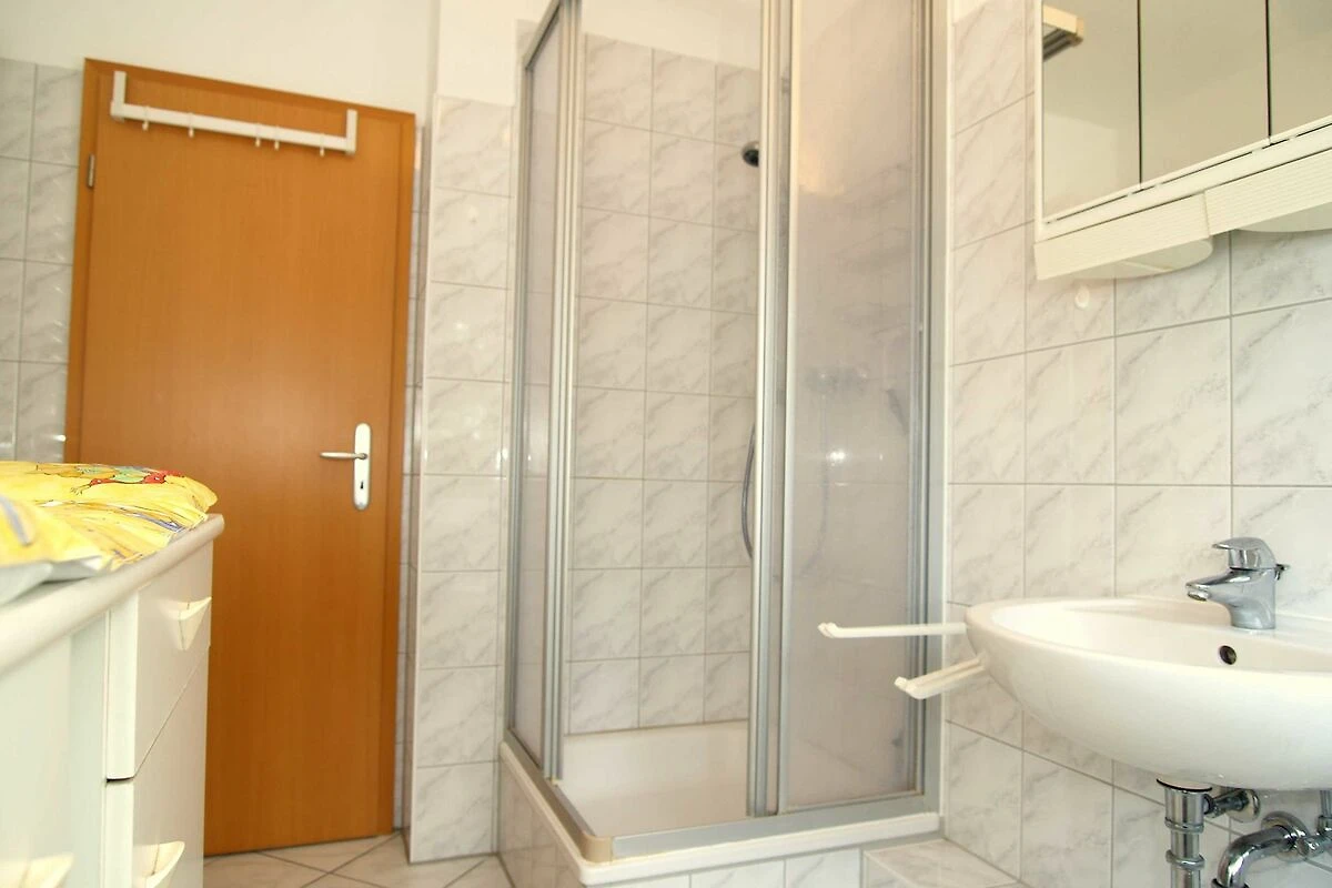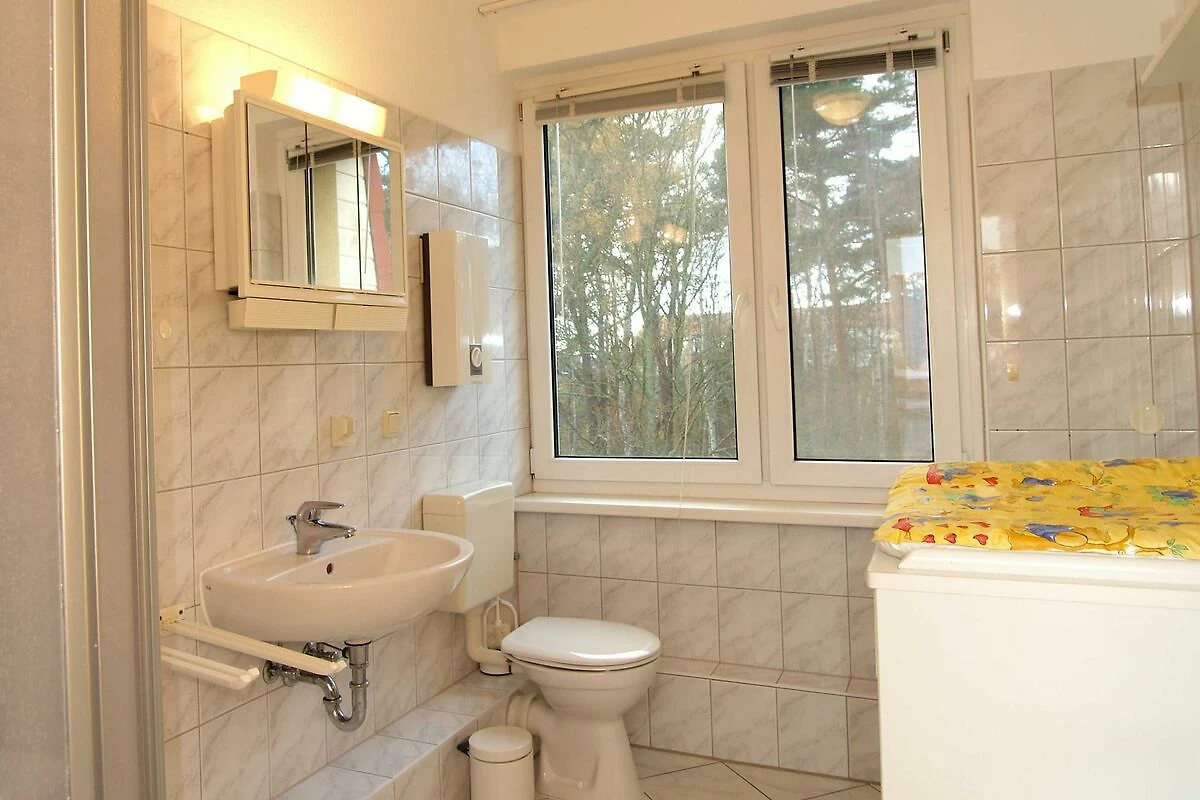 Das geflieste Tageslichtbad mit Dusche, WC und Wickeltisch vervollständigt das Gesamtbild dieser Wohnung.