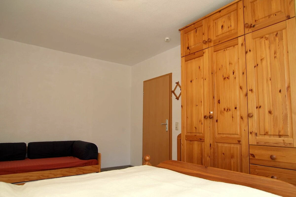 Im Schlafzimmer laden Sie ein komfortables Doppelbett (2 x 90cm x 200cm) sowie ein ausziehbares Kojenbett (2 x 90cm x 200cm) zur Nachtruhe ein. Der grosszügige Kleiderschrank bietet genügend Platz für Ihre Urlaubsgarderobe. Als Sichtschutz bzw. zum Verdunkeln sind Vorhänge an den Fenstern angebracht.