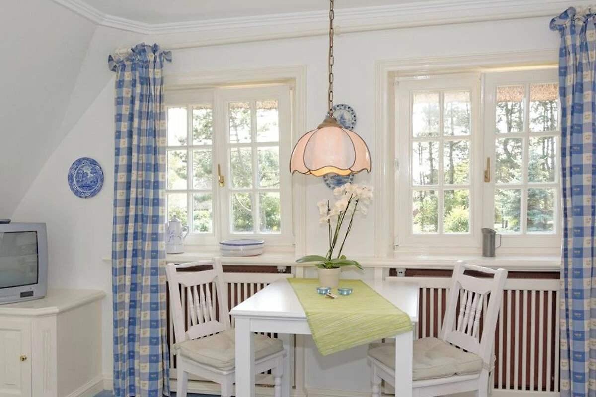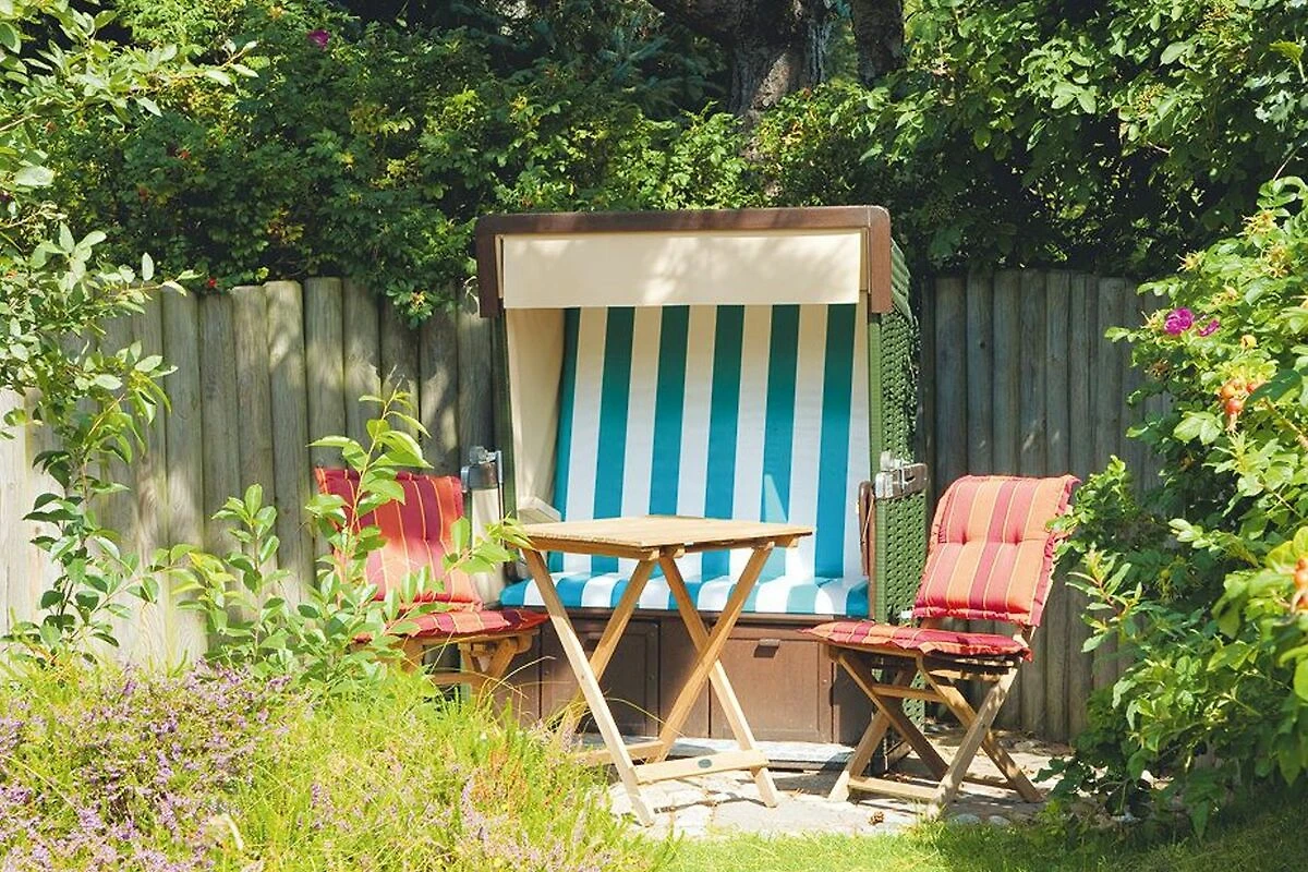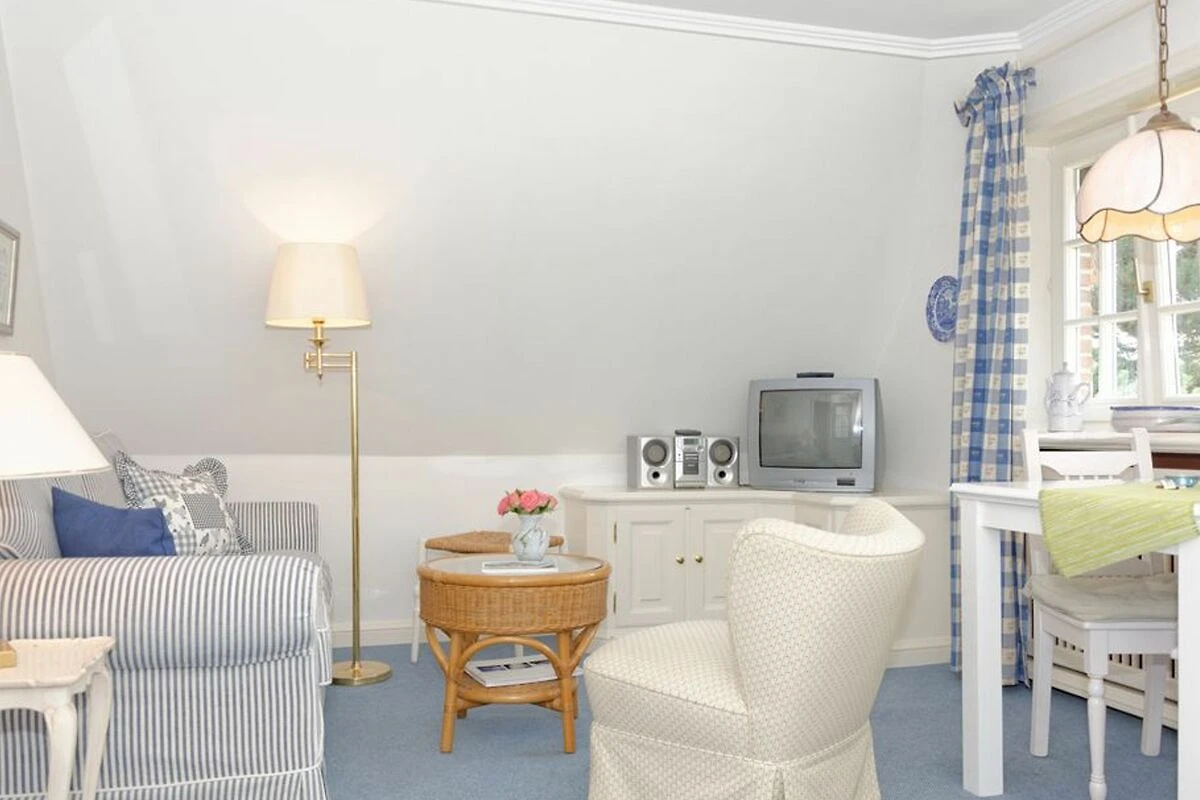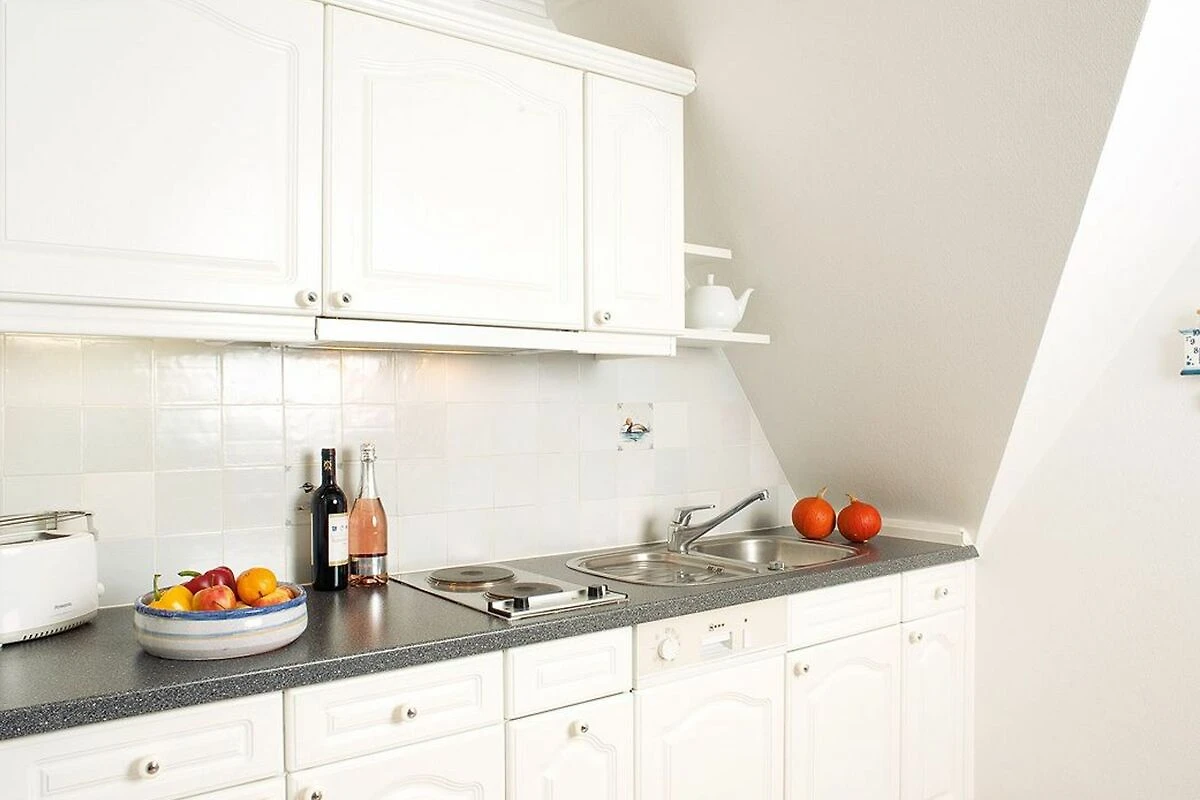 Unweit der Dünen, im ersten Stock eines klassischen Reetdachhauses, bietet dieses Appartement Strand- und Wattläufern ein passendes Refugium. Der Farbakzent der zweckmässig-gemütlichen Ausstattung im Wohnbereich ist Friesischblau. Die kleine offene Küche im rustikalen Landhausstil verfügt über zwei Herdplatten und eine Geschirrspülmaschine. Das Duschbad in Marmoroptik erlaubt einen schönen Gartenblick. Das Schlafzimmer ist mit einem Doppelbett und einem kleinen Schreibtisch ausgestattet. Geräumige Schränke bieten die Tischlereinbauten im Flur. Das I-Tüpfelchen ist die eigene Gartenecke mit Strandkorb. Vom Enenhoog führt Sie ein herrlicher Spaziergang über die alte Inselbahntrasse in 10 Minuten an den Strand.