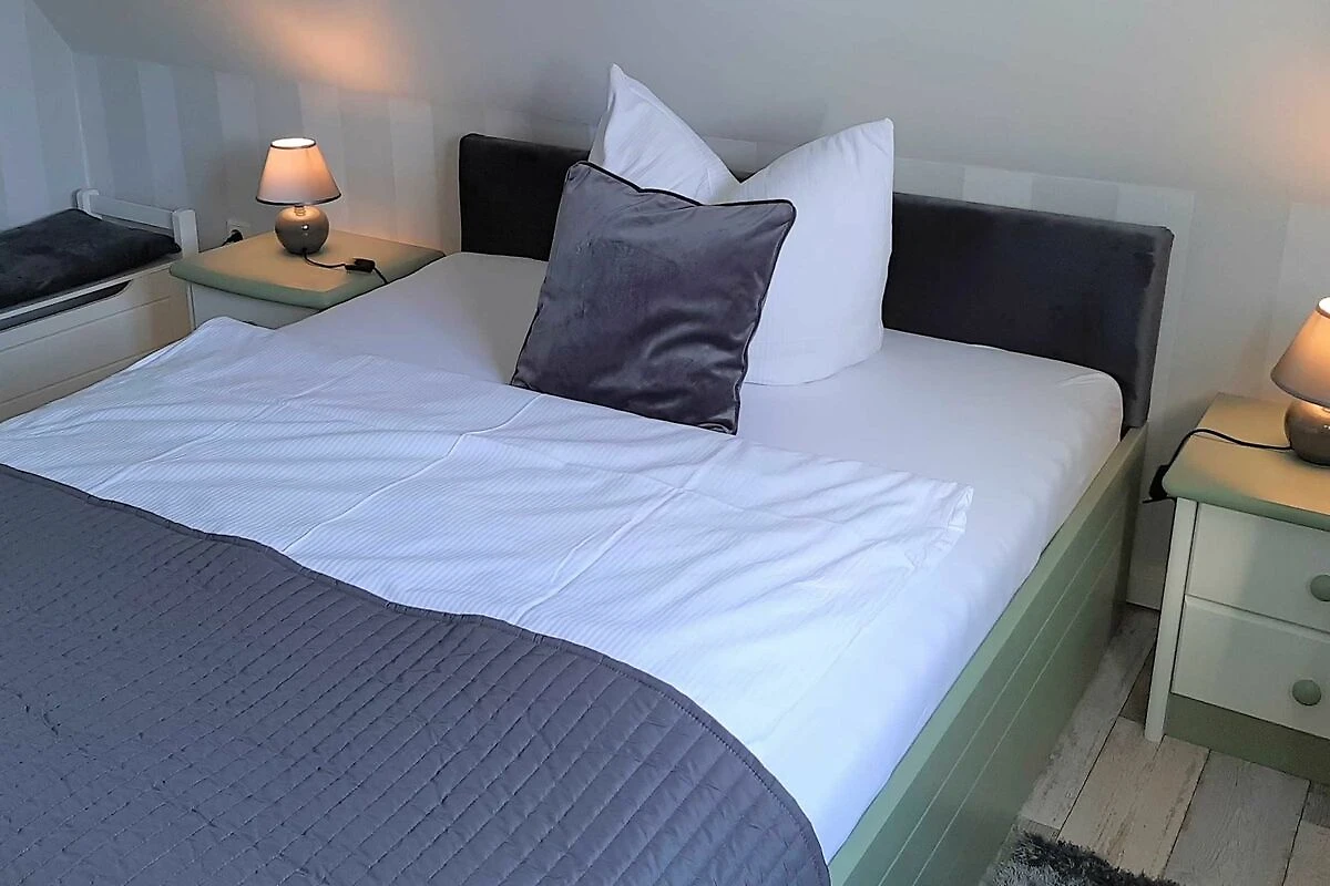Über eine Raumspartreppe gelangen Sie in das Schlafzimmer unterm Dach mit TV. Für kleine Kinder und gehbehinderte Gäste ist die Treppe nicht gut geeignet.