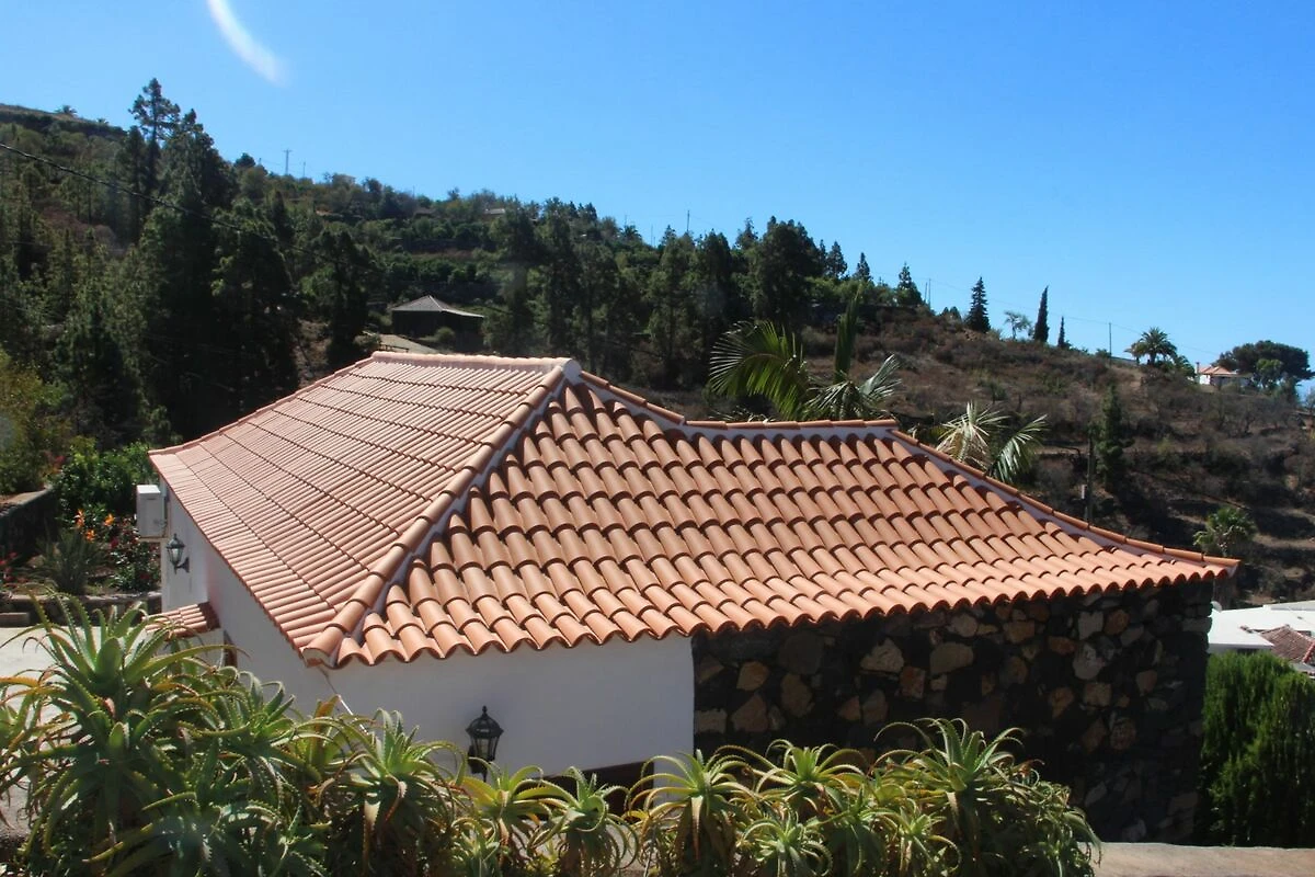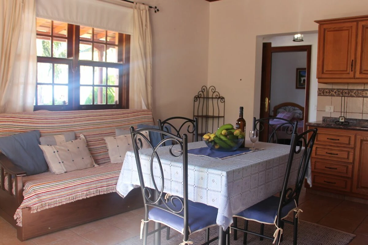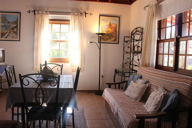 Das typisch kanarische Holzgiebeldach wurde in allen Räumen erhalten und schafft ein gemütliches Ambiente.  Die Einrichtung im Landhausstil passt gut zum taditionellen Charakter des Hauses.  Direkt am grossen Fenster im Wohnzimmer steht eine Couch, die auch als Schlafcouch genutzt werden kann. Gegenüber befindet sich ein kleiner Fernseher.