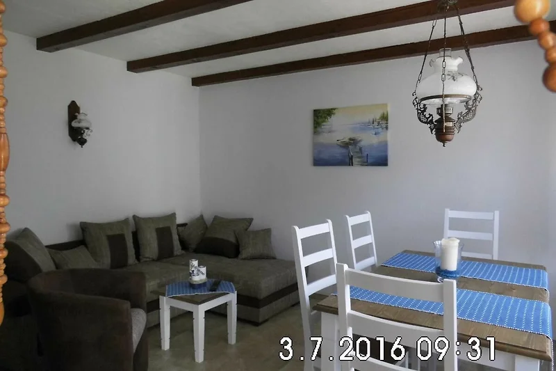 Weiter gehts in den Wohn-Essbereich. Die Eckcouch lädt zum kuscheln ein. Der TV- Flachbildschirm und ein Radio mit CD bringen die richtige Stimmung dazu. Am grossen Esstisch kann man die Zeit mit Karten- oder Brettspiele, die sich im Ferienhaus befinden, verbringen.