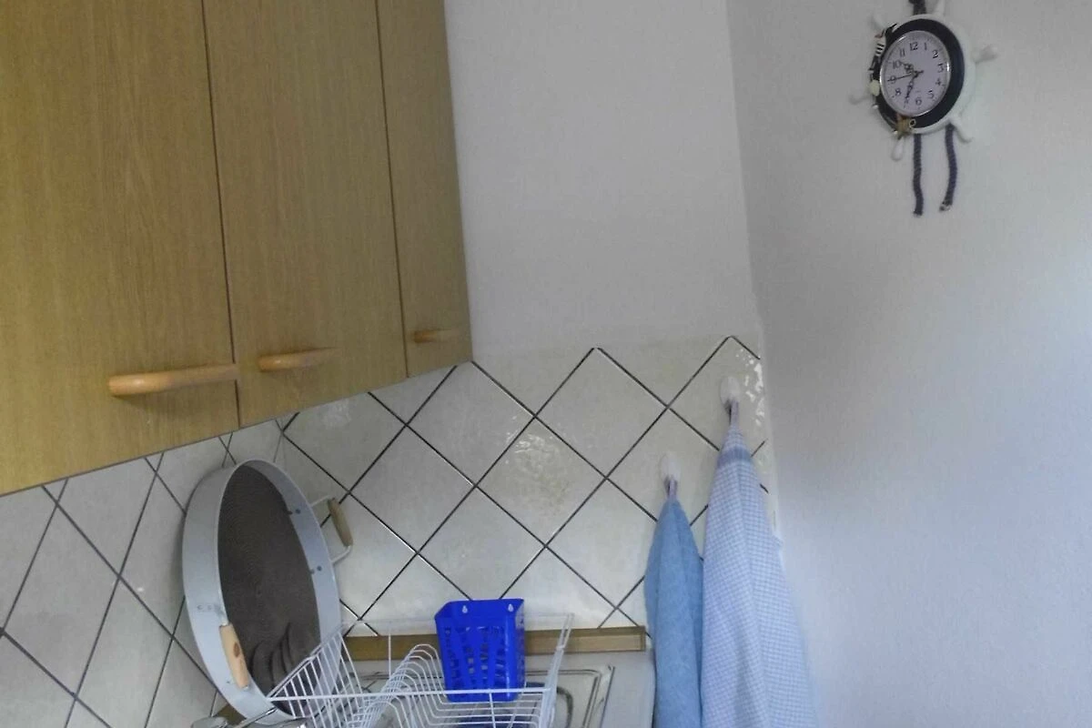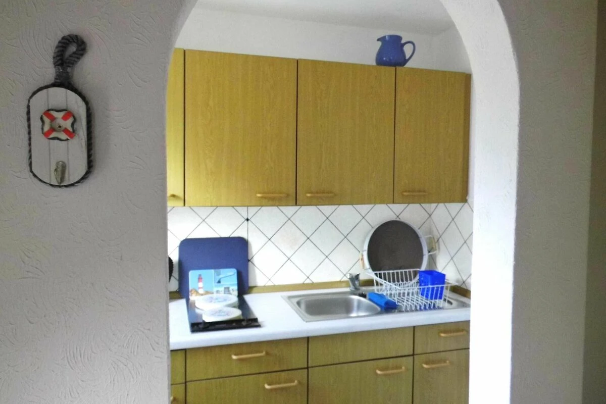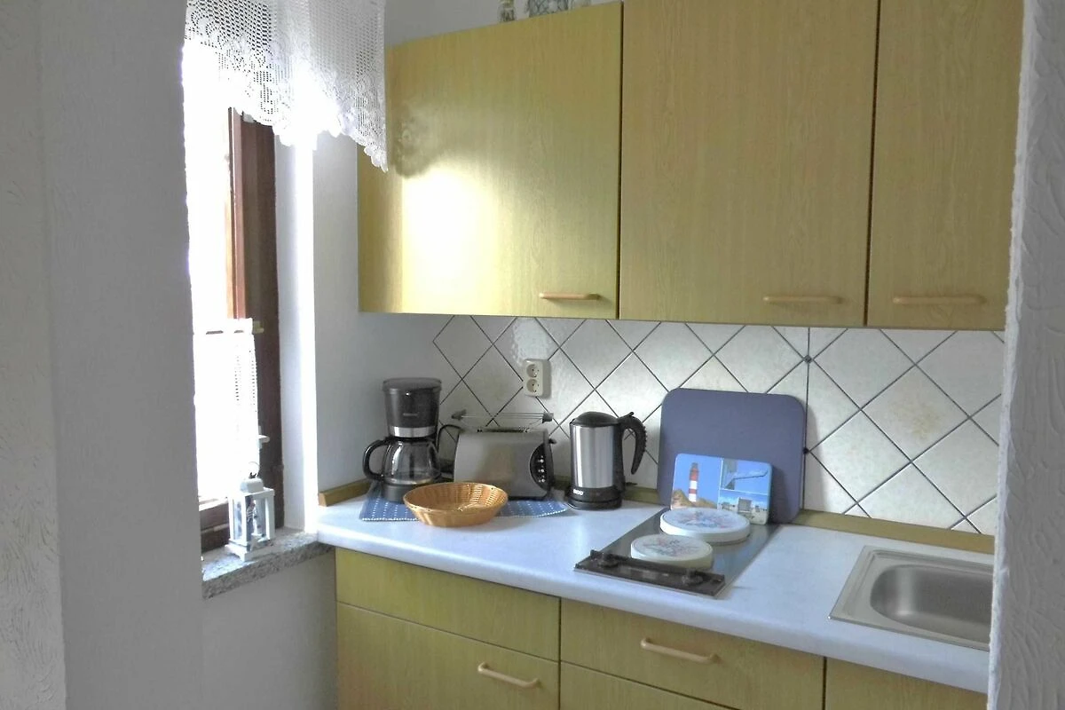 Wenn Sie in das Häuschen eintretten, kommen Sie in ein hellen gefliessten Flur. Von hier schaut man in die offene Küche. Dort finden Sie folgende Ausstattung vor: Mini-Backofen, Wasserkocher, Toaster, Kaffeemaschine+Filter,Kühlschrank, zwei Kochplatten, Geschirrhandtücher, Lappen, Spülmittel und was man so in der Küche braucht sind vor Ort.