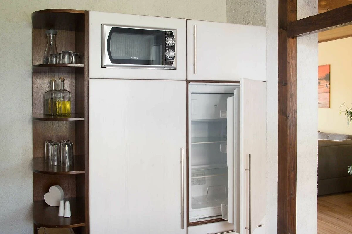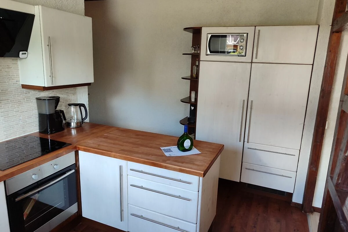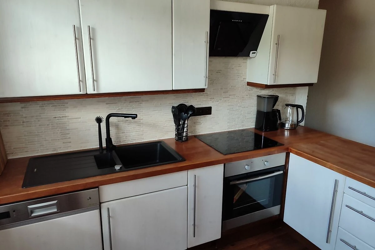 Die Küche (mit kleinem Balkon ) ist perfekt ausgestattet: Vom Backofen, Geschirrspüler, bis hin zum Wasserkocher, Toaster und Mikrowelle bietet die Küche Selbstversorgern jeden Komfort.
