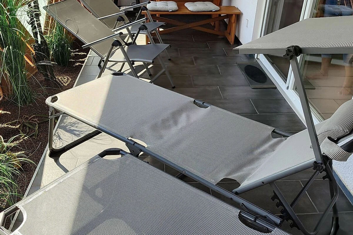 Das Wohnzimmer ist mit gedeckten Farben eingerichtet. Helle und abgestimmte Töne dominieren. Gepflegte Böden, Vorhänge und Leuchten machen die Unterkunft sehr wohnlich. Eine Sofa-Garnitur, eine Essecke im toskanischen Stil und ein Flachbild-TV (mit FireStick) erwarten Sie im Wohnzimmer. Der Südbalkon ist möbliert mit rückengerechten XXL-Sonnenliegen, Relax-Sesseln, Sonneschirm, Essgarnitur und Grillmöglichkeit.