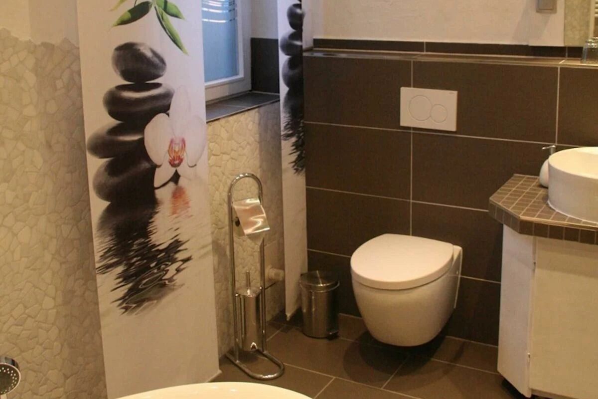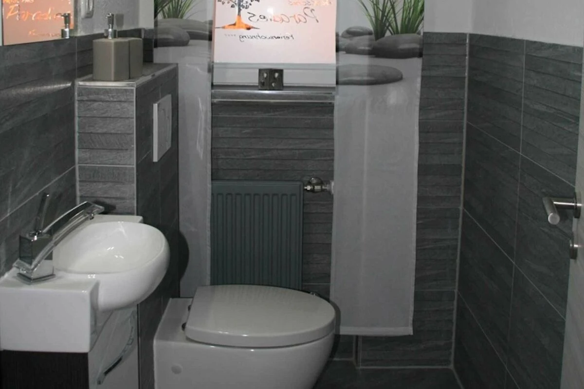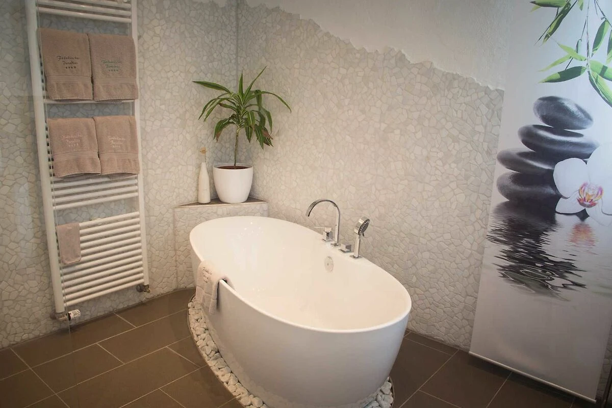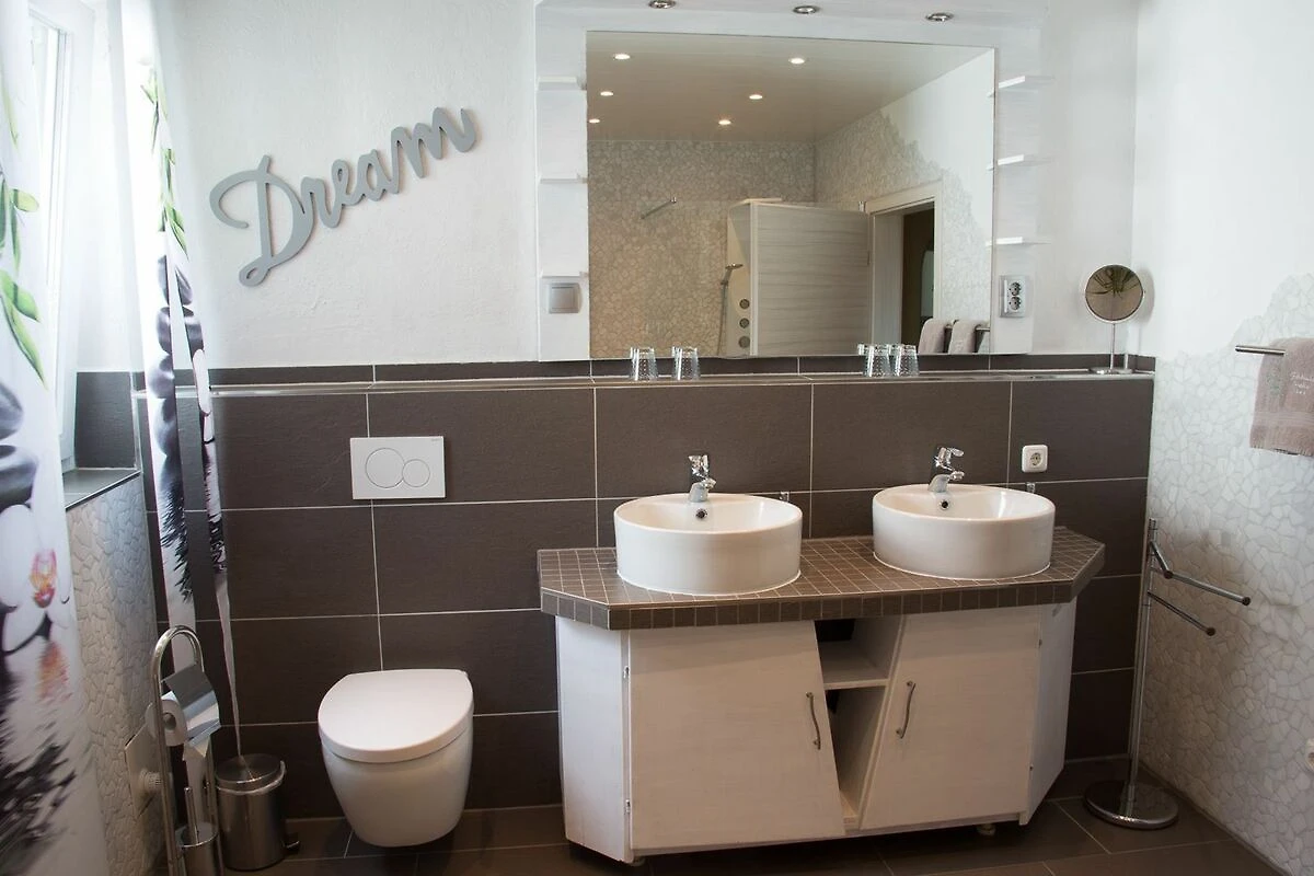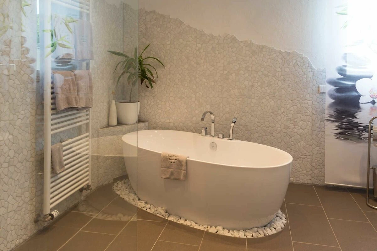 Im neuen Badzimmer finden Sie alles, was Sie zum frisch machen benötigen: Zwei Waschbecken, WC, freistehende Badewanne, Walk-in-Dusche und Handtücher stehen dort für Sie bereit. Gerade bei einer Belegung mit mehreren Personen ist mit Sicherheit das separate Gäste-WC ein kleiner Luxus.