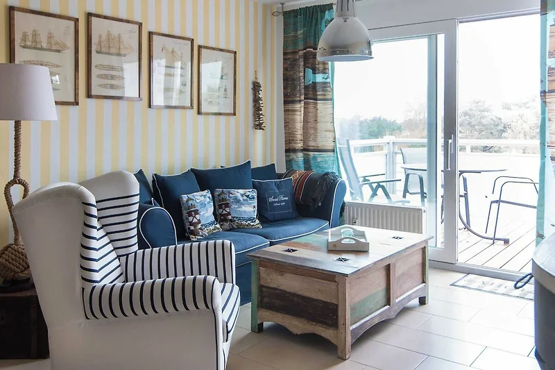 Der Wohnbereich ist mit maritimen Möbeln, einer Couch mit passendem Sessel und TV ausgestattet.
