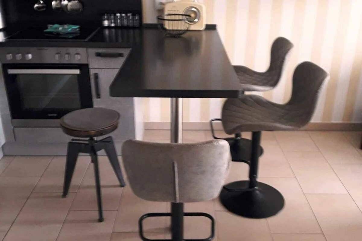 Vom Eingangsbereich betreten Sie den Wohnbereich mit integrierter Einbauküche. Die hochwertige Einbauküche ist ausgestattet mit Ceranfeld, Backofen, Geschirrspüler, Kühlschrank mit Gefrierfach, Mikrowelle, Kaffeemaschine, Wasserkocher, Toaster und selbstverständlich ausreichend Geschirr und Besteck. Am Esstisch können bequem 3 Personen Platz nehmen.