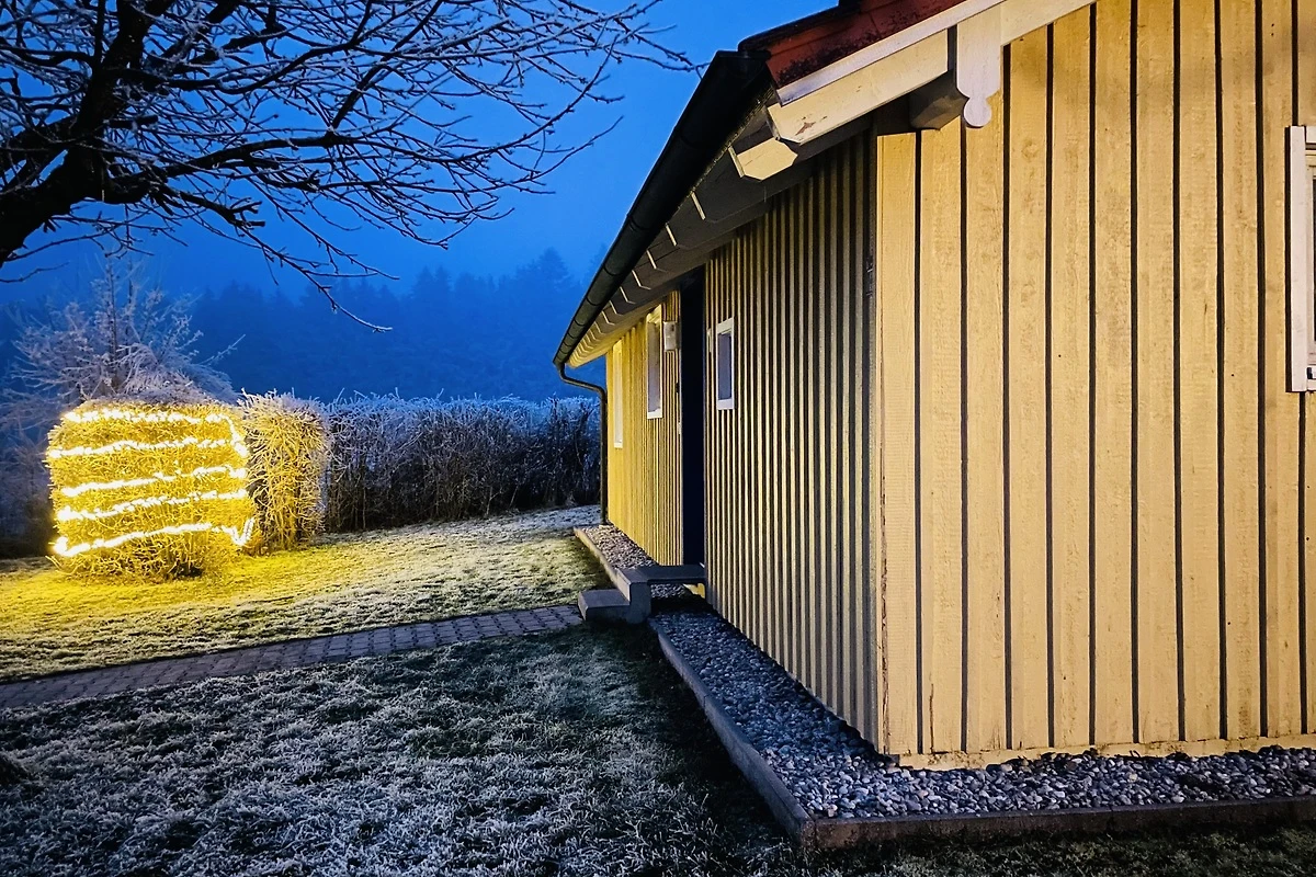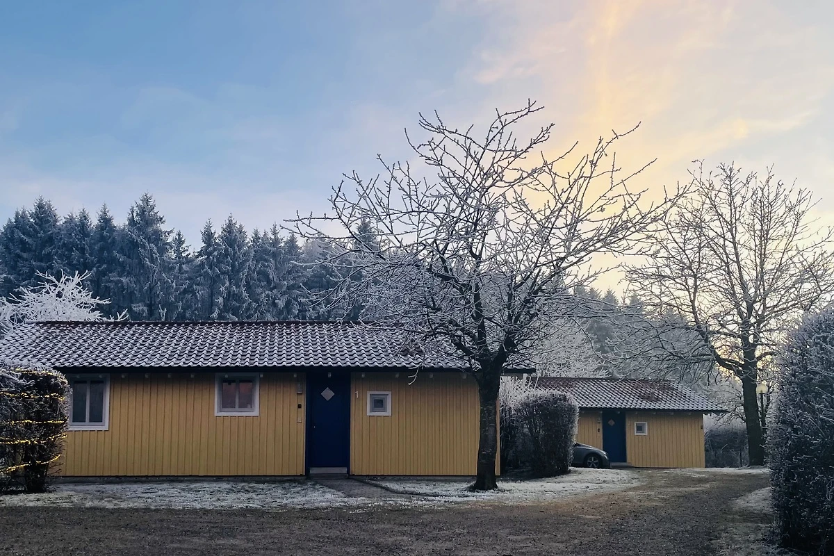 Unsere liebevoll gestalteten Holzhäuschen bezaubern mit ihrer gelben Fassade und den blauen Türen. Sie sind der perfekte Rückzugsort für alle, die eine erholsame Auszeit inmitten der Natur suchen. Jedes Haus ist liebevoll eingerichtet und bietet alles, was es für einen entspannten Aufenthalt braucht: eine voll ausgestattete Küche mit Herd, Backofen, Mikrowelle und Kühlschrank sowie ein einladendes Wohnzimmer mit gemütlicher Sitzecke und Flachbild-TV. Der eigene eingezäunte Garten sorgt für Privatsphäre und bietet Hunden einen sicheren Platz zum Toben. Hier wird Gemütlichkeit GROßGESCHRIEBEN - ideal für Erholungssuchende, Naturliebhaber und Hundebesitzer!