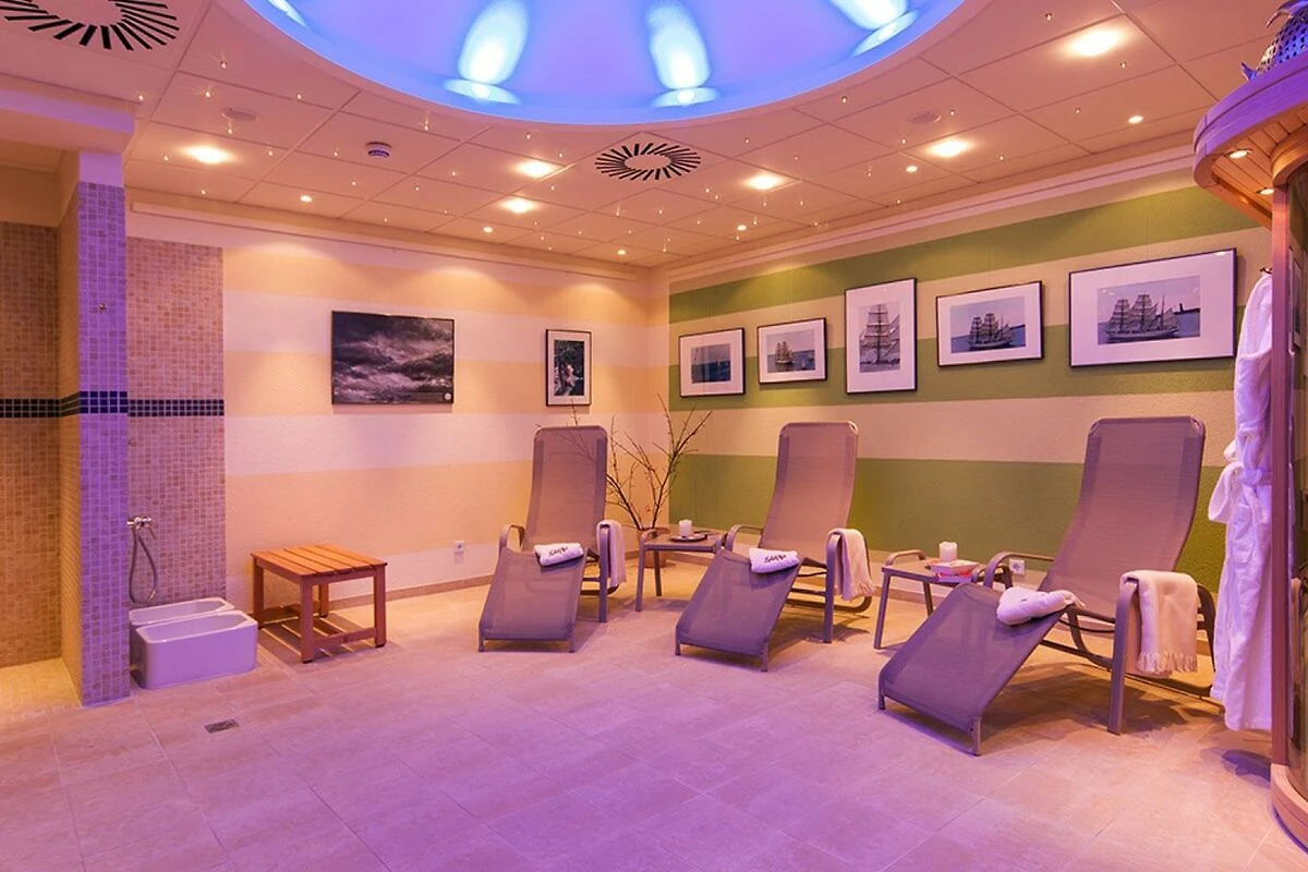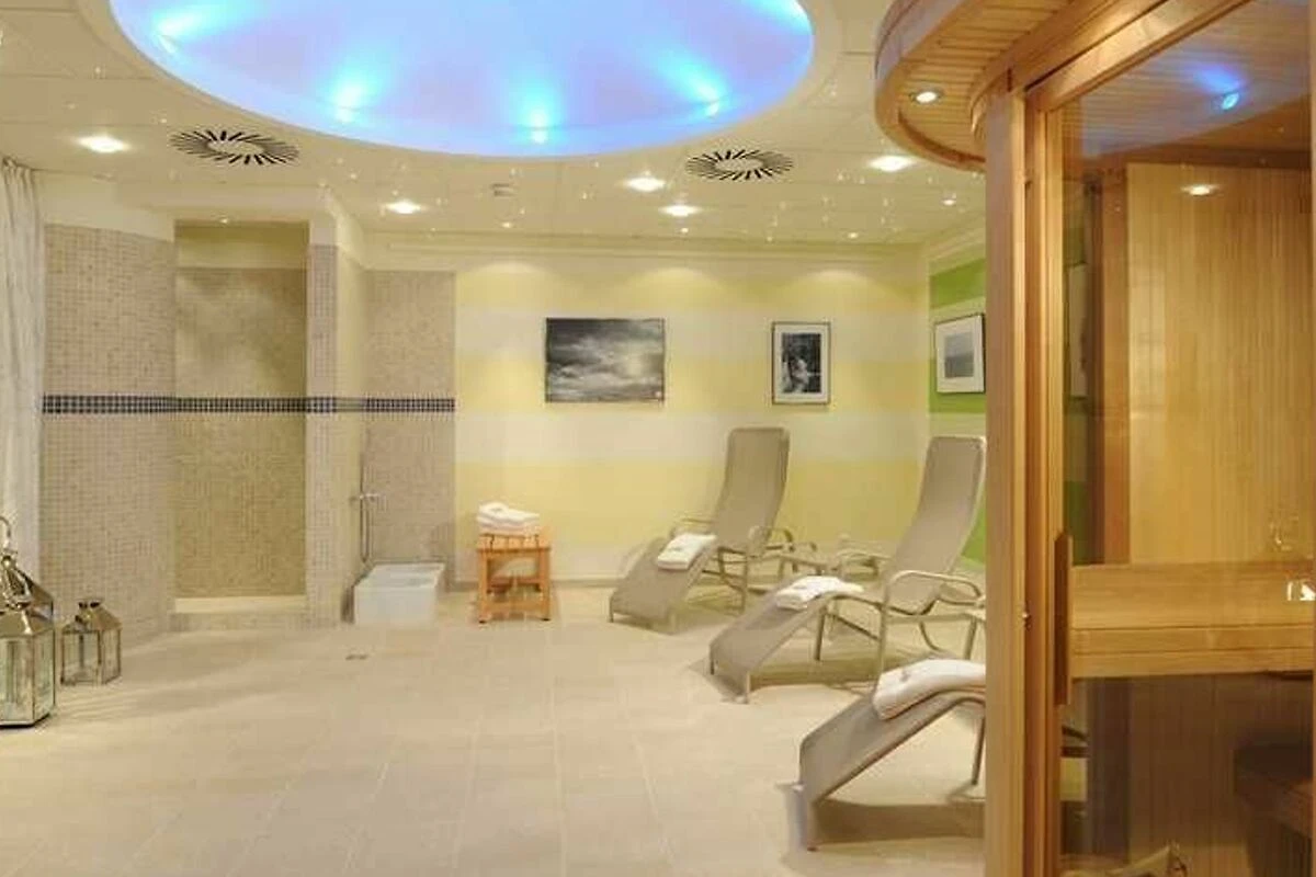Saunabereich mit ausreichend Platz für 4 Personen, Dusche, Kneipp-Fussbäder, Ruheliegen, Ruhesessel