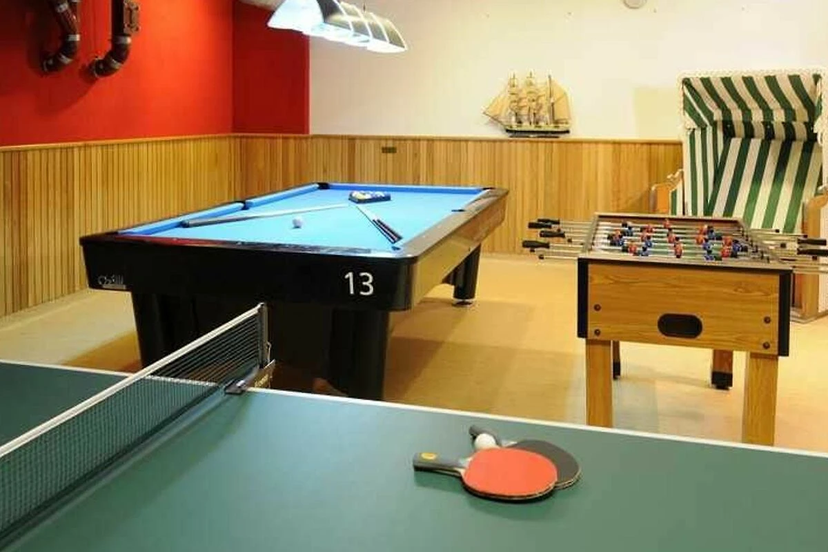 Freizeitraum mit Poolbilard (Turniertisch), Tischtennis, Tischkicker, Dartscheibe, Indoor-Torwand, Geselschaftsspiele und Spielzeug
