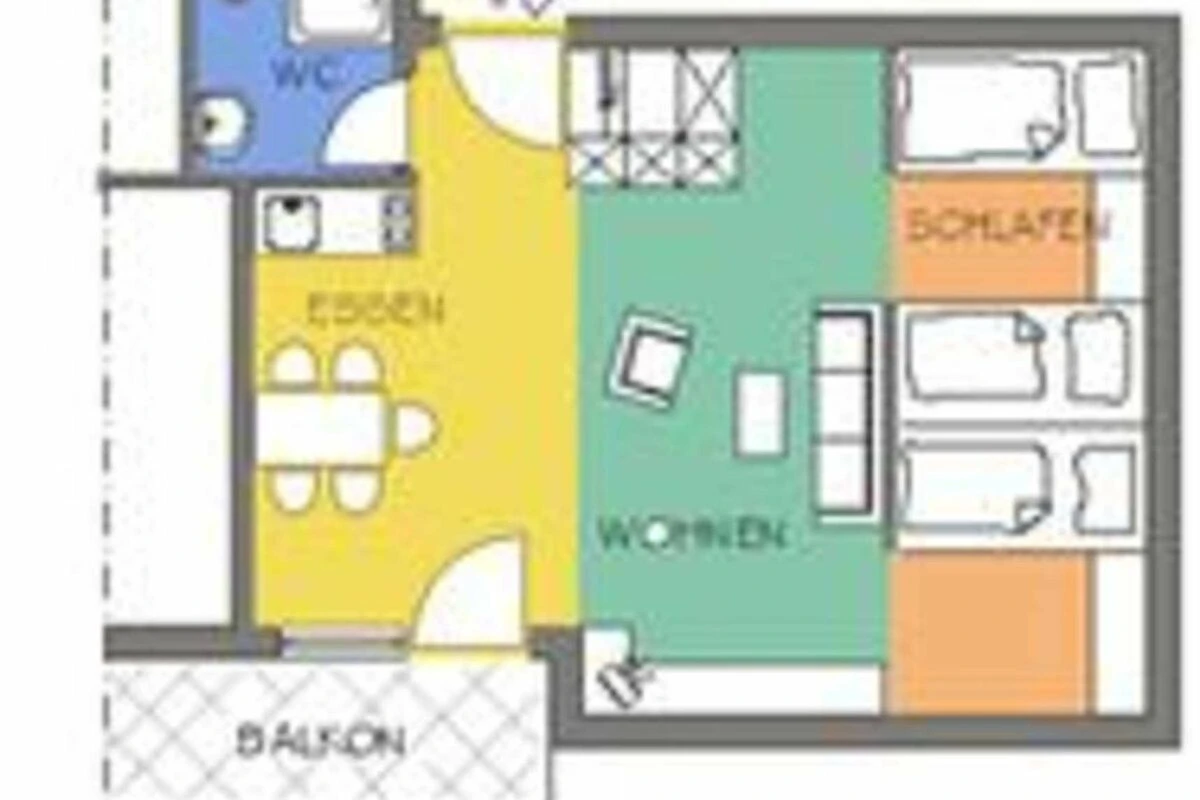 Kleine (35qm), gemütlich eingerichtete Wohnung mit Wohn-Schlafraum im 2. Stock mit optisch abgetrenntem Schlafbereich, Miniküche, DU/WC und Ostbalkon.