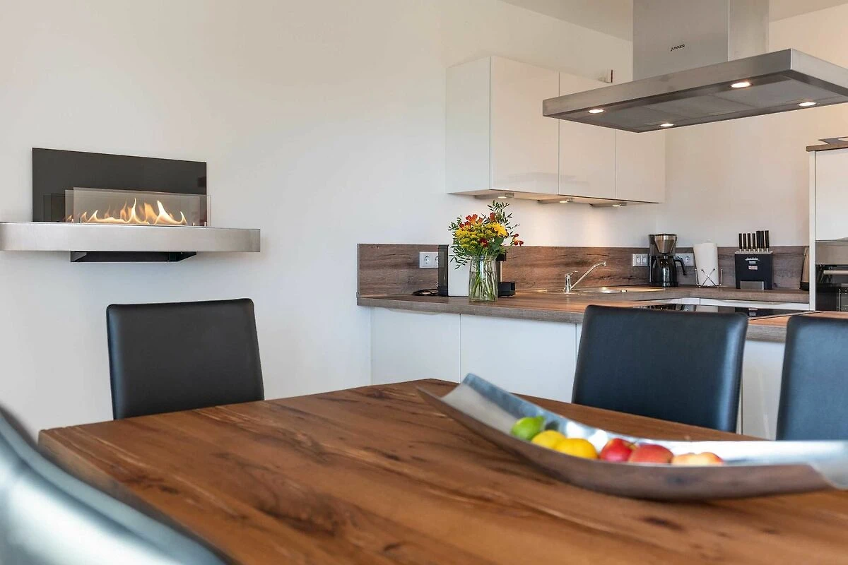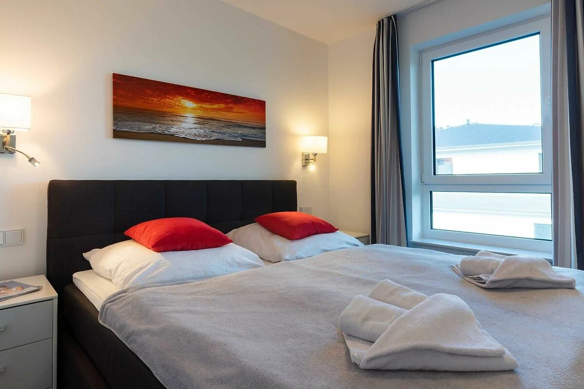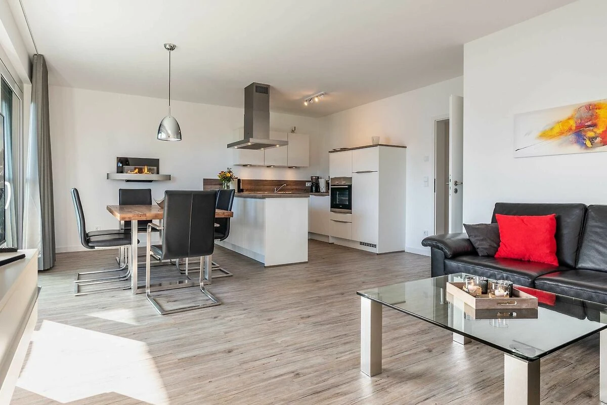 Diese lichtdurchflutete, helle 4-Zimmer-Wohnung im obersten Geschoss von Haus 2 (Aufzug vorhanden) mit Platz für maximal 6 Personen verfügt über eine Wohnfläche von 94 m² und hat 3 Schlafzimmer sowie 2 voll ausgestattete Duschbäder. Die grosse Sonnenterrasse mit 17 m² liegt in idealer Süd-Ausrichtung. Die Wohnung ist modern eingerichtet mit offenem Wohn-Essbereich, grossem Esstisch, Ledersofa sowie Flat-TV (inkl. Sky-Abo). Die hochwertig ausgestattete Küche, offen zum Wohnbereich, lässt keine Wünsche offen. Erholsamer Schlaf in den beiden Schlafzimmern mit Boxspringbetten und Flat-TV ist garantiert. Im dritten Schlafzimmer befindet sich ein bequemes Schlafsofa (Liegefläche: 1,60 x 2,00 m), Schreibtisch und ein Flat-TV. Auf dem grossen, überdachten Sonnenbalkon mit Essgruppe und zwei Relax-Sesseln, Fusshockern sowie einem Sonnenschirm können Sie die Seele baumeln lassen.