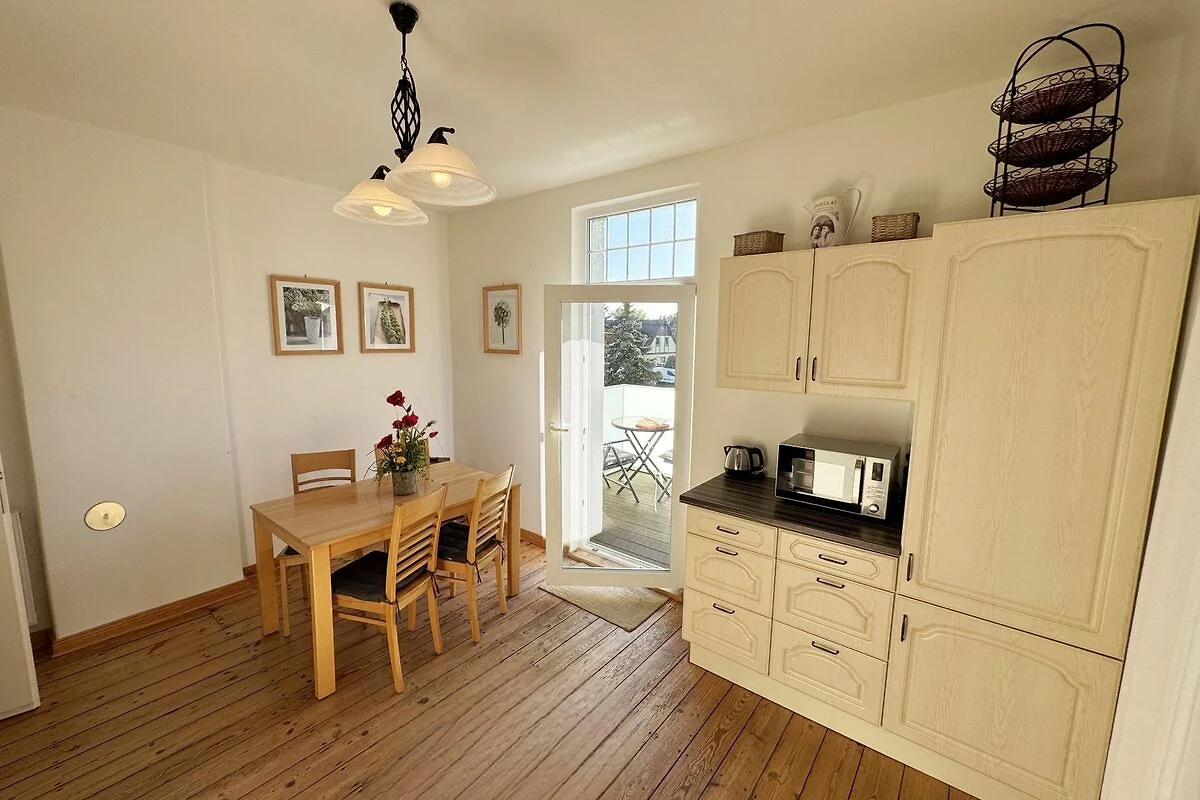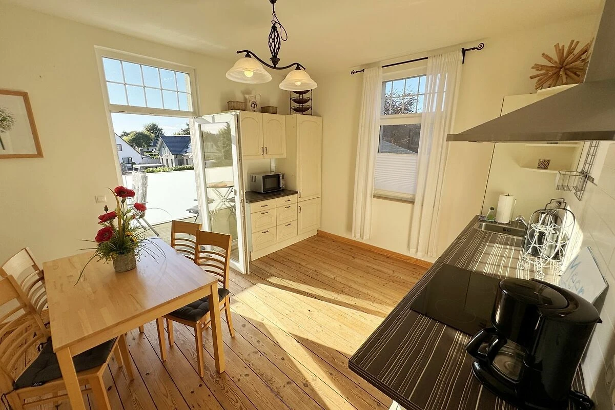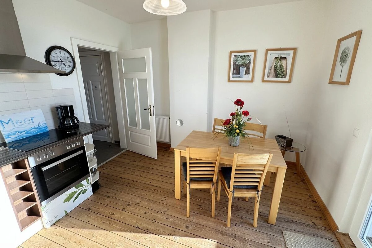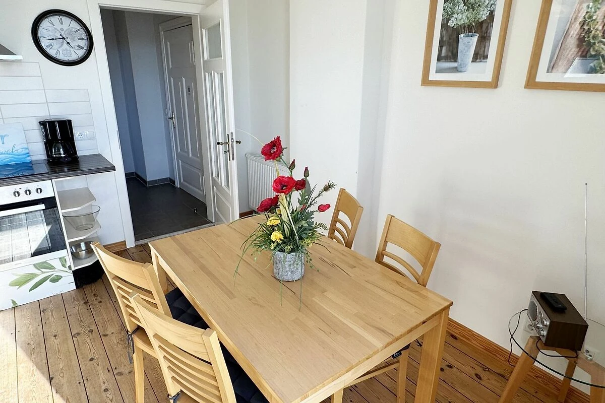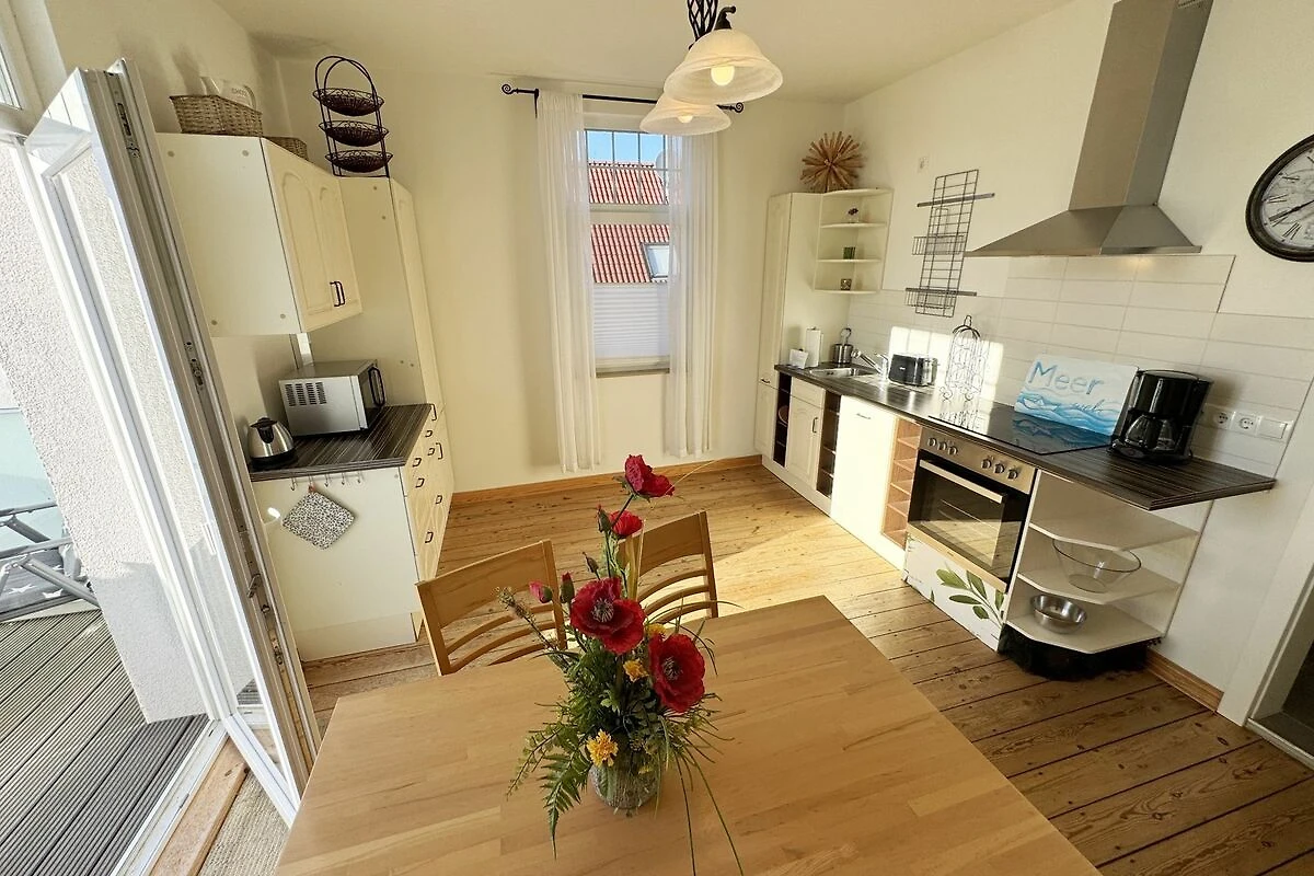 Die Ferienwohnung 3 Fischer un sin Fru umfasst ca. 60 m² und bietet Platz für max. 3 Erwachsene und 1 Kleinkind bis 3 Jahre im Kinderreisebett. Diese Wohnung befindet sich im Obergeschoss des Hauses Seestern und ist eine Nichtraucherwohnung. Sie betreten die Wohnung und ein kleiner Flur mit Garderobe bietet Platz und Stauraum. Von hier aus gelangen Sie in die geräumige Wohnküche, die mit modernen Einbaumöbeln komplett eingerichtet und voll ausgestatteten wurde, Herd mit Ceranfeld, Geschirrspüler, Kühlschrank mit Gefrierfach, Mikrowelle, Kaffeemaschine, Wasserkocher, Toaster sind ebenso vorhanden wie diverse Küchenutensilien. Hier können Sie gemeinsam Ihr Essen zubereiten. Alles was Sie brauchen steht zur Verfügung. Der Essplatz bietet Ihnen Platz zum Essen und zum Verweilen. Auch auf dem angrenzenden geräumigen und bestuhlten Balkon (West) Blick Richtung Bodden - finden Sie ausreichend Platz und können hier Ihren Strandtag in der Abendsonne in Ruhe ausklingen lassen. Eine elektrische Markise sorgt für Sonnenschutz. Im Wohnbereich mit Flachbild-TV und Radio mit Bluetooth, finden Sie einen gemütlichen Couchbereich zum Ausruhen (Aufbettungsmöglichkeit für 3. Person 1,40 m x 2,00 m) mit Couchtisch, Lesesessel, Sideboard und Leselampe. Hier schliesst sich die Veranda an, die wir zu einem Schlafzimmer mit Boxspringbett (1,80 m x 2,00 m), Kleiderschrank und Sideboard eingerichtet haben. Hier können Sie nun abends vom Bett aus die Sterne betrachten und bei Ostwind die Ostsee rauschen hören. Im Bad mit Fenster wurden hochwertige Fliesen verlegt. Dusche, Waschplatz, Spiegel, Fön, WC und Handtuchheizkörper gehören hier zur Ausstattung. Auch auf Internetanschluss (WLAN) müssen Sie im Urlaub nicht verzichten. Dieser ist inklusive für Sie. Im Wohnzimmer und in der Küche konnten wir den alten Dielenboden erhalten und aufarbeiten. Insektenschutzgitter und Verdunklungsmöglichkeiten sind vorhanden. 2 Haustiere sind gegen eine Gebühr willkommen. Eine Waschmaschine und ein Trockner stehen allen Gästen gegen Gebühr zur Verfügung. Diese Räumlichkeiten befinden sich auf der Hofseite. Für unsere kleinen Gäste stehen je 1 Kinderreisebett (ohne Zusatzmatratze / ohne Bettinlett) und 1 Hochstuhl pro Wohnung inklusive zur Verfügung. Ihr PKW-Stellplatz (Nr. 3) befindet sich auf dem Grundstück sowie ein Gemeinschaftsgrill. Die Erstausstattung eines Wäschepaketes (komplette Bettwäsche, 1 Duschhandtuch, 2 kleine Handtücher) können Sie bis 14 Tage vor Anreise gegen einen Aufpreis dazu buchen oder durch eigene ergänzen. Ab 2 gebuchten Paketen erhalten Sie einmalig 1 Geschirrhandtuch und 1 Duschvorleger hinzu.