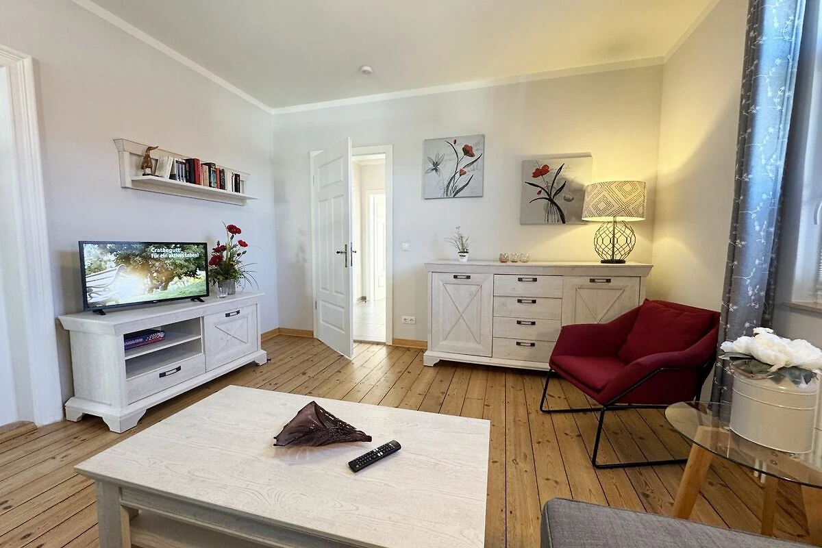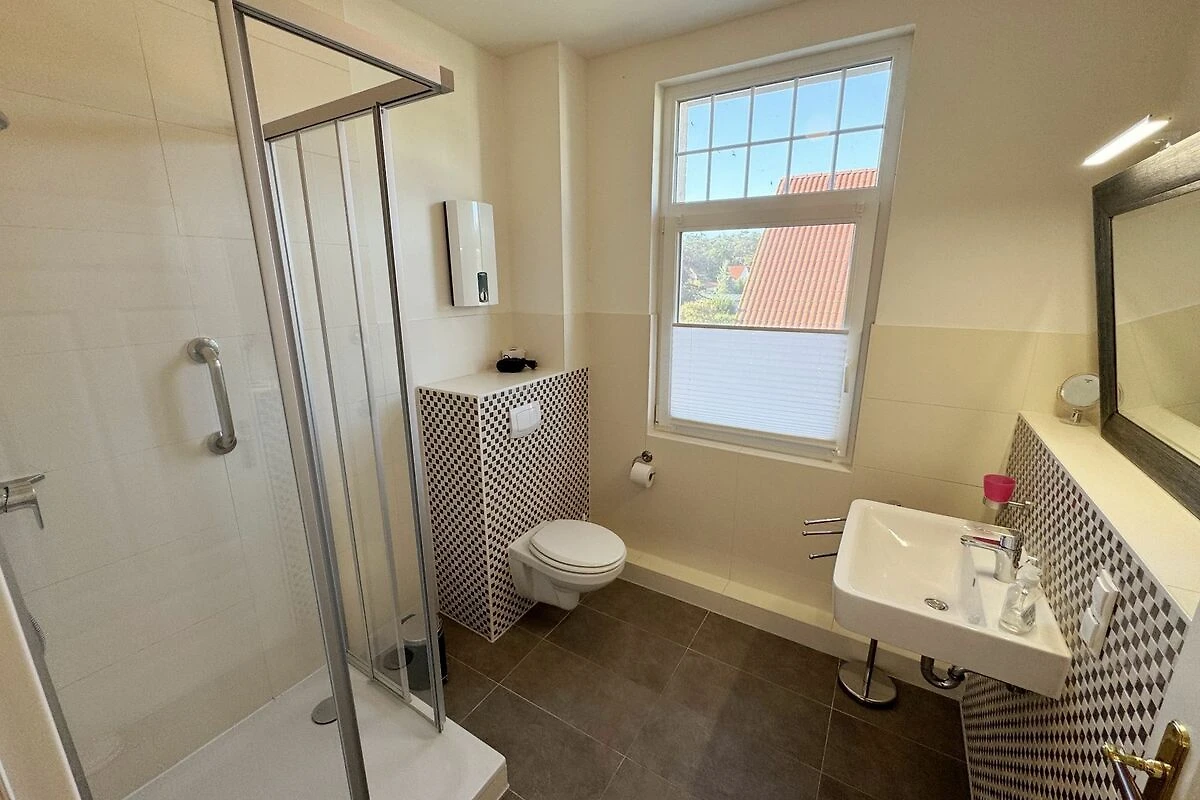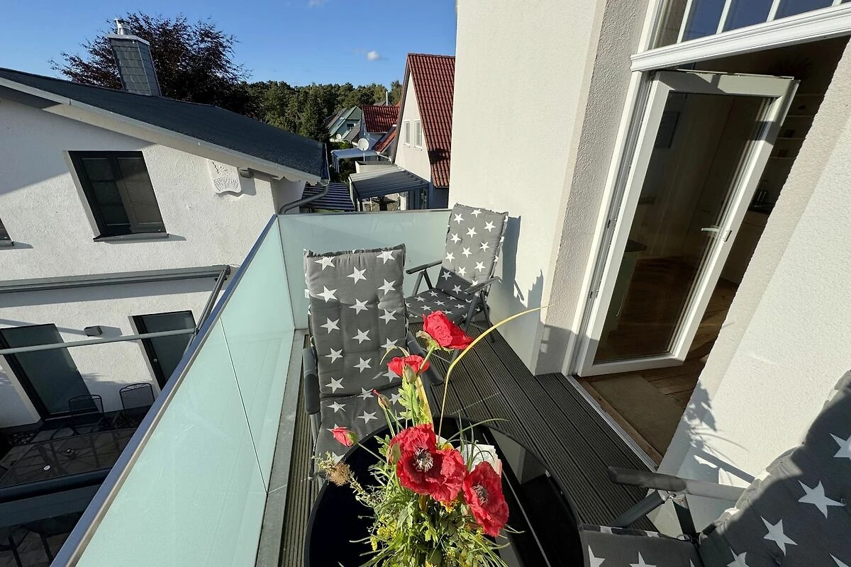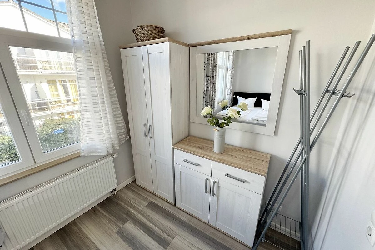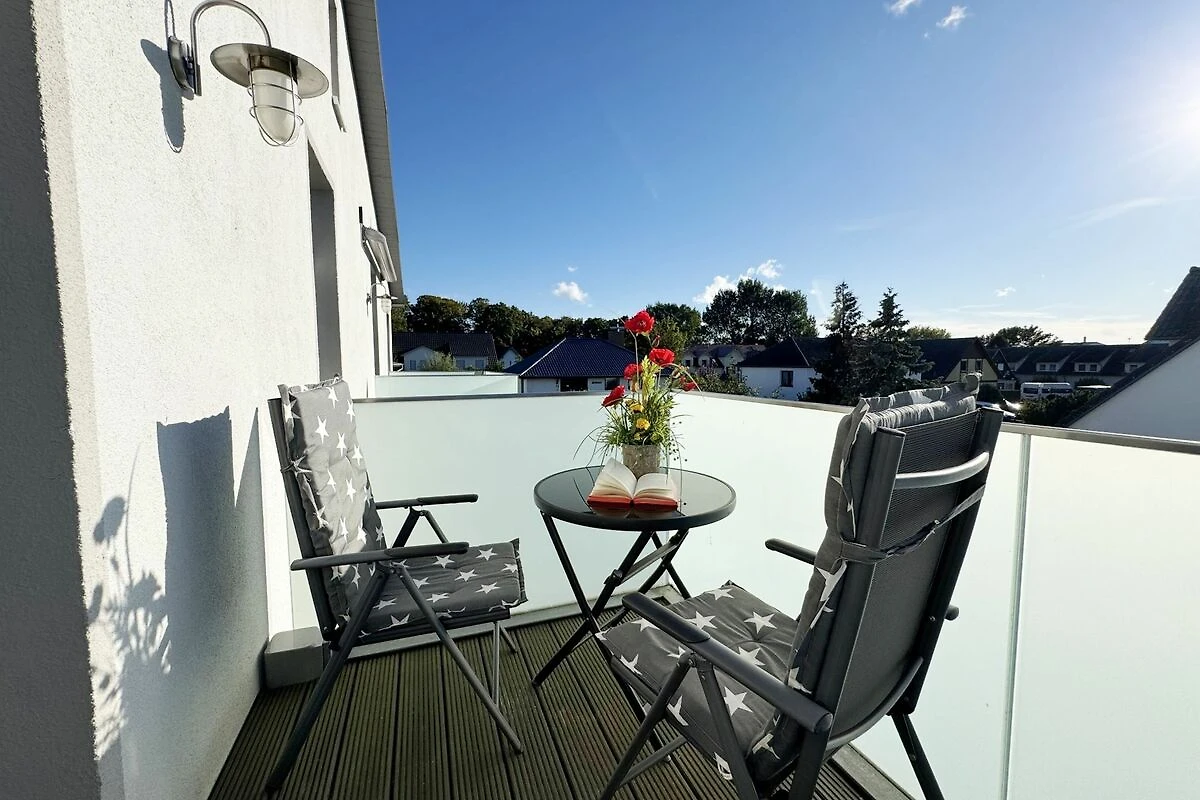 Die Ferienwohnung 3 Fischer un sin Fru umfasst ca. 60 m² und bietet Platz für max. 3 Erwachsene und 1 Kleinkind bis 3 Jahre im Kinderreisebett. Diese Wohnung befindet sich im Obergeschoss des Hauses Seestern und ist eine Nichtraucherwohnung. Sie betreten die Wohnung und ein kleiner Flur mit Garderobe bietet Platz und Stauraum. Von hier aus gelangen Sie in die geräumige Wohnküche, die mit modernen Einbaumöbeln komplett eingerichtet und voll ausgestatteten wurde, Herd mit Ceranfeld, Geschirrspüler, Kühlschrank mit Gefrierfach, Mikrowelle, Kaffeemaschine, Wasserkocher, Toaster sind ebenso vorhanden wie diverse Küchenutensilien. Hier können Sie gemeinsam Ihr Essen zubereiten. Alles was Sie brauchen steht zur Verfügung. Der Essplatz bietet Ihnen Platz zum Essen und zum Verweilen. Auch auf dem angrenzenden geräumigen und bestuhlten Balkon (West) Blick Richtung Bodden - finden Sie ausreichend Platz und können hier Ihren Strandtag in der Abendsonne in Ruhe ausklingen lassen. Eine elektrische Markise sorgt für Sonnenschutz. Im Wohnbereich mit Flachbild-TV und Radio mit Bluetooth, finden Sie einen gemütlichen Couchbereich zum Ausruhen (Aufbettungsmöglichkeit für 3. Person 1,40 m x 2,00 m) mit Couchtisch, Lesesessel, Sideboard und Leselampe. Hier schliesst sich die Veranda an, die wir zu einem Schlafzimmer mit Boxspringbett (1,80 m x 2,00 m), Kleiderschrank und Sideboard eingerichtet haben. Hier können Sie nun abends vom Bett aus die Sterne betrachten und bei Ostwind die Ostsee rauschen hören. Im Bad mit Fenster wurden hochwertige Fliesen verlegt. Dusche, Waschplatz, Spiegel, Fön, WC und Handtuchheizkörper gehören hier zur Ausstattung. Auch auf Internetanschluss (WLAN) müssen Sie im Urlaub nicht verzichten. Dieser ist inklusive für Sie. Im Wohnzimmer und in der Küche konnten wir den alten Dielenboden erhalten und aufarbeiten. Insektenschutzgitter und Verdunklungsmöglichkeiten sind vorhanden. 2 Haustiere sind gegen eine Gebühr willkommen. Eine Waschmaschine und ein Trockner stehen allen Gästen gegen Gebühr zur Verfügung. Diese Räumlichkeiten befinden sich auf der Hofseite. Für unsere kleinen Gäste stehen je 1 Kinderreisebett (ohne Zusatzmatratze / ohne Bettinlett) und 1 Hochstuhl pro Wohnung inklusive zur Verfügung. Ihr PKW-Stellplatz (Nr. 3) befindet sich auf dem Grundstück sowie ein Gemeinschaftsgrill. Die Erstausstattung eines Wäschepaketes (komplette Bettwäsche, 1 Duschhandtuch, 2 kleine Handtücher) können Sie bis 14 Tage vor Anreise gegen einen Aufpreis dazu buchen oder durch eigene ergänzen. Ab 2 gebuchten Paketen erhalten Sie einmalig 1 Geschirrhandtuch und 1 Duschvorleger hinzu.