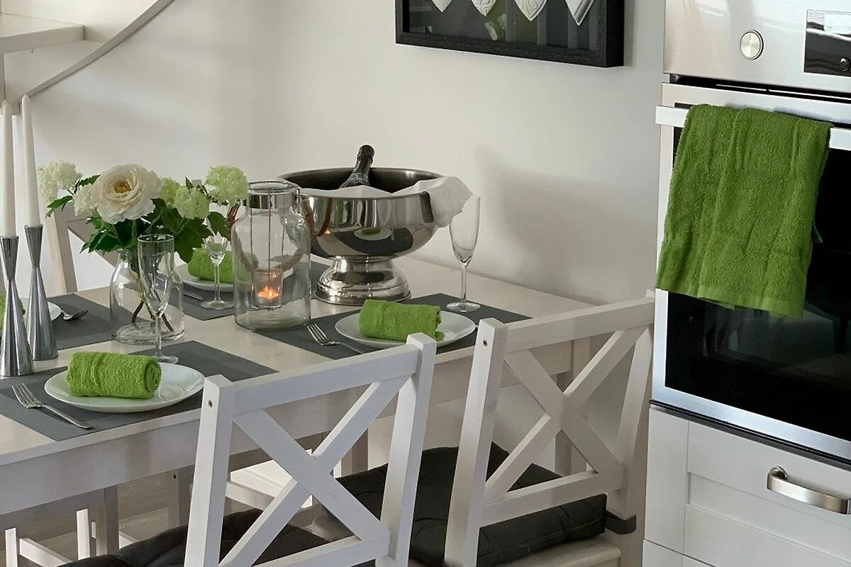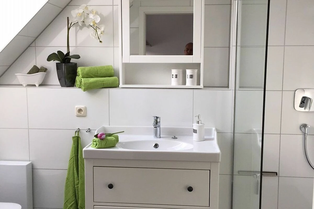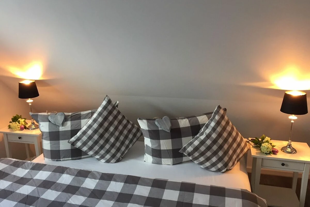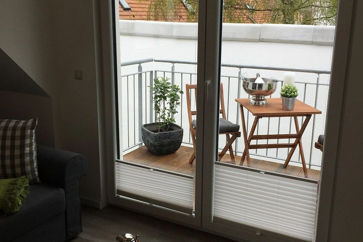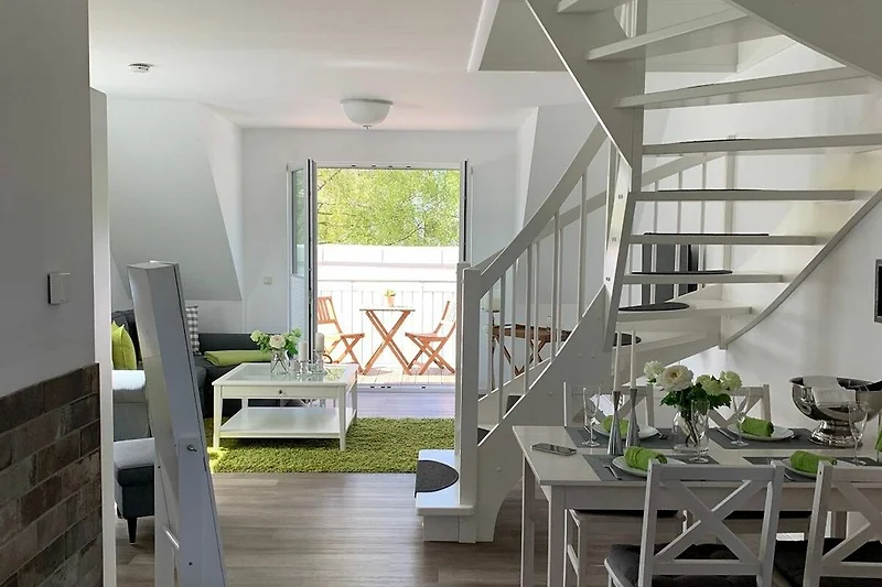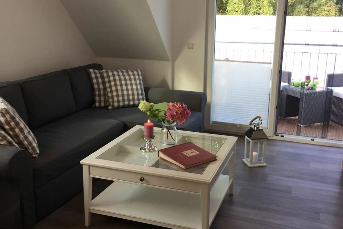 Das lichtdurchflutete Wohnzimmer mit Wohnküche ist mit einem gemütlichen Schlafsofa (Liegefläche 1,40 x 2,00 m) ausgestattet. Die grosse TV-Anlage mit Radio versüsst die nicht ganz so schönen Tage und eignet sich perfekt um Urlaubsbilder anzuschauen. Bei schönem Wetter lockt der West-Balkon mit entsprechenden Möbeln. Im Dachgeschoss befindet sich das Schlafzimmer mit Blick auf das Naturschutzgebiet Conventer See. Das grosse Doppelbett mit einer Liegefläche von 1,80 x 2,00 m ist in zwei einzelne Matratzen unterteilt. Im Zimmer befindet sich zudem eine Steckdose mit USB Aufladestation. Die offene Einbauküche ist mit Elektroherd, Backofen, Ceranfeld, Geschirrspüler, Kühlschrank mit Gefrierfach, Kaffeemaschine, Wasserkocher, Toaster und Geschirr ausgestattet. Die Wohnung kann von bis zu vier Personen gemietet werden. Das kleine Bad besticht mit ebenerdiger Dusche, geräumigem Waschtisch und Föhn.