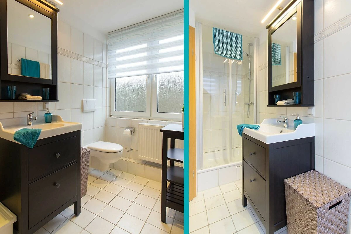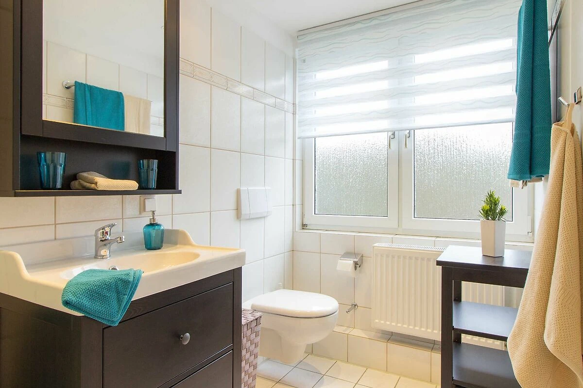 Das modern eingerichtete Badezimmer bringt Schwung für den Tag und angenehme Ruhe für die Abendtoilette.