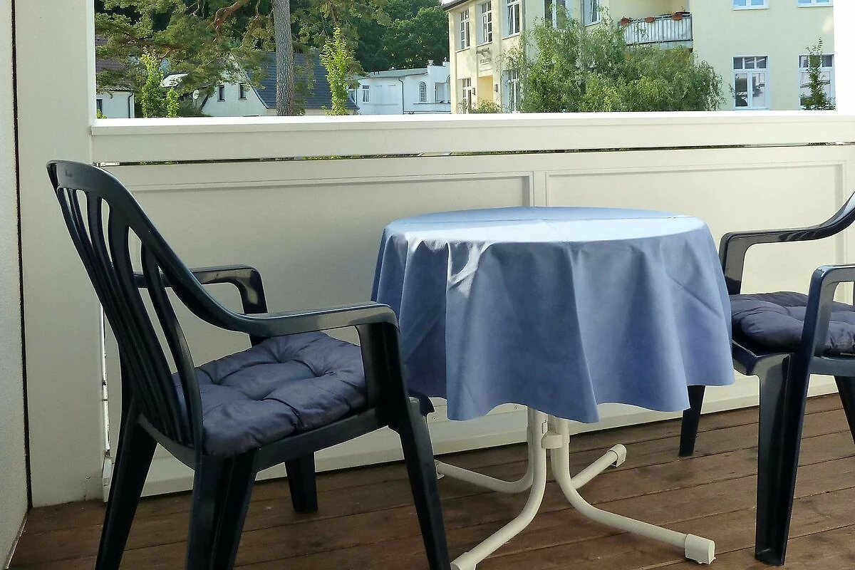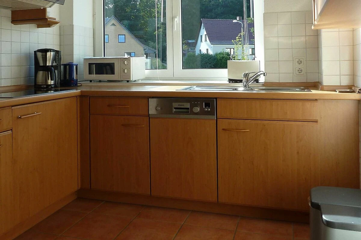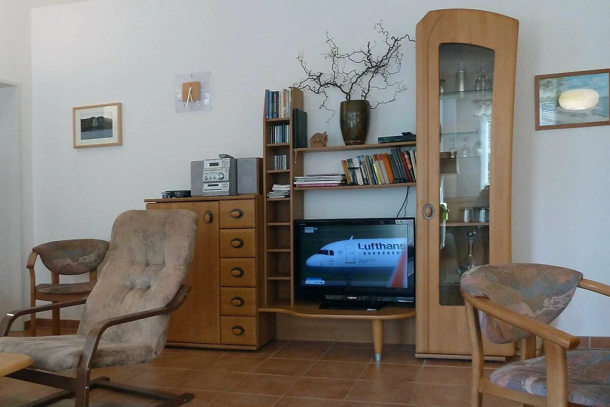 Der Wohnraum ist ausgestattet ( für 4 max. 5 Personen) mit rundem ausziehbarem Esstisch und Stühlen, einer Doppelbettcouch (nur als alternative Schlafmöglichkeit zum Kinderzimmer gedacht, eventuell für eine 3 erwachsene Person), einem kleinen Tisch und Sesseln, einem Wohnzimmerschrank mit einem 32Flachbildfernseher, Radio mit CD-Player, DVD Player blu-ray, und W-LAN zur kostenfreien Nutzung. An den Wohnraum schliesst sich eine Küchenzeile mit vierflammigem Ceranfeld, Kühlschrank mit Eisfach, Geschirrspüler, Mikrowelle, Kaffeemaschine, Wasserkocher und allen notwendigen Geschirr- und Besteckteilen. Vom Wohnraum gelangen Sie auf den Balkon (Westseite) mit Tisch und Stühlen.