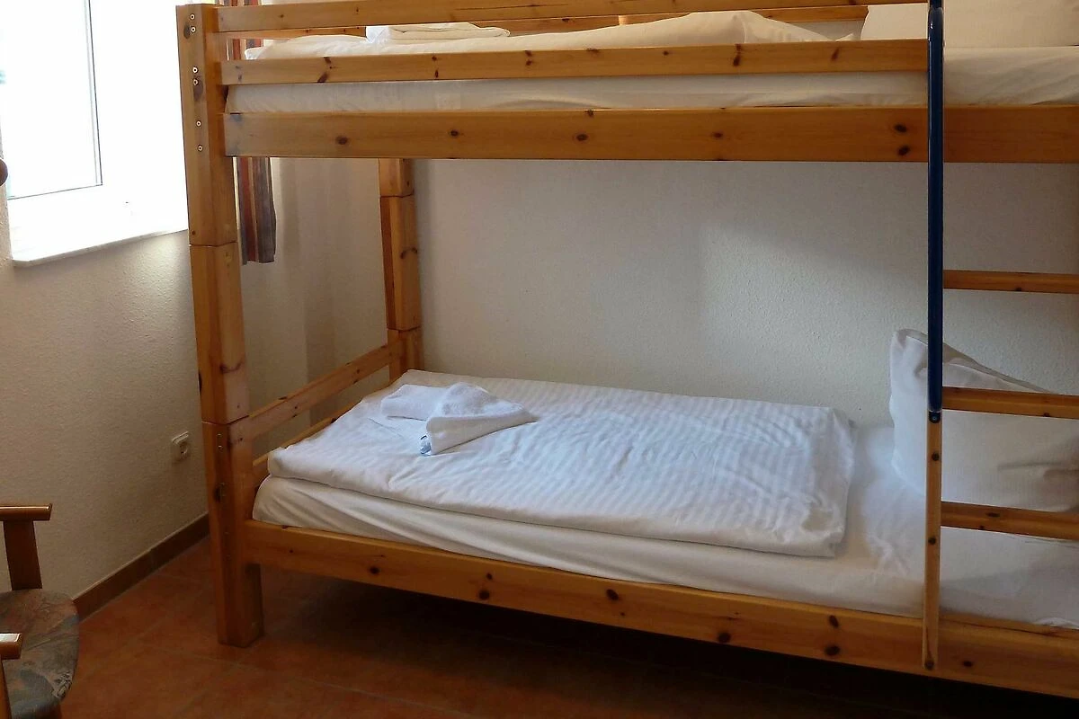 Ein Schlafraum ist mit Doppelbett, Nachtischchen und Kleiderschrank ausgestattet. Der andere Schlafraum hat ein Etagenbett und einen Schrank.
