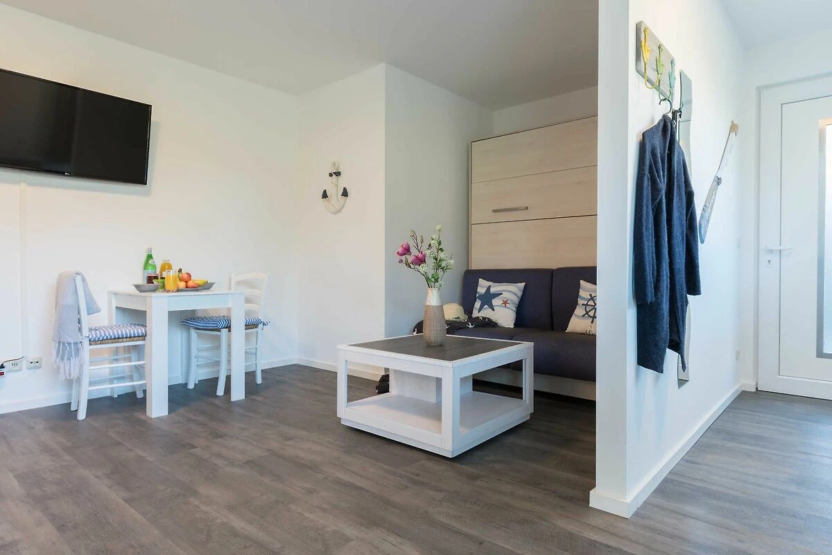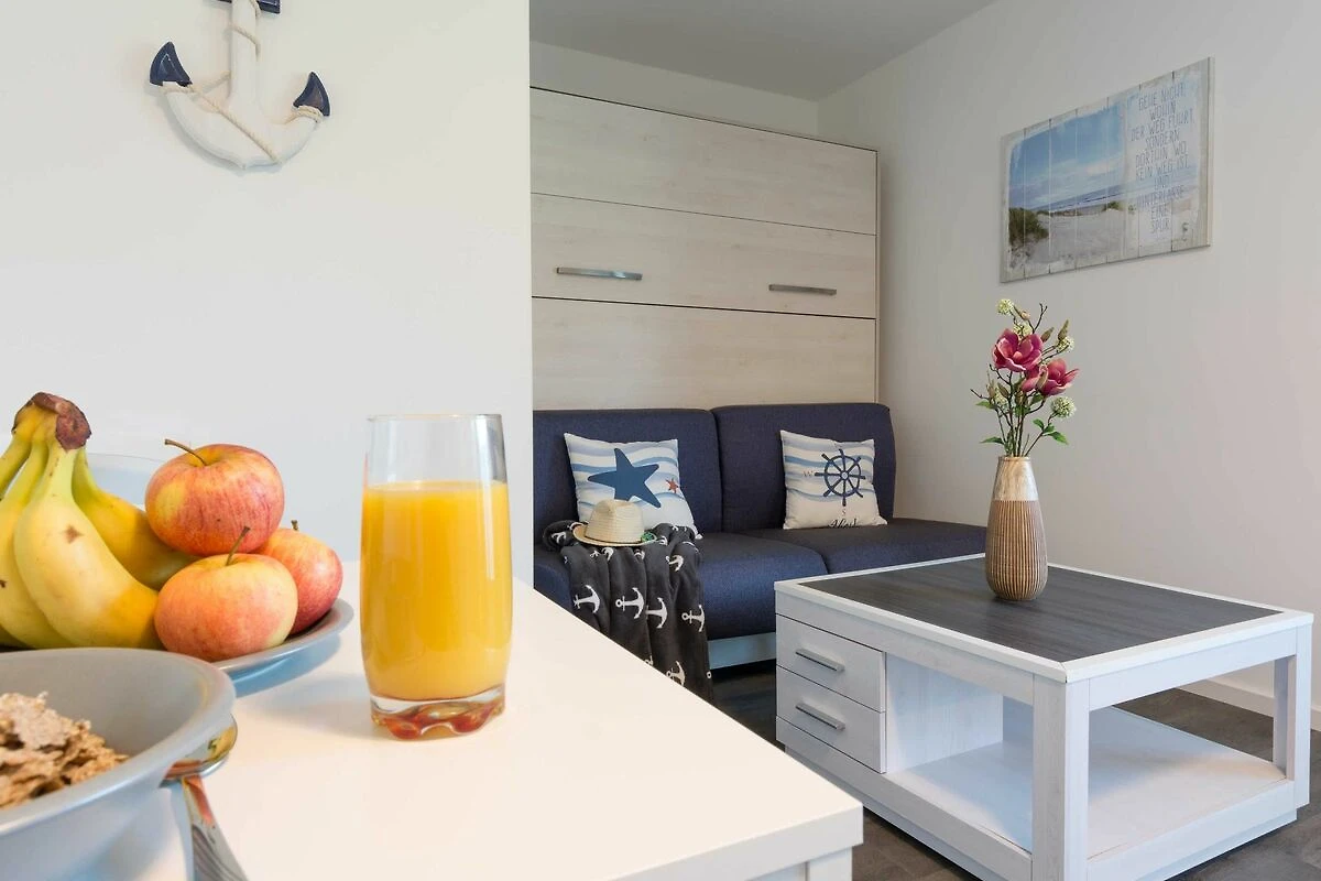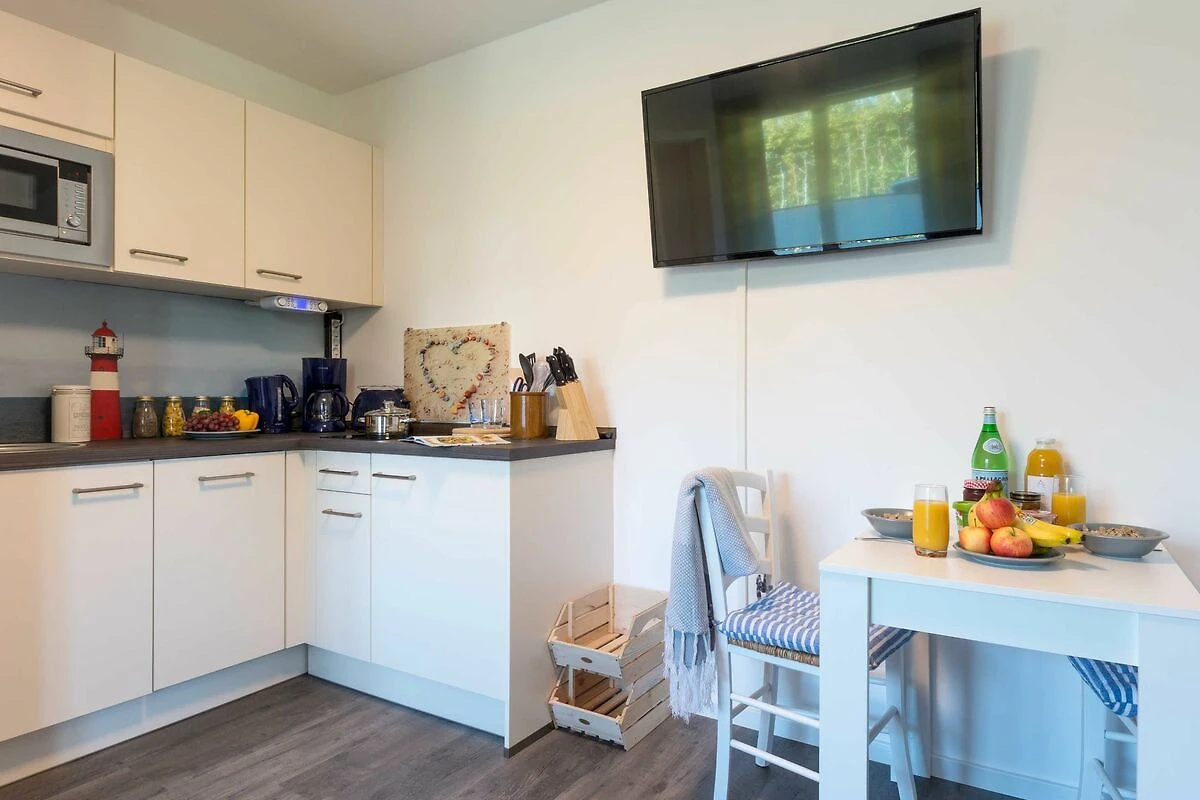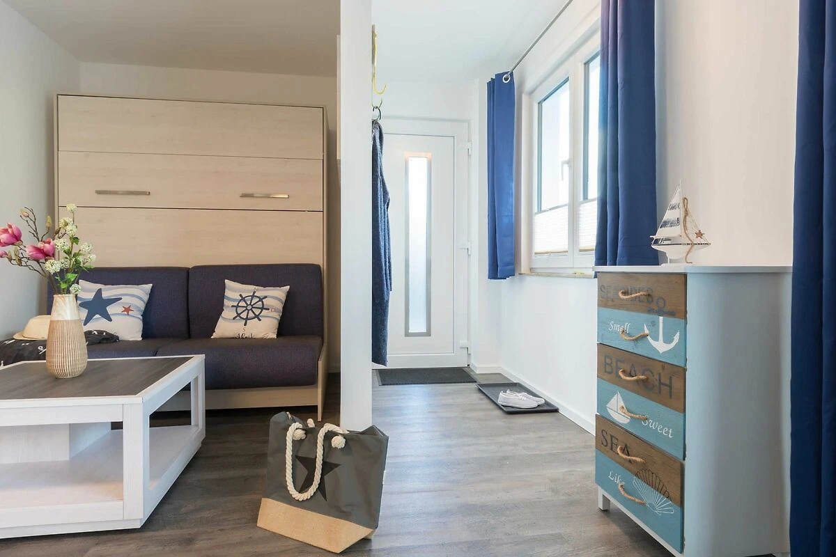 Das 2017 fertig gestellte Einraumapartment ist im maritimen Wohnstil eingerichtet und lädt in gemütlicher Atmosphäre für Zeit zu Zweit ein. Ein Wandschrank mit Sofa lässt sich mit nur einem Handgriff zum Doppelbett umfunktionieren (Liegefläche 160[nbsp] x 200cm ). In der modernen Einbauküche mit Geschirrspüler, Mikrowelle, Kühl-Gefrierkombination, Cerankochfeld, Wasserkocher, Toaster und Kaffeemaschine kann man nach Herzenslust kochen. Im grosszügigen Badezimmer befinden sich neben WC und ebenerdiger Glasdusche ein Badspiegel, ein Handtuchtrockner und ein Fön. Im Wohnbereich finden Ihre Sachen in einem grossen Kleiderschrank mit integriertem Spiegel Platz. Zum besseren Einschlafen oder für gemütliche Abende sorgen das Radio oder der wandhängende 43-Zoll Flat-TV. Das kostenfreie WLAN der Unterkunft ist ausschliesslich für die Verwendung von Social Media und den Austausch von Bildern mit Familie und Freunden gedacht. Die Nutzung zum Streamen von Filmen ist nicht vorgesehen.